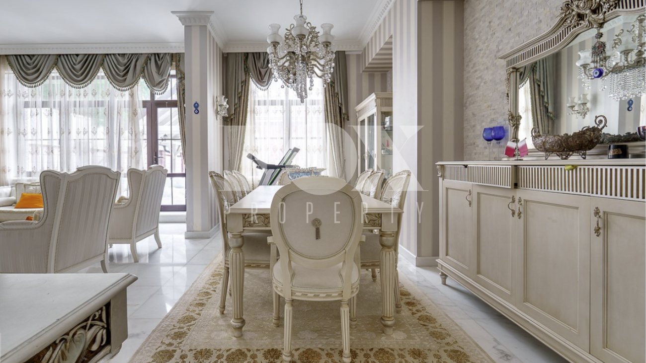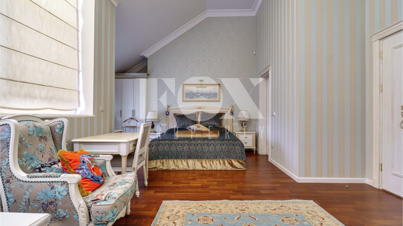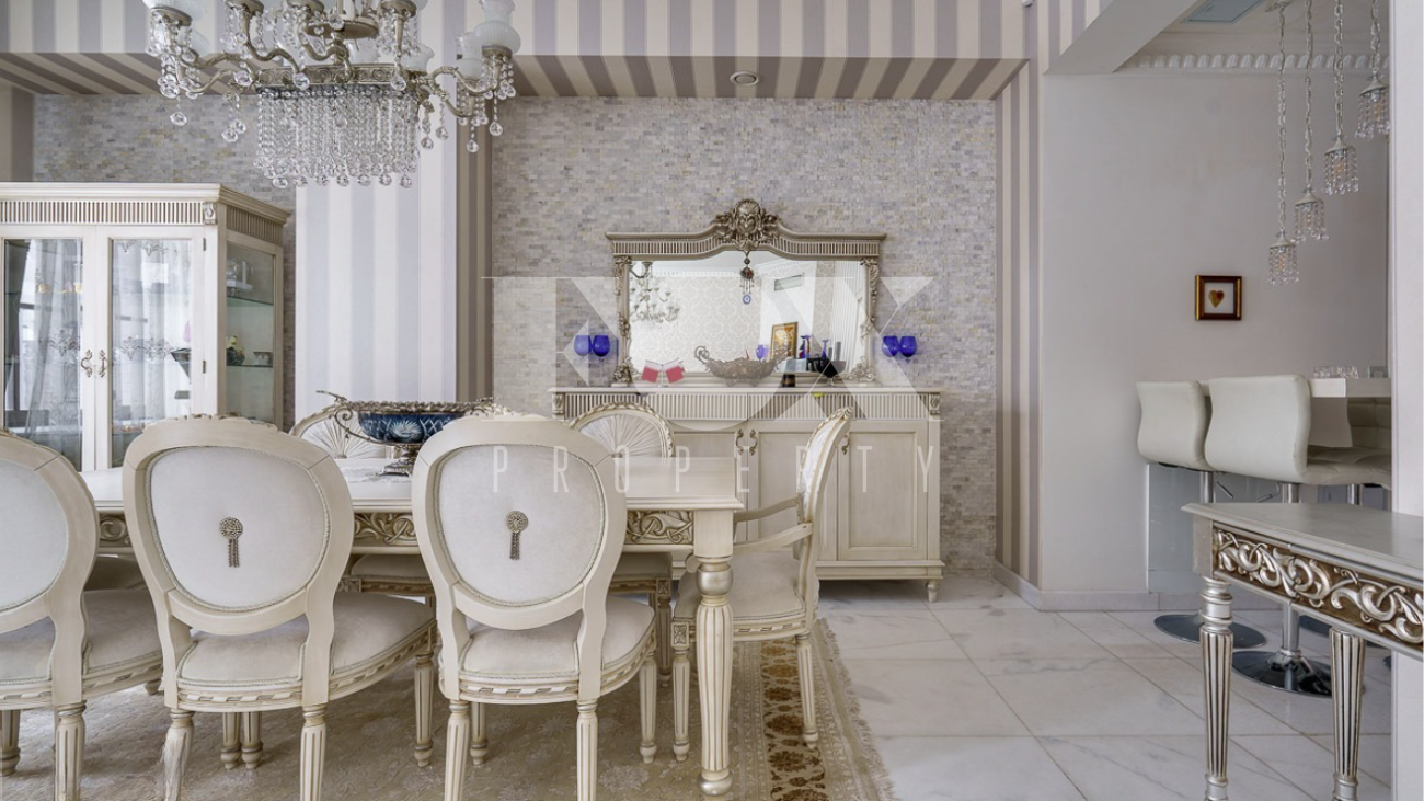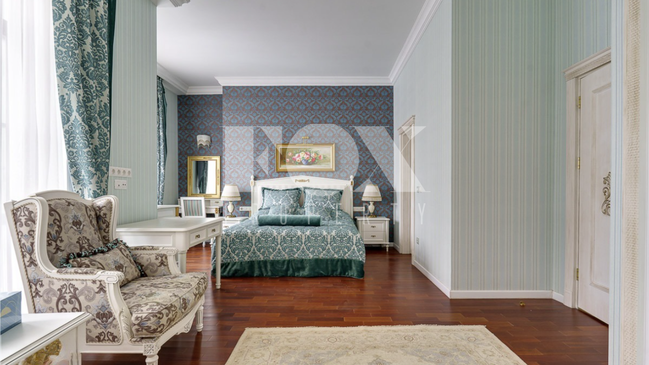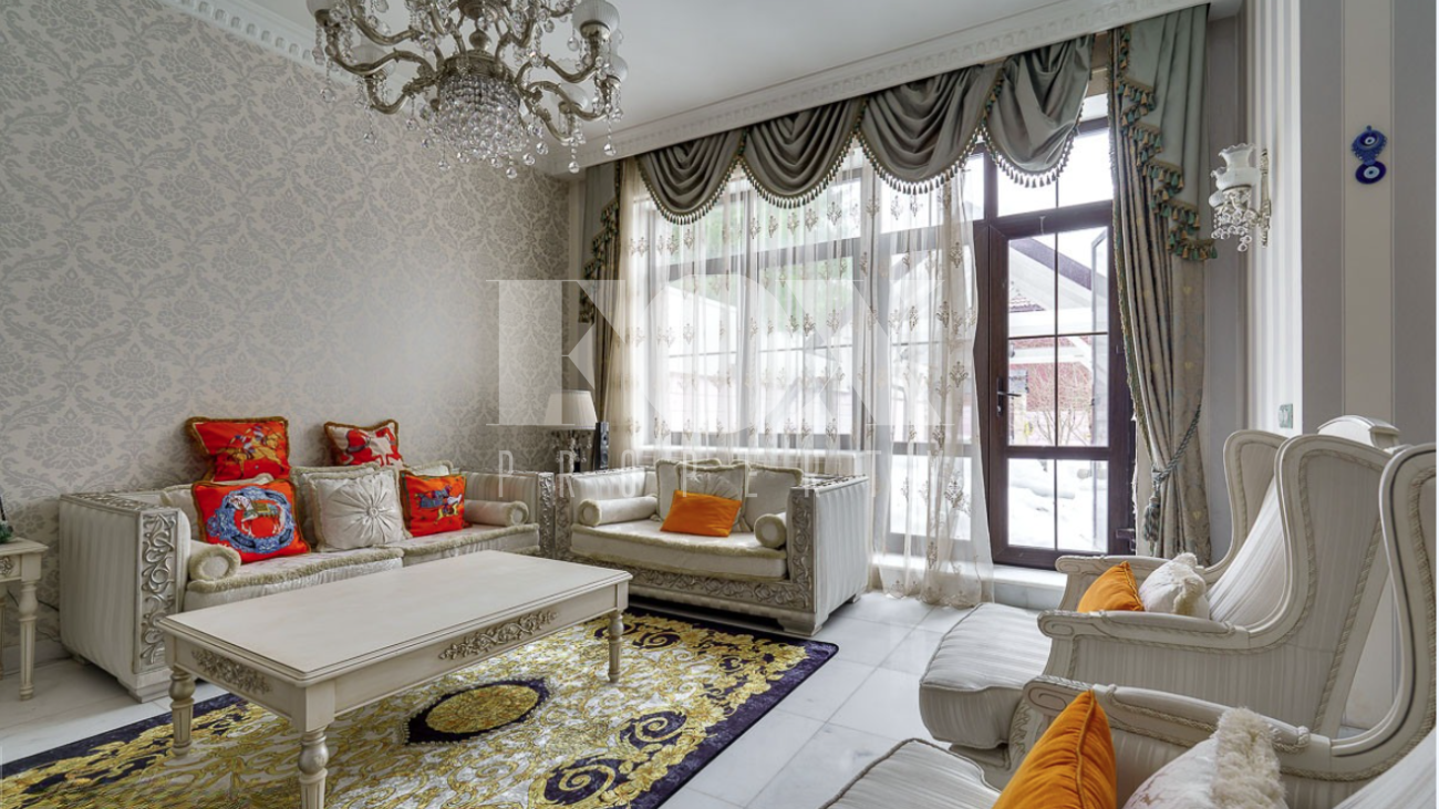 Таунхаус площадью 400 кв.м расположен на небольшом участке в коттеджном поселке "Горки-8". В таунхаусе предусмотрены: 4 спальни, 5 с/у, гостиная, кухня, столовая, сезонная гардеробная, хаммам, купель и сауна. На участке также есть 2 паковочных места и небольшая летняя беседка.