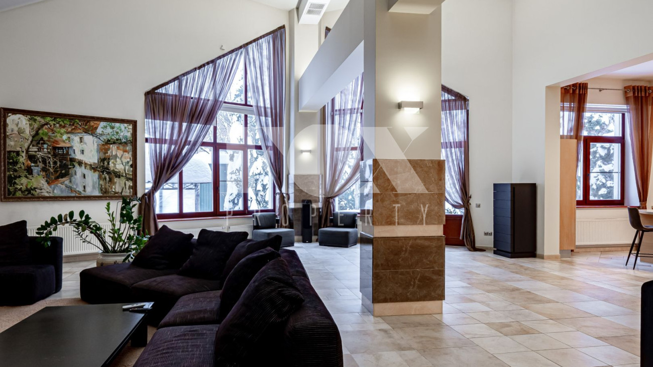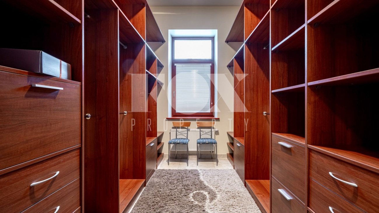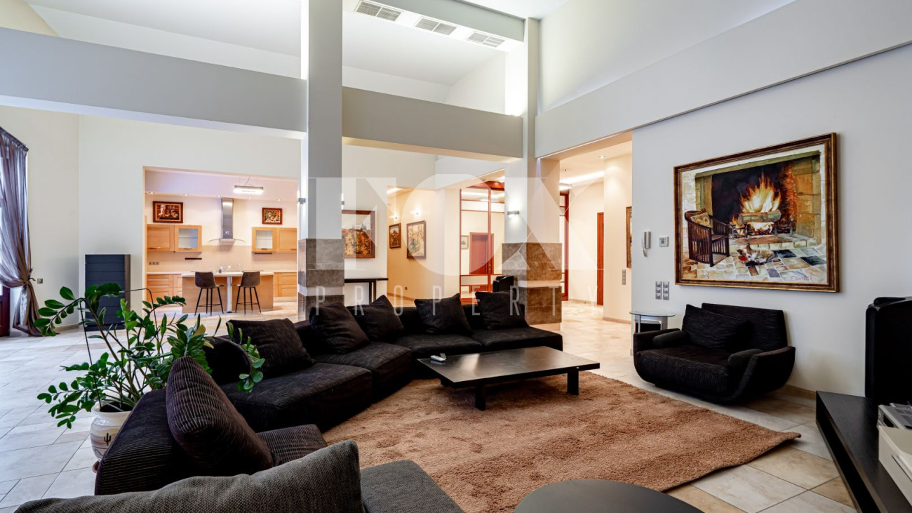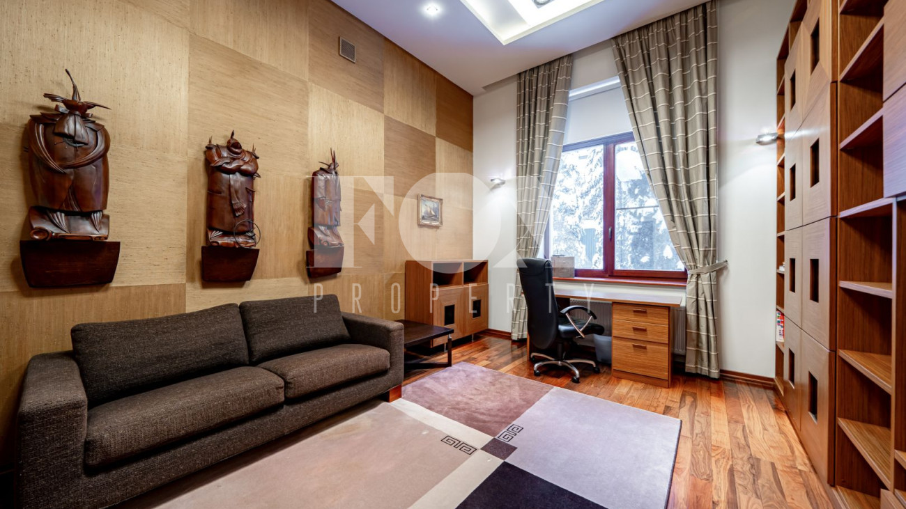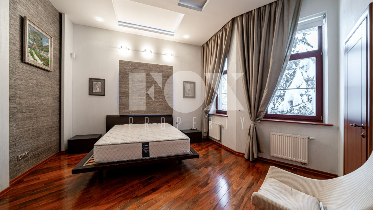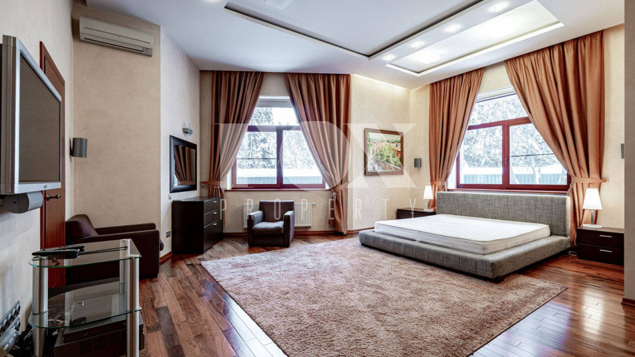 Просторная гостиная с высотой потолков более пяти метров, где разместившись на удобном диване можно наблюдать за мерцанием огня дровяного камина и слышать потрескивание дров. При каждой спальне в доме есть своя гардеробная и с/у, а для работы оборудован кабинет. Для полноценной загородной жизни имеется