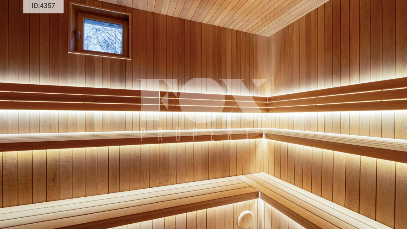 SPA-зона включает финскую сауну с дровяной печью Kastor, санузел с двумя душевыми и комнату отдыха с выходом на участок. Фитнес-зона интегрирована в пространство первого этажа и рассчитана на полноценные тренировки.