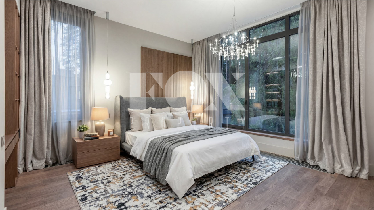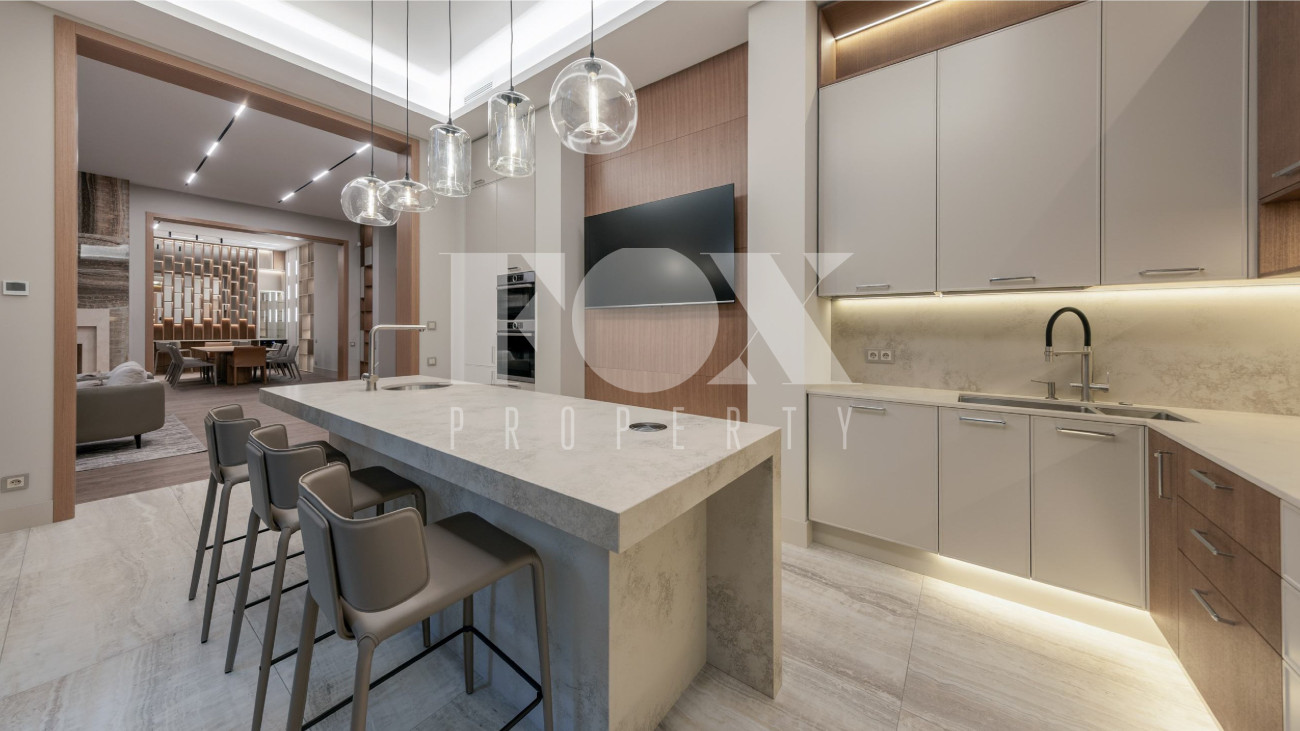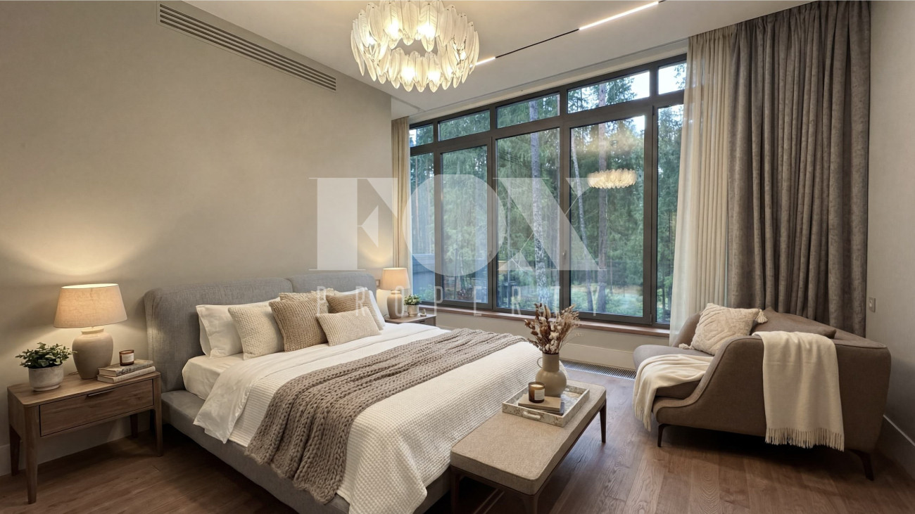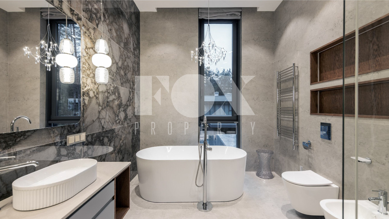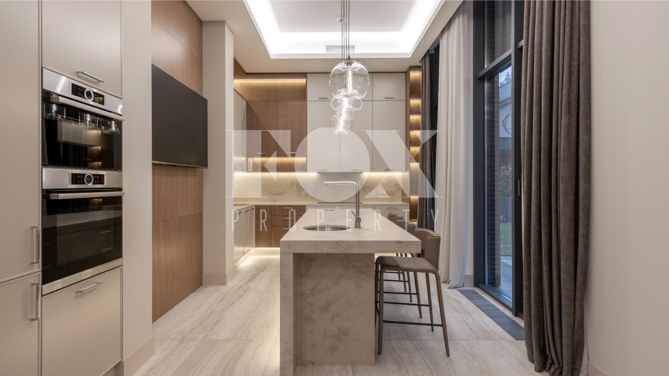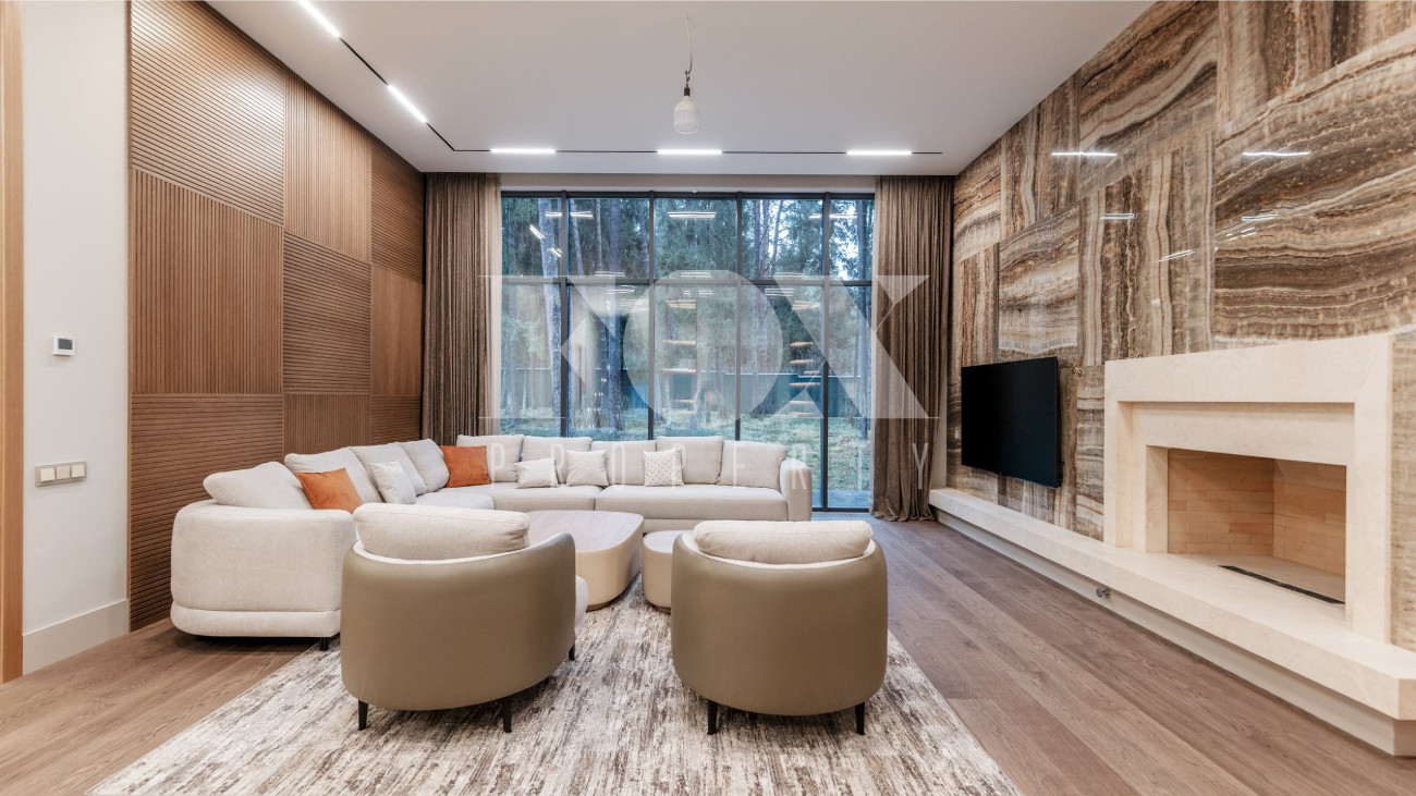 Новый современный загородный дом общей площадью 400 м2 построен на лесном участке 23 сотки в КП "Маслово Парк", расположенного на территории уникального природного резервата "Масловская лесная дача". Органическая архитектура коттеджа позволила комфортно и эргономично зонировать личные и общественные пространства, раскрывая неповторимые виды на вековой лес сквозь панорамное остекление. На 1-ом этаже размещены: гостиная с дровяным камином, столовая зона с полноценным баром и выходом на крытую террасу, функциональная кухня с островом, а также кабинет, гардеробная и постирочная. На 2-ом этаже размещены 2 мастер-блока спален со своими санузлами и гардеробными, а также детский блок из 2-х спален и ванной комнаты. Также предусмотрен выход на эксплуатируемую кровлю. Высота потолков 3.5 метра, центральное кондиционирование. На участке выполнен ландшафтный дизайн, засеян газон, дорожки вымощены брусчаткой, а на заднем дворе благоустроен естественный лесной ландшафт. При въезде дополнительно предусмотрен навес для 2-х автомобилей.