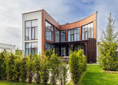 Современный проект общей площадью 645 кв.м на лесном участке 18 соток расположен в 28 км от МКАД по Рублево-Успенскому шоссе и в 25 км по Новорижскому шоссе в КП Маслово парк.