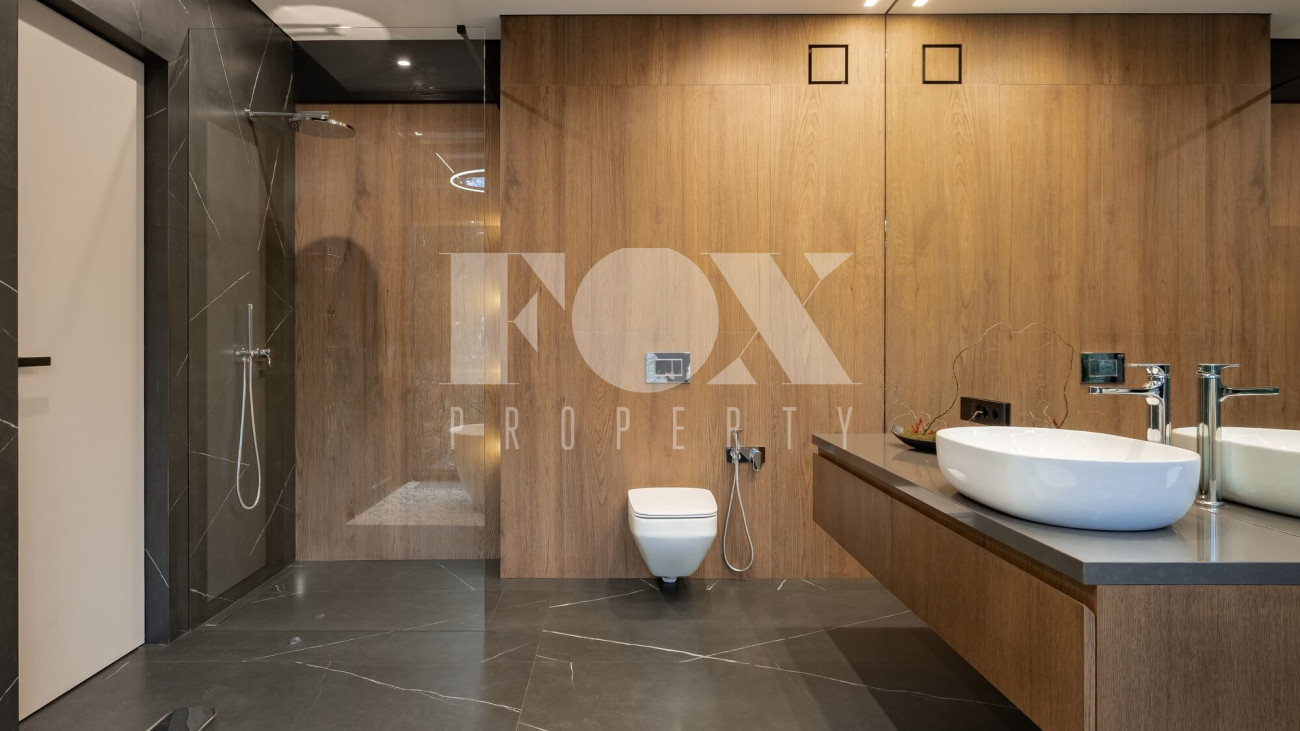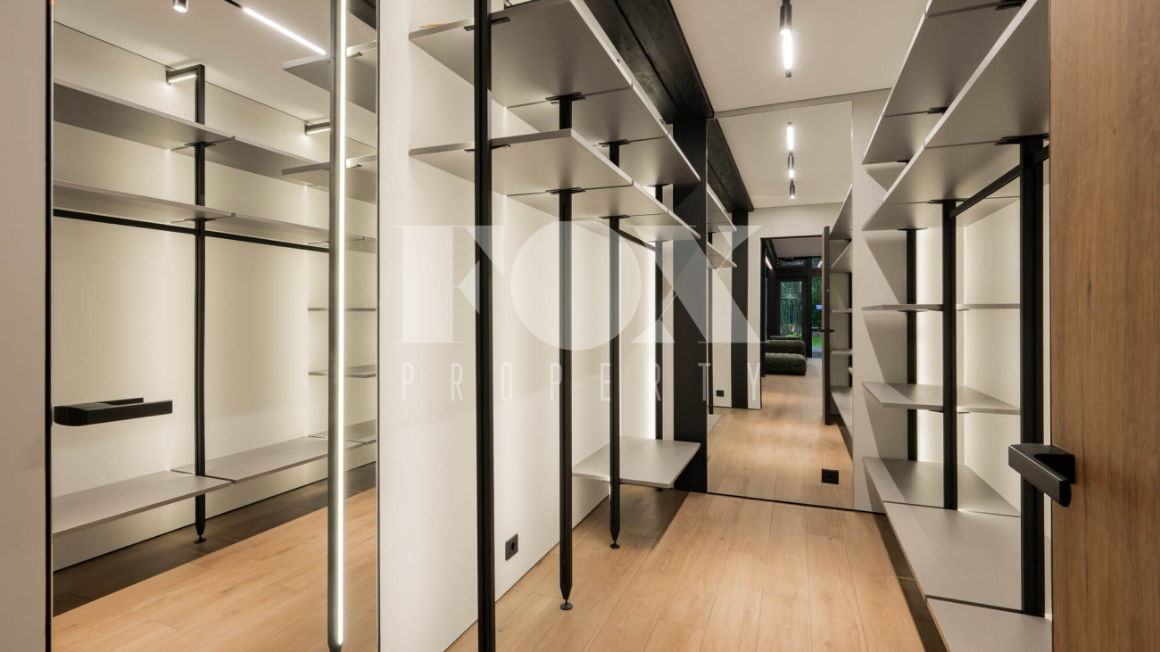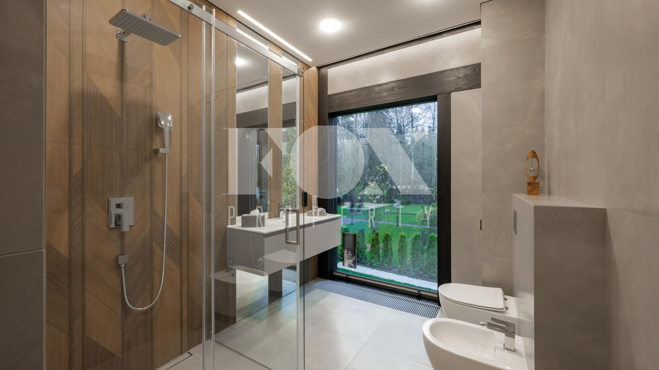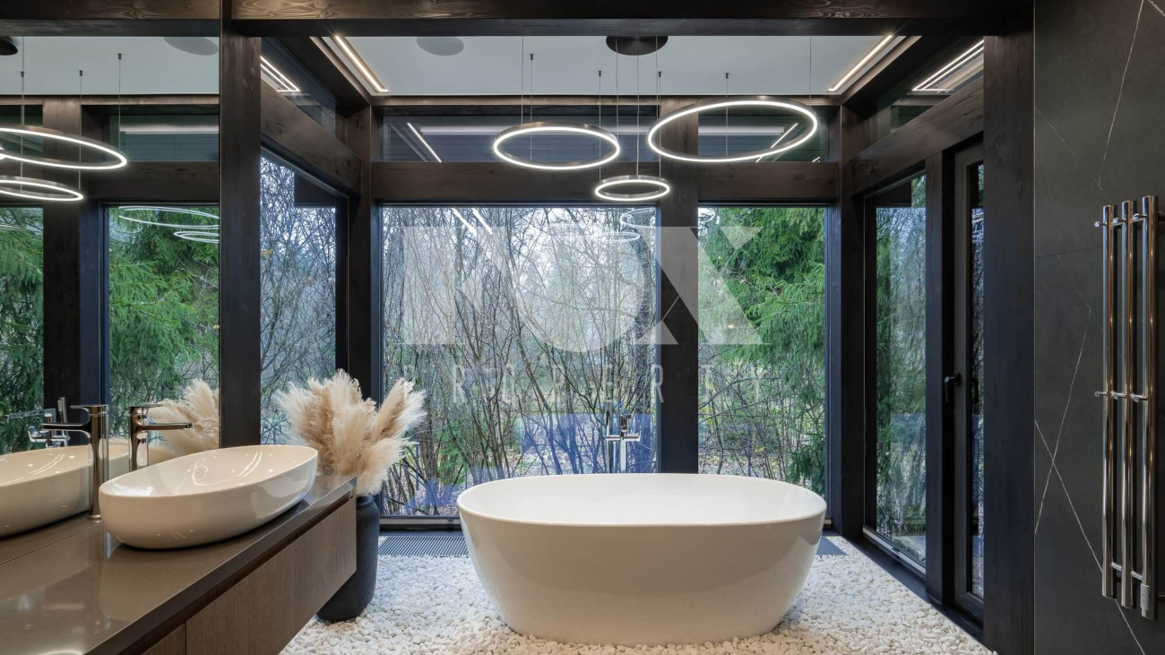 Потрясающие виды из всех комнат на окружающий ландшафт. Тактичная подсветка растений и деревьев по периметру участка вечером раздвигает границы и дополняет уют. В мастер ванной встроенная музыкальная система и отдельно стоящая на дренируемой мраморной гальке ванна оставляют незабываемые впечатления от водных процедур.