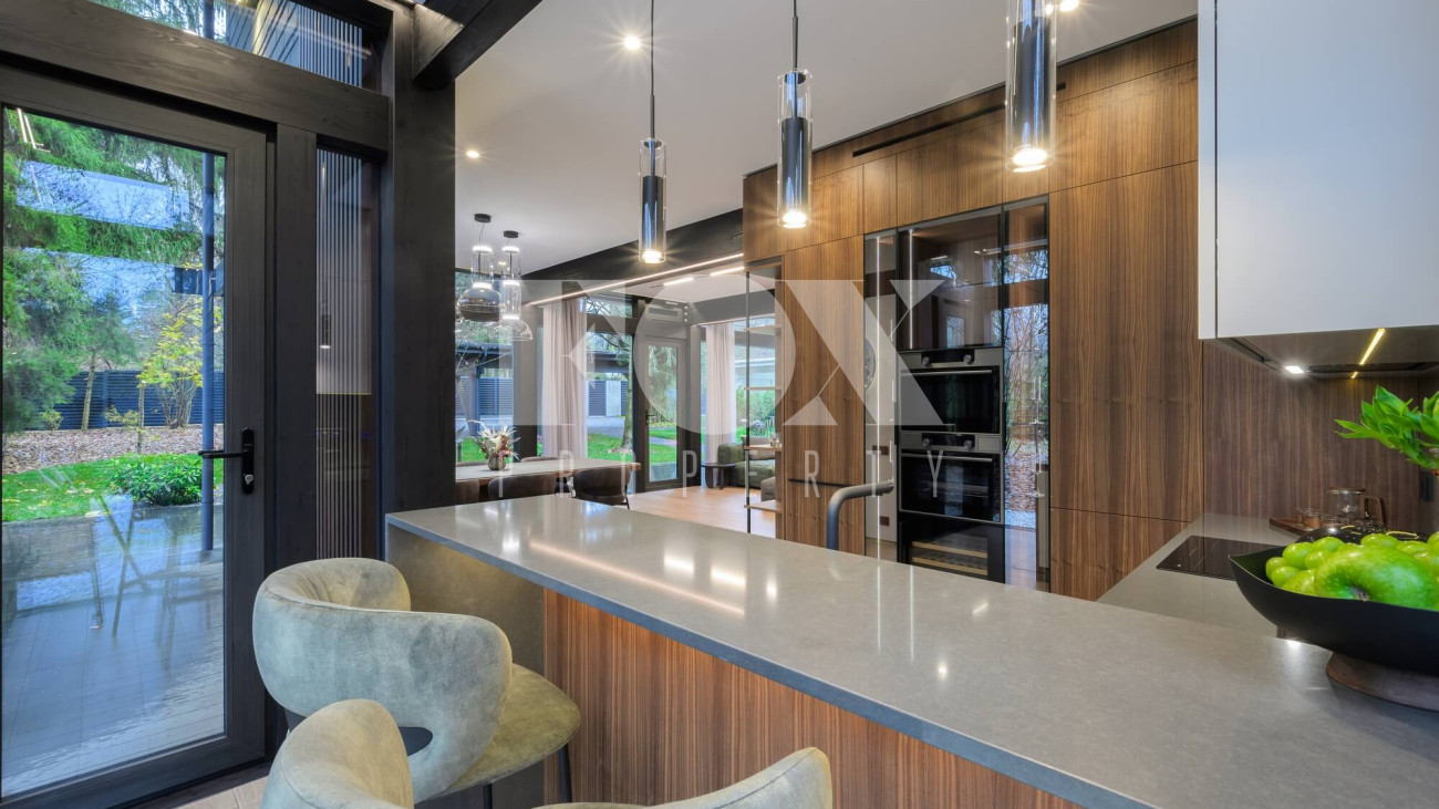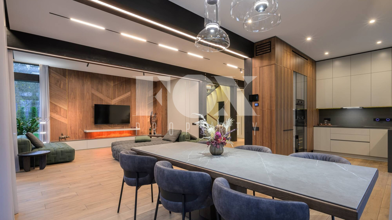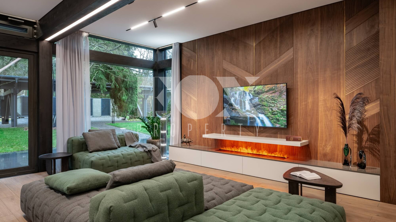 В большой гостиной барная стойка для завтраков, обеденный стол на 8 персон, современный дизайнерский диван от Boca room на котором одинаково удобно общаться с друзьями, смотреть телевизор или любоваться игрой света парового камина. Вся мебель дома в натуральном шпоне ценных пород дерева, практичные столешницы из кварцевого агломерата и крупноформатного керамогранита заметно упрощают жизнь хозяевам. Как оборудование и современные инженерные системы проверенных брендов. Приточная вентиляция с фильтром, канальным кондиционирование и увлажнением не помешала установке в каждой комнате фрамуг с дистанционным открыванием (что позволяет наслаждаться пением птиц и в комнате).