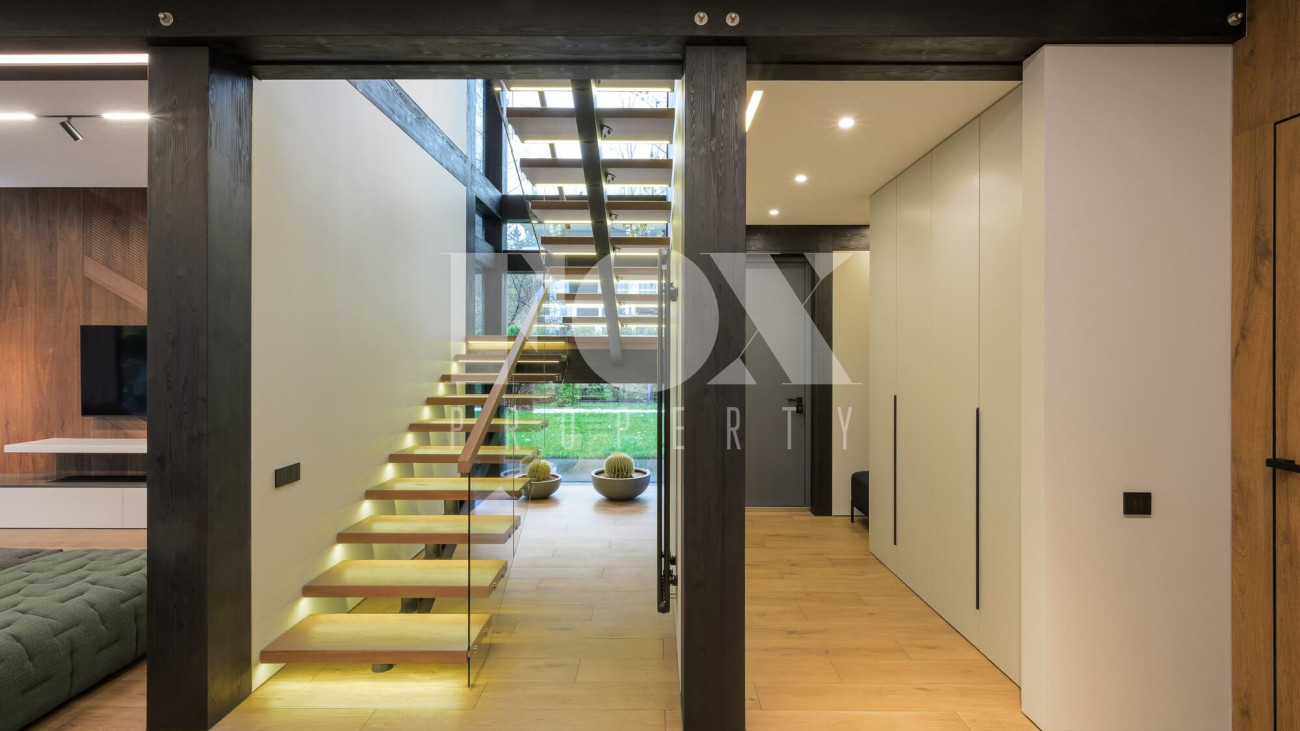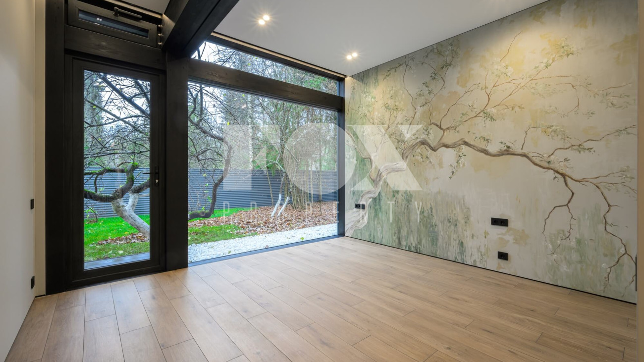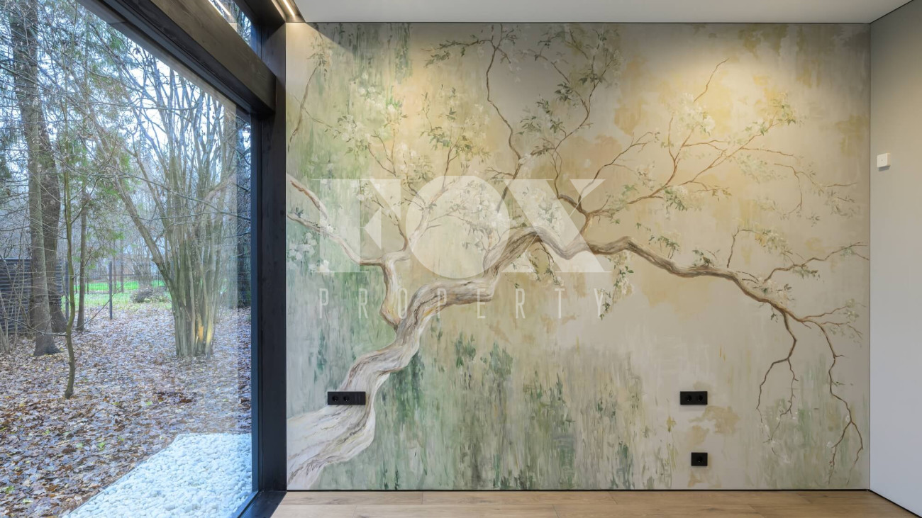 Особенности проекта: стеклянные стены от пола до потолка, потрясающие виды на собственный сад, высокие потолки, высококачественная отделка, эксклюзивное цветовое решение стен, природно-парковый дизайн с использованием инсталляций из кортена с подсветкой, авторская роспись стены с плодоносящей яблоней за стеклянной стеной, монолитное межэтажное перекрытие и как следствие - отсутствие «торчащих» батарей и межкомнатные стены из пазогребневых блоков.