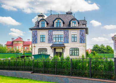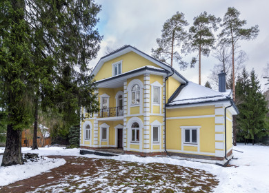 Дом площадью 425 кв.м на лесном участке 15 соток в старой части поселка на тупиковой улице. На участке выполнены ландшафтные работы: высажены крупномеры, декоративные деревья, разбит пруд с фонтаном, вымощены дорожки, установлено освещение. Отдельно на участке расположена беседка и зона барбекю, организован декоративный пруд с фонтаном. К дому примыкает гараж на 2 м/м