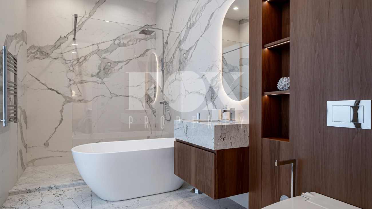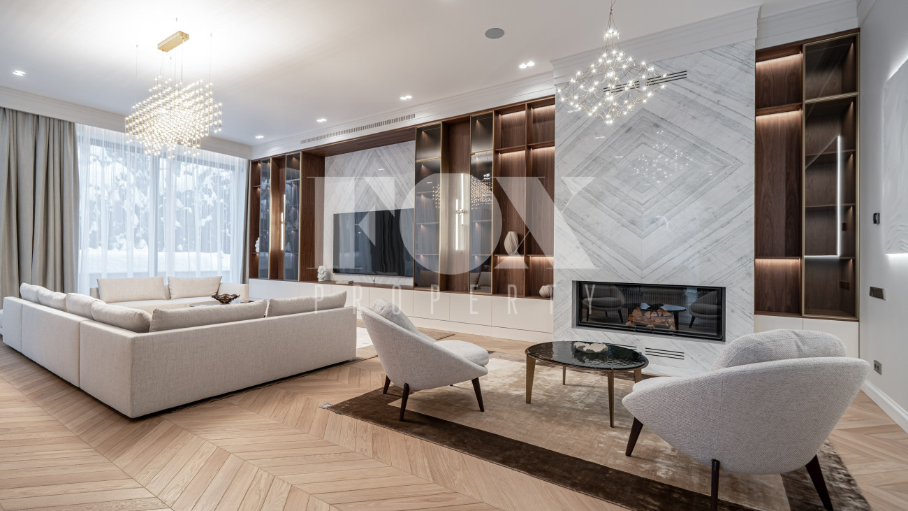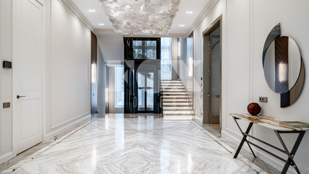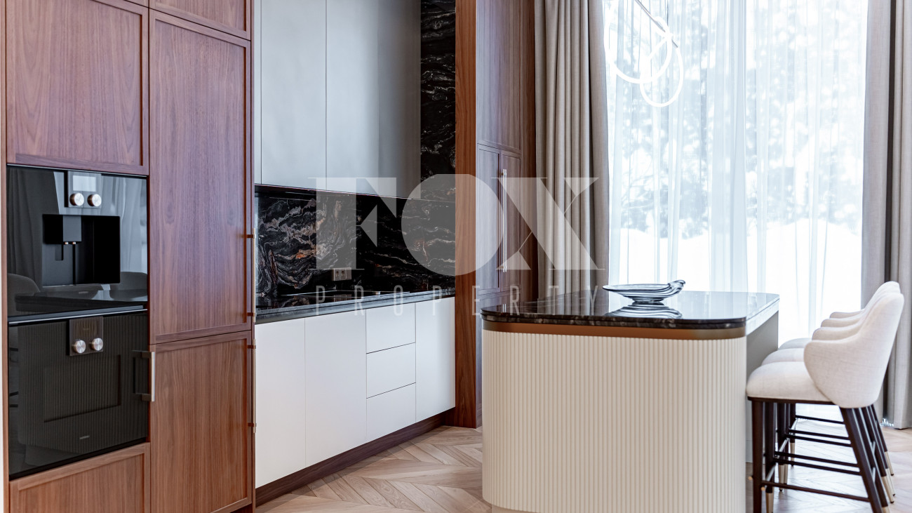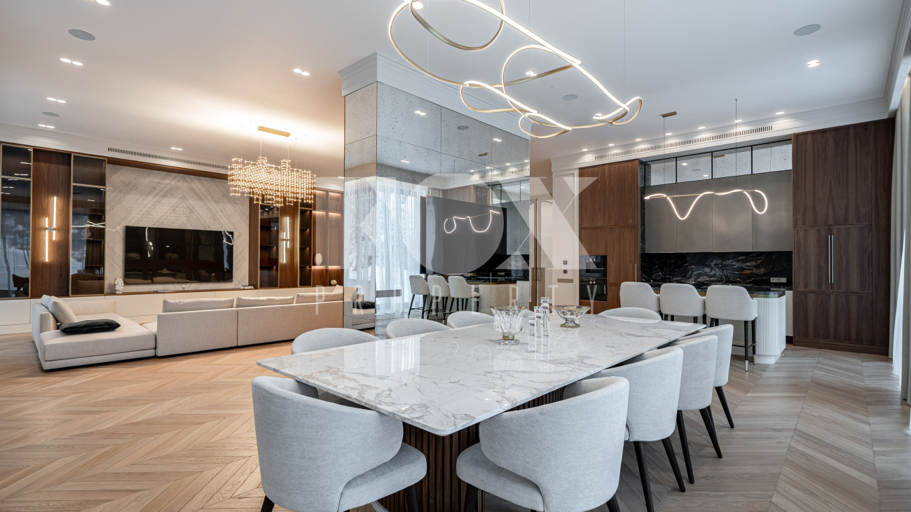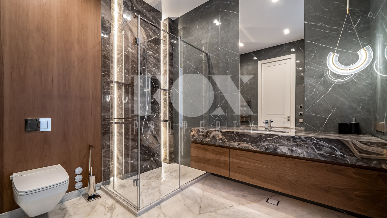 В отделке использовались высоко качественные натуральные материалы, мрамор, дерево, мебель известных Итальянских брендов: Minotti, Paltrona Frau, Poliform, Porada.