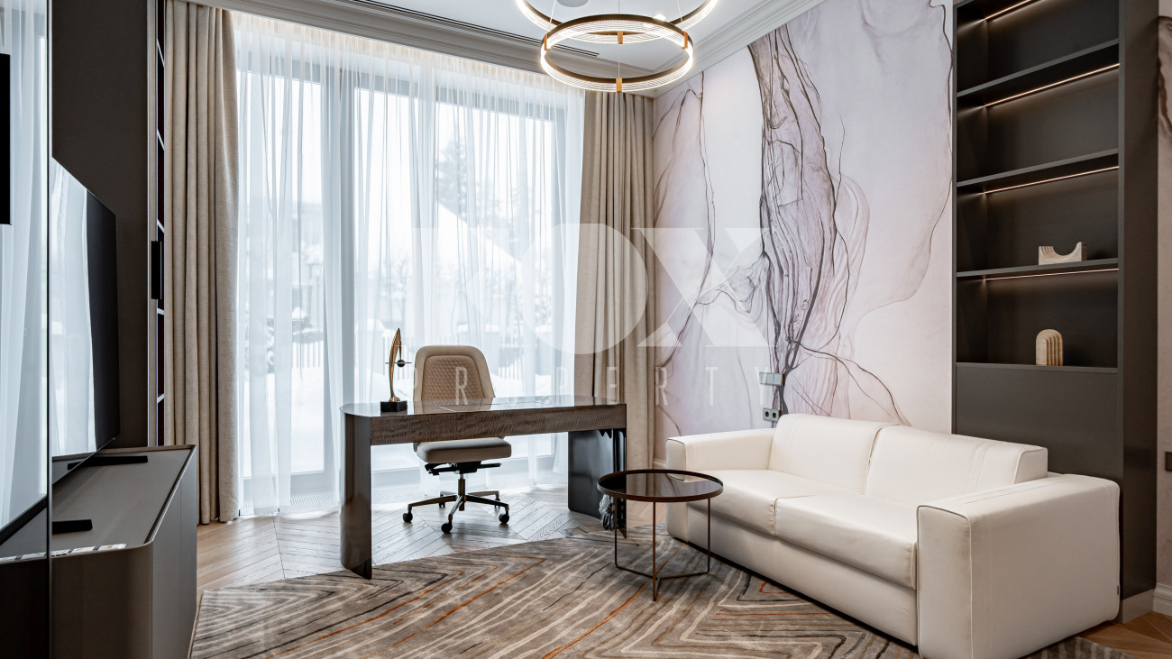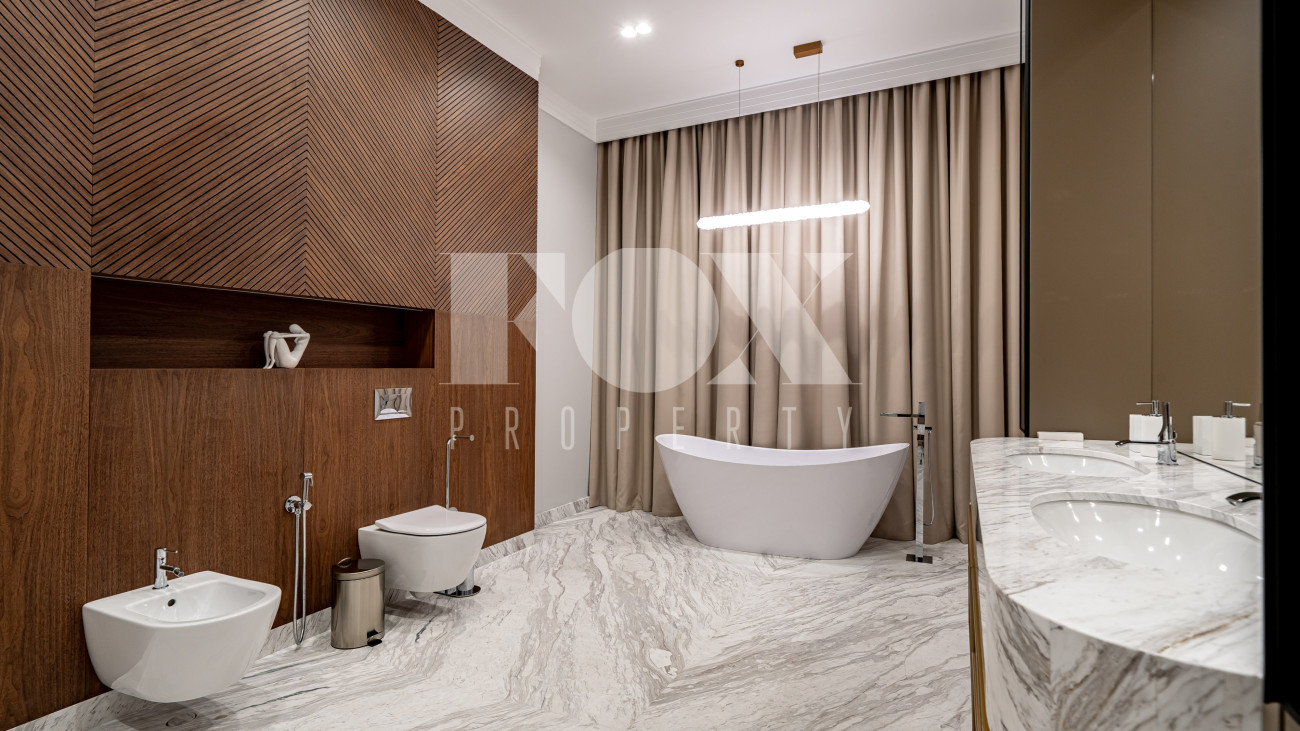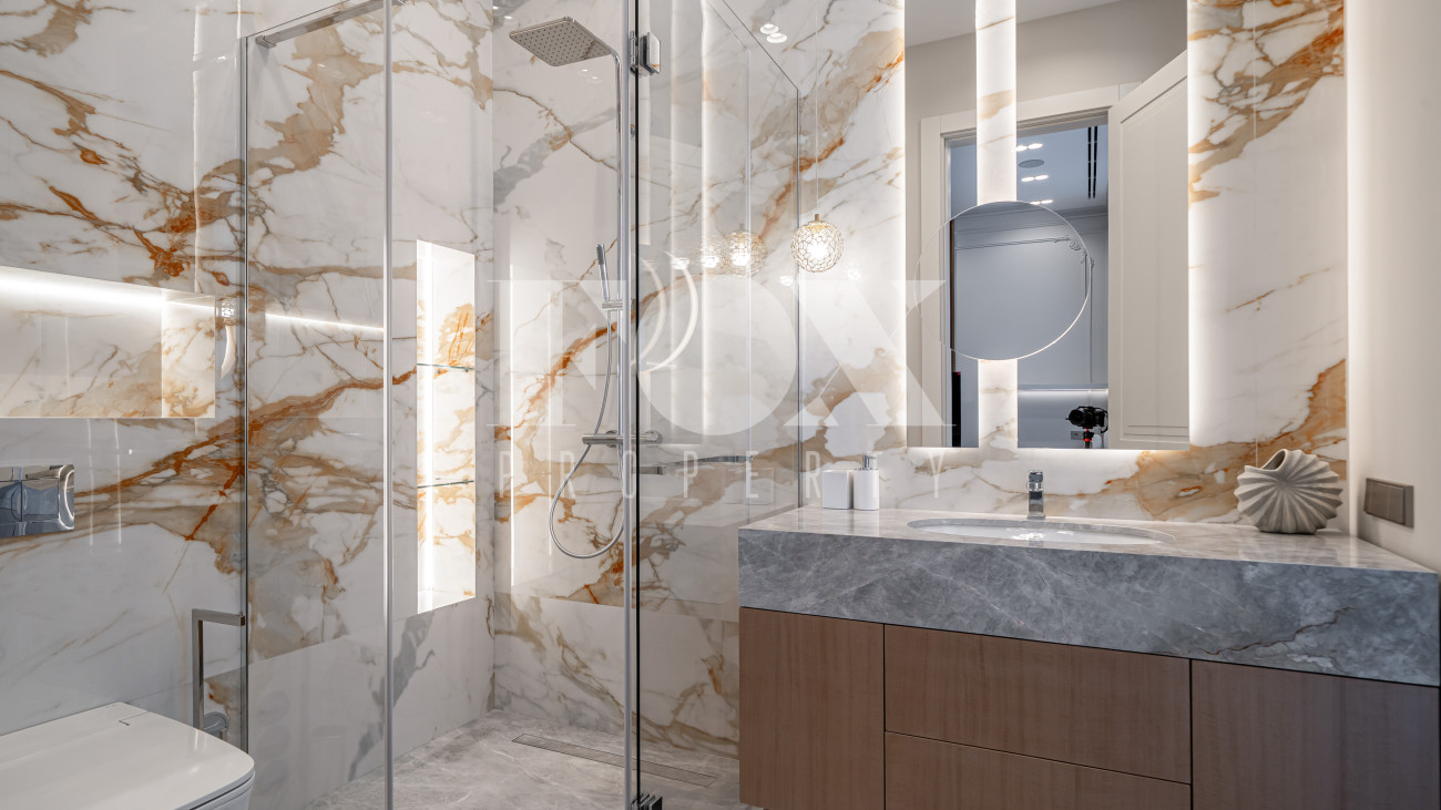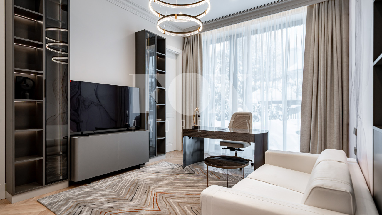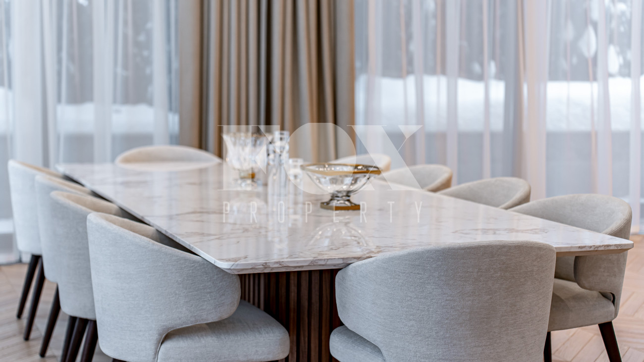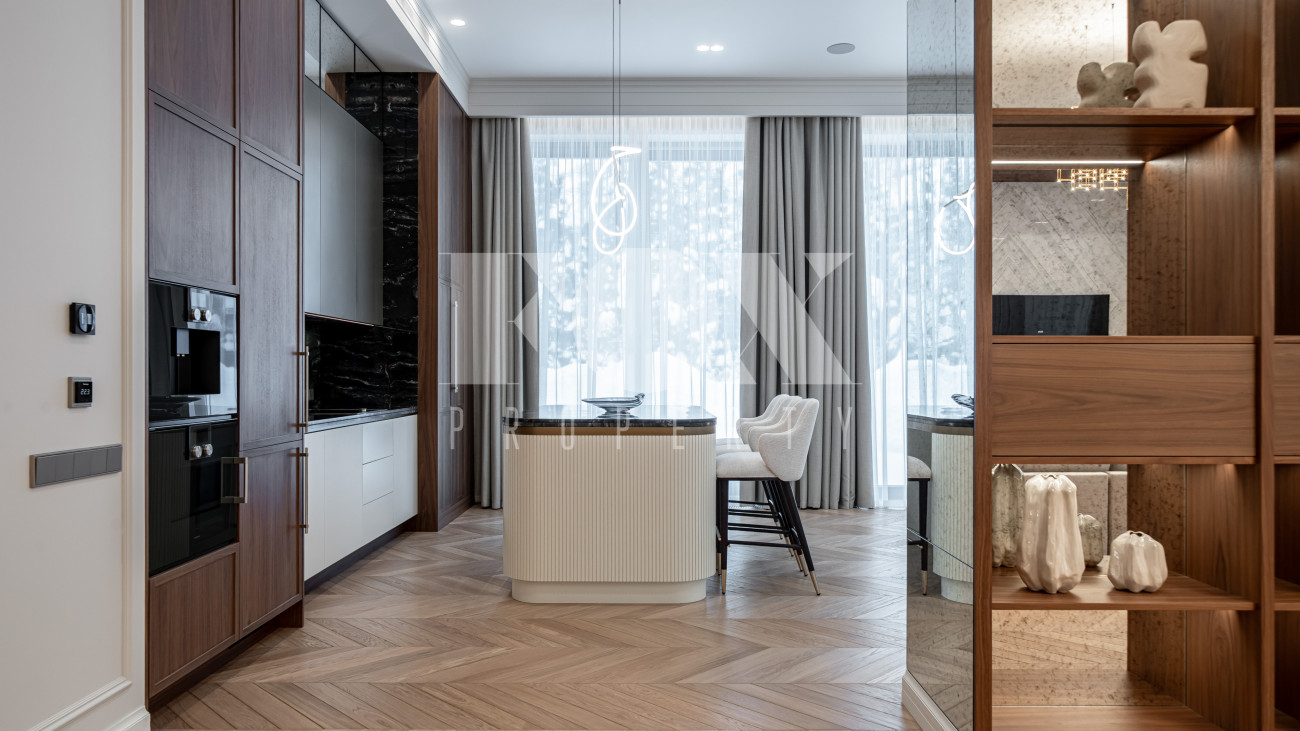 В отделке использовались высоко качественные натуральные материалы, мрамор, дерево, мебель известных Итальянских брендов: Minotti, Paltrona Frau, Poliform, Porada.