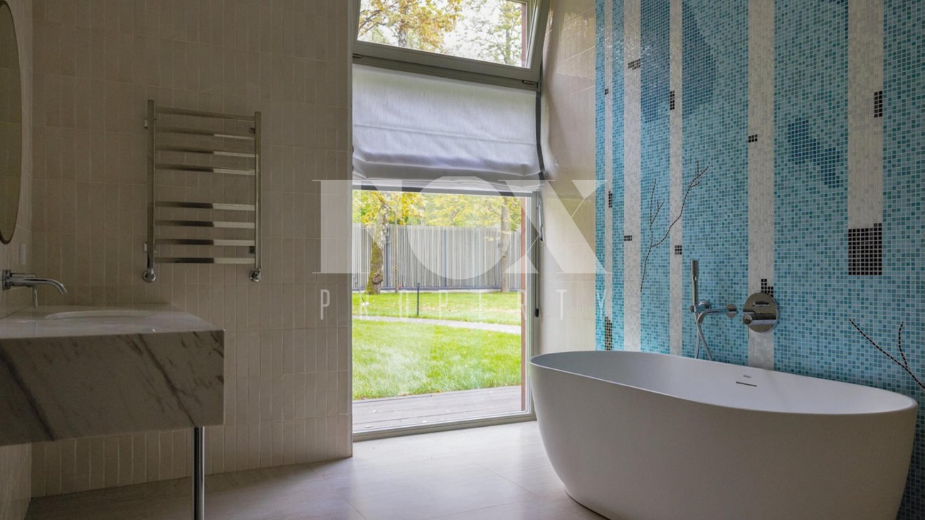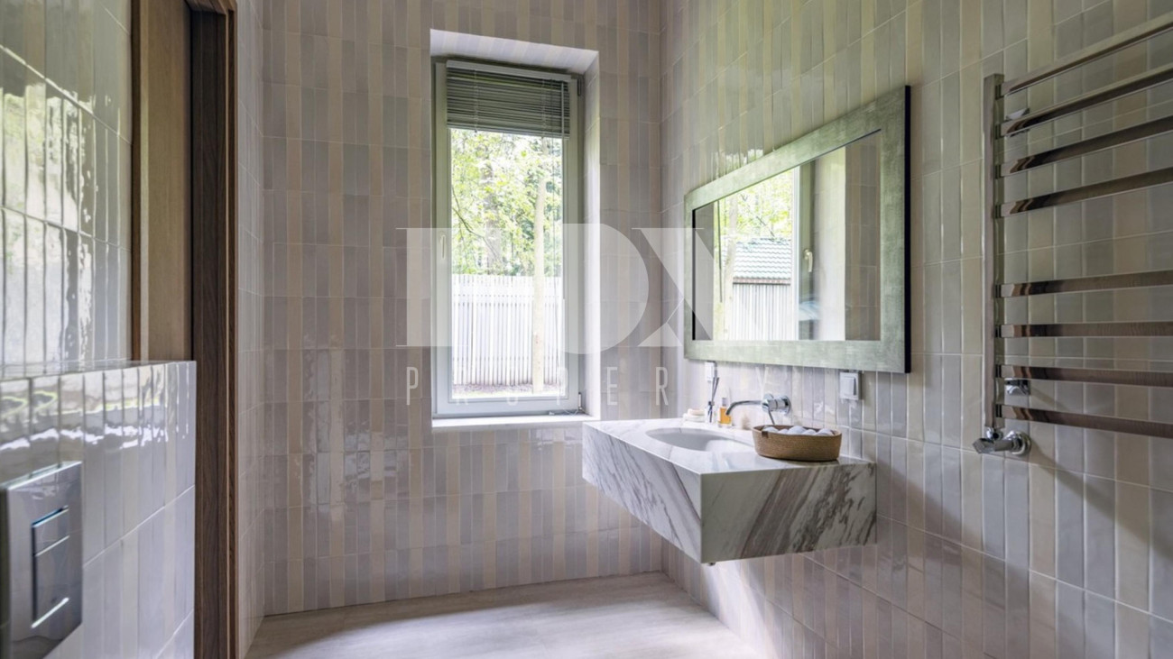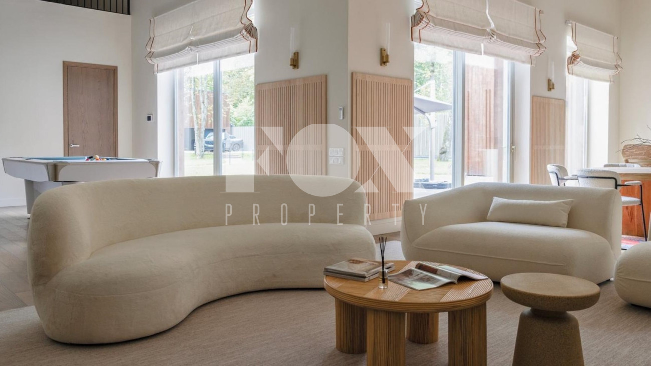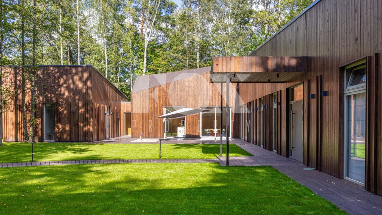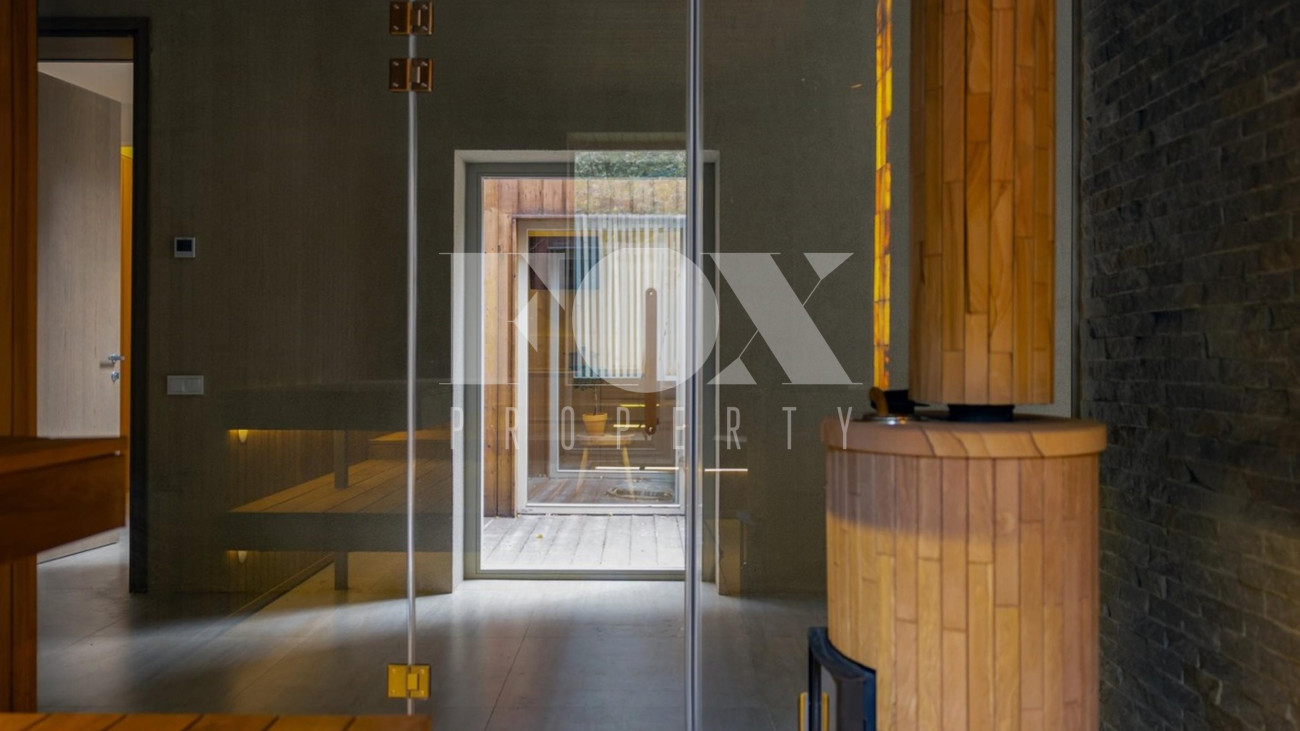 Одноэтажный дом с высокими потолками. Академический закрытый поселок с охраной на 1-Успенском шоссе. 25 соток. Дом 550 кв. м. Выполнен по архитектурному проекту с учетом сторон света и траектории движения солнца по часам. Каменный. Фасад отделан термодоской и терморейкой. Разделен на две части - приватный блок с 5 спальнями и общий блок, состоящий из кабинета, кухни-гостиной и технической кухни. Выдающийся коридор-галерея. Высота потолка в коньке до 7 метров. Спа зона с хаммамом, дровяной парной и джакузи с комнатой отдыха. Деревянные стеклопакеты с раздвижными порталами. Шторы на электроприводах. Система приточно-вытяжной вентиляции и кондиционирования, управляемая с телефона. Системы видеонаблюдения. На участке лесные деревья, газон. Подсветка дорожек, фасада и забора. Парковка на 3 мм, гараж на 2 мм, блок для персонала отдельным строением с двумя комнатами, санузлом и кухней. Минимальные поселковые платежи. Идеальная локация.