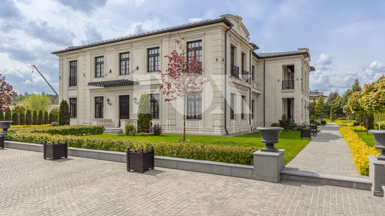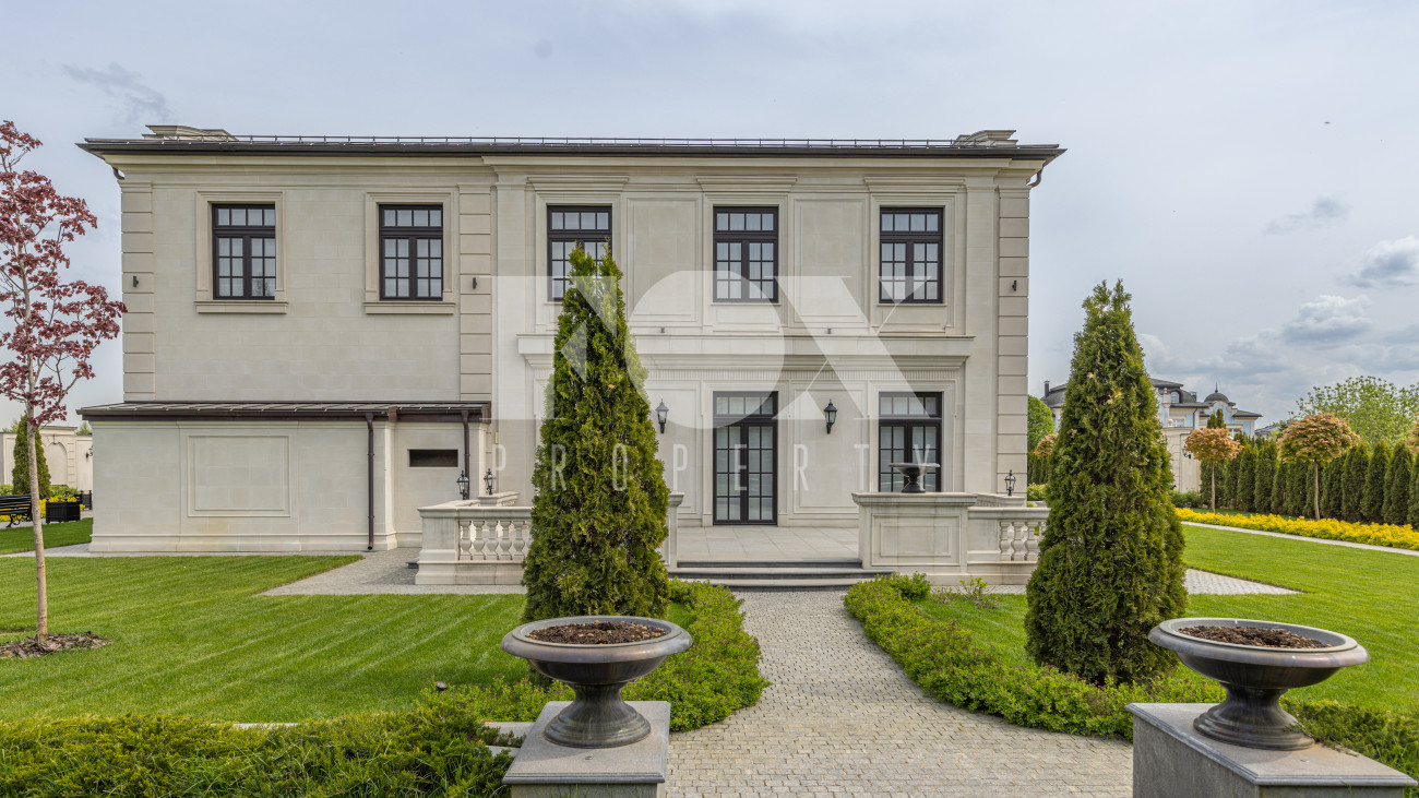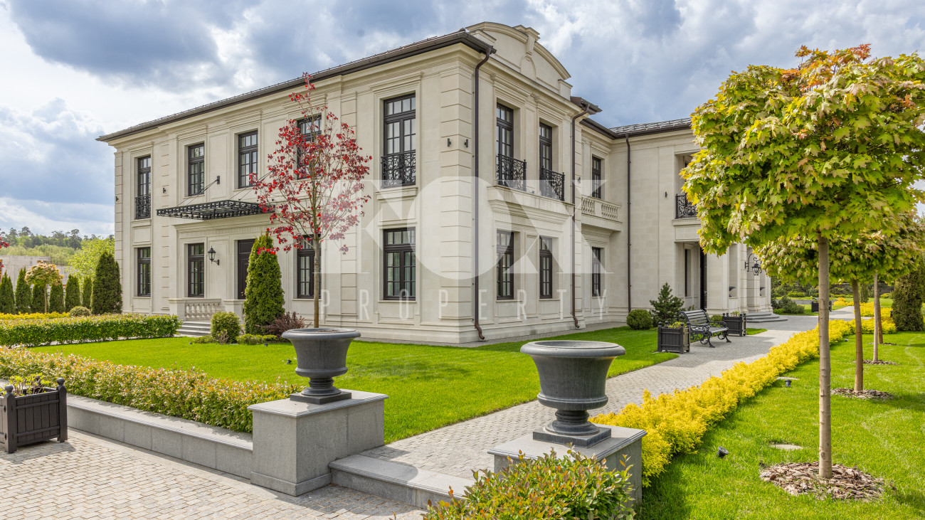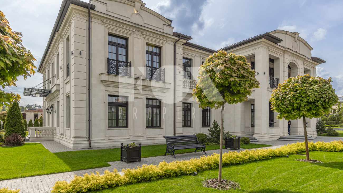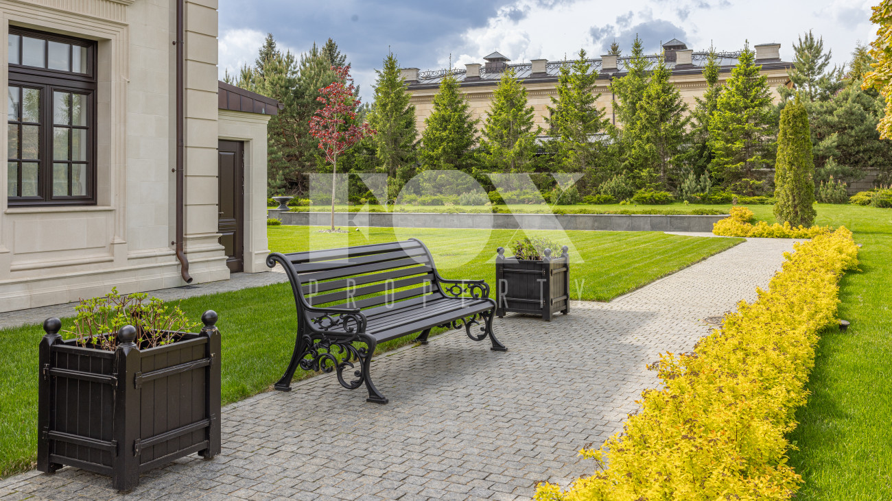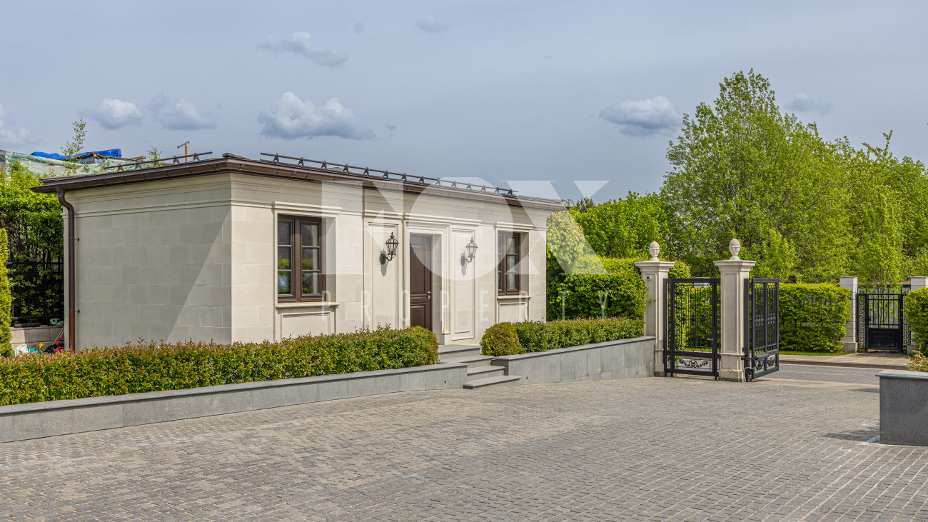 Дом в стиле английской классики с бассейном на ландшафтном парковом участке. Мебель и предметы интерьера ведущих мировых производителей. Отдельно расположены гараж на 3 м/м с квартирой для персонала и дом охраны. На участке проведены ландшафтные работы: высажен газон, посажены деревья, вымощена брусчатка, выполнено ландшафтное освещение.