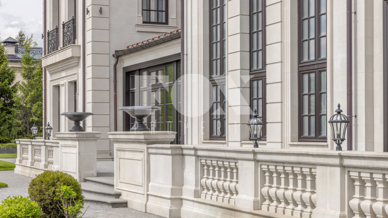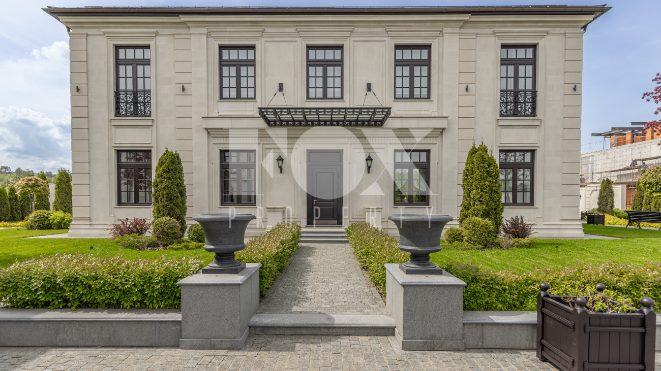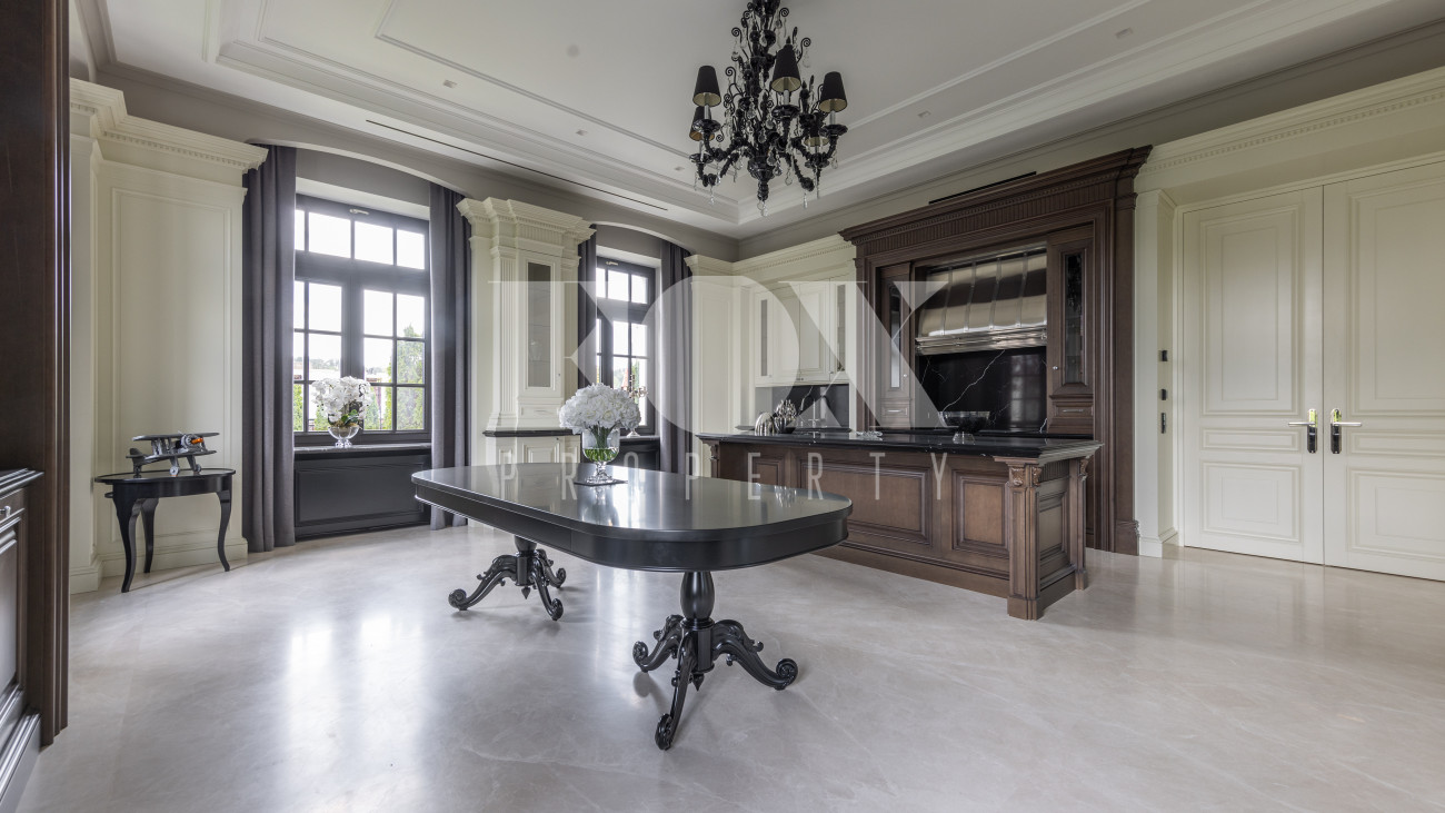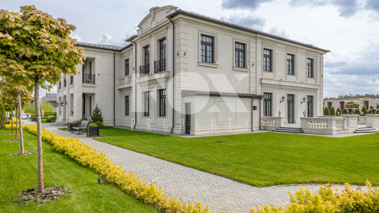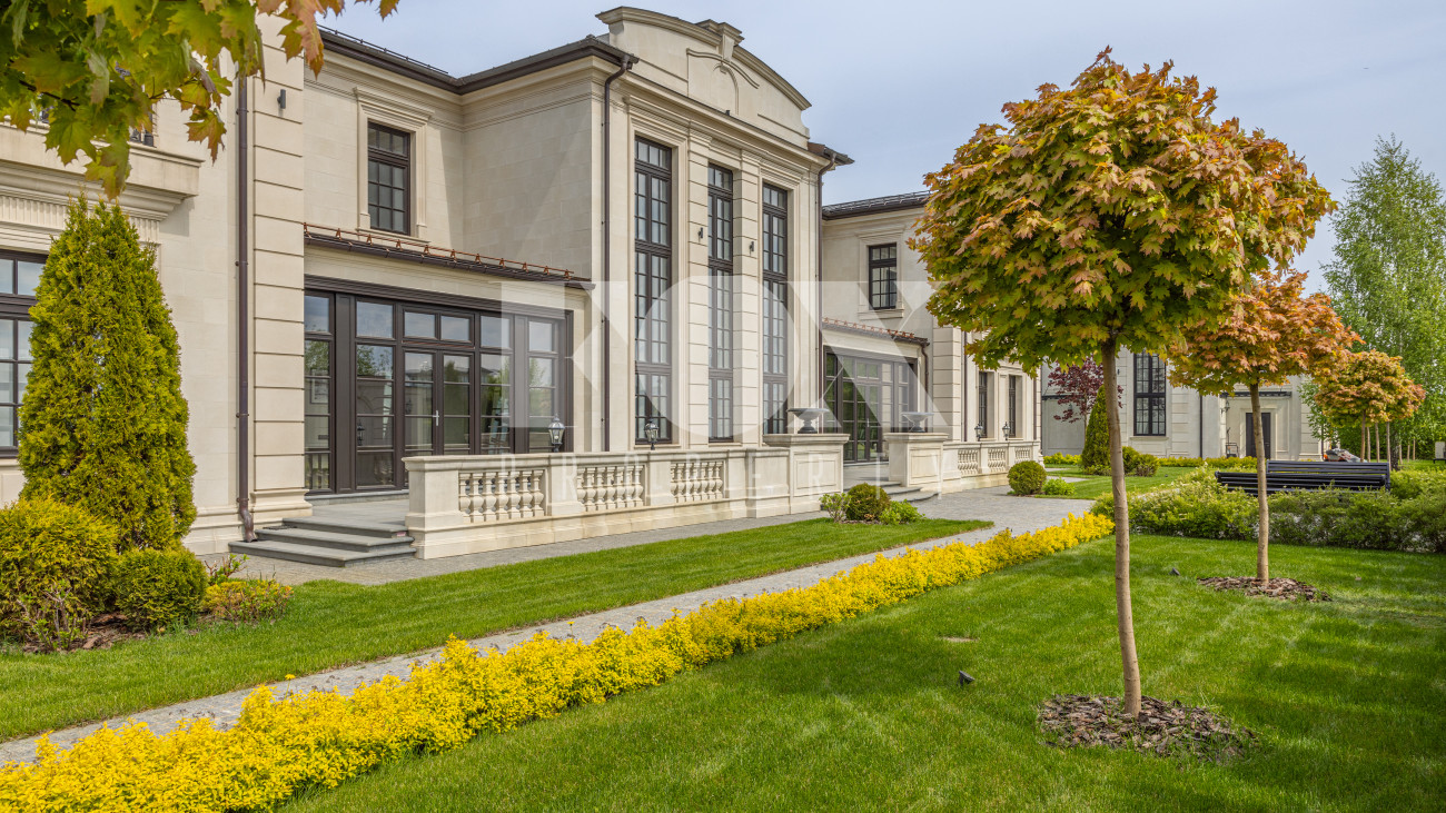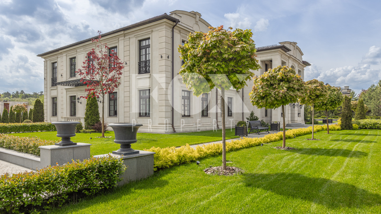 Дом в стиле английской классики с бассейном на ландшафтном парковом участке. Мебель и предметы интерьера ведущих мировых производителей. Отдельно расположены гараж на 3 м/м с квартирой для персонала и дом охраны. На участке проведены ландшафтные работы: высажен газон, посажены деревья, вымощена брусчатка, выполнено ландшафтное освещение.