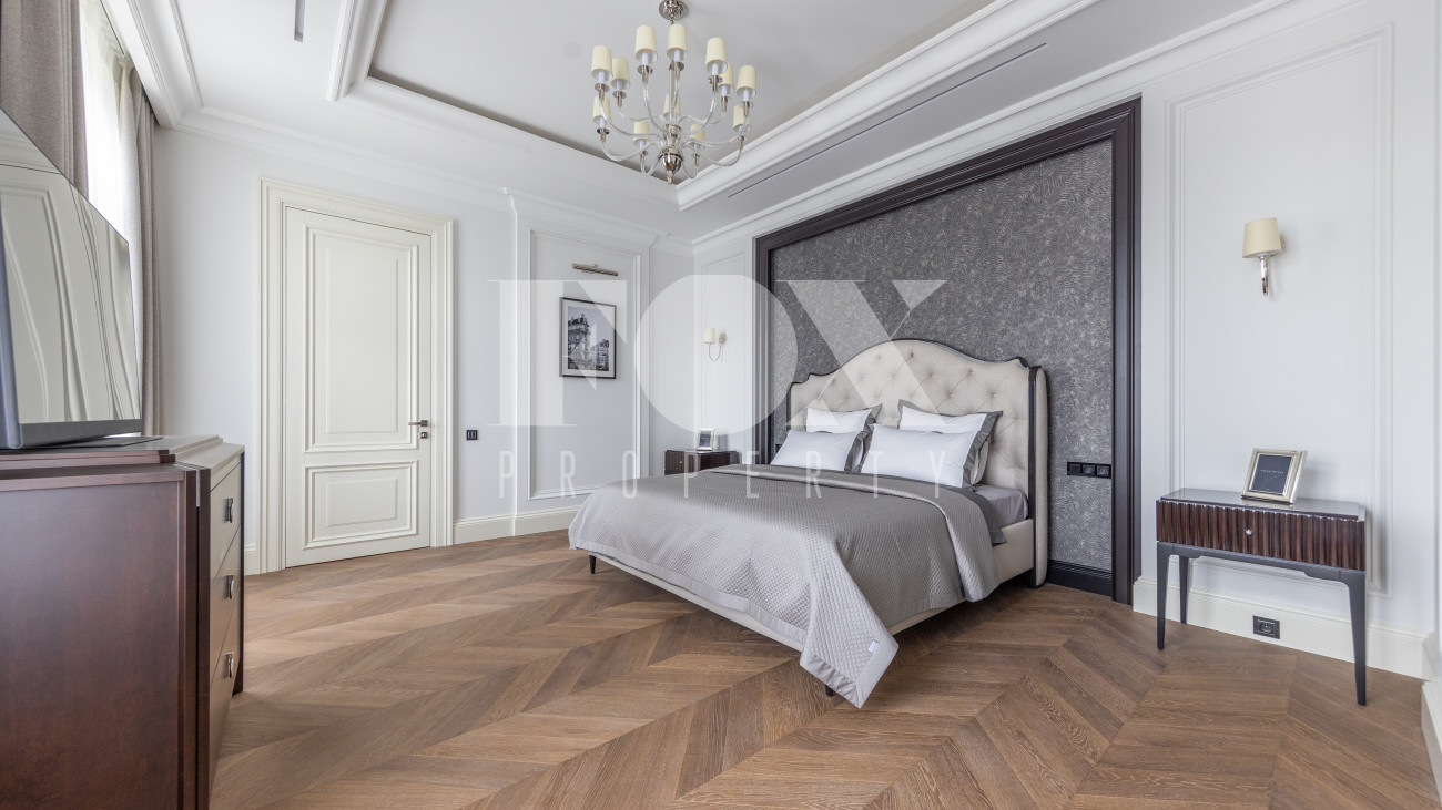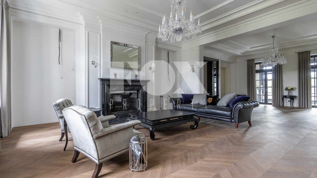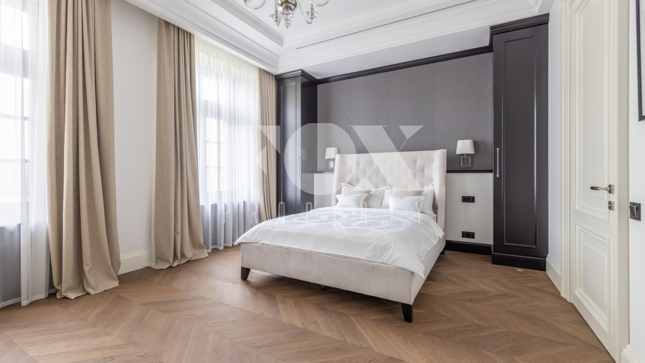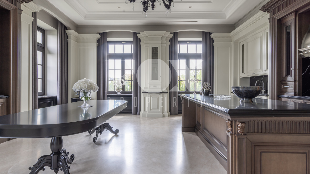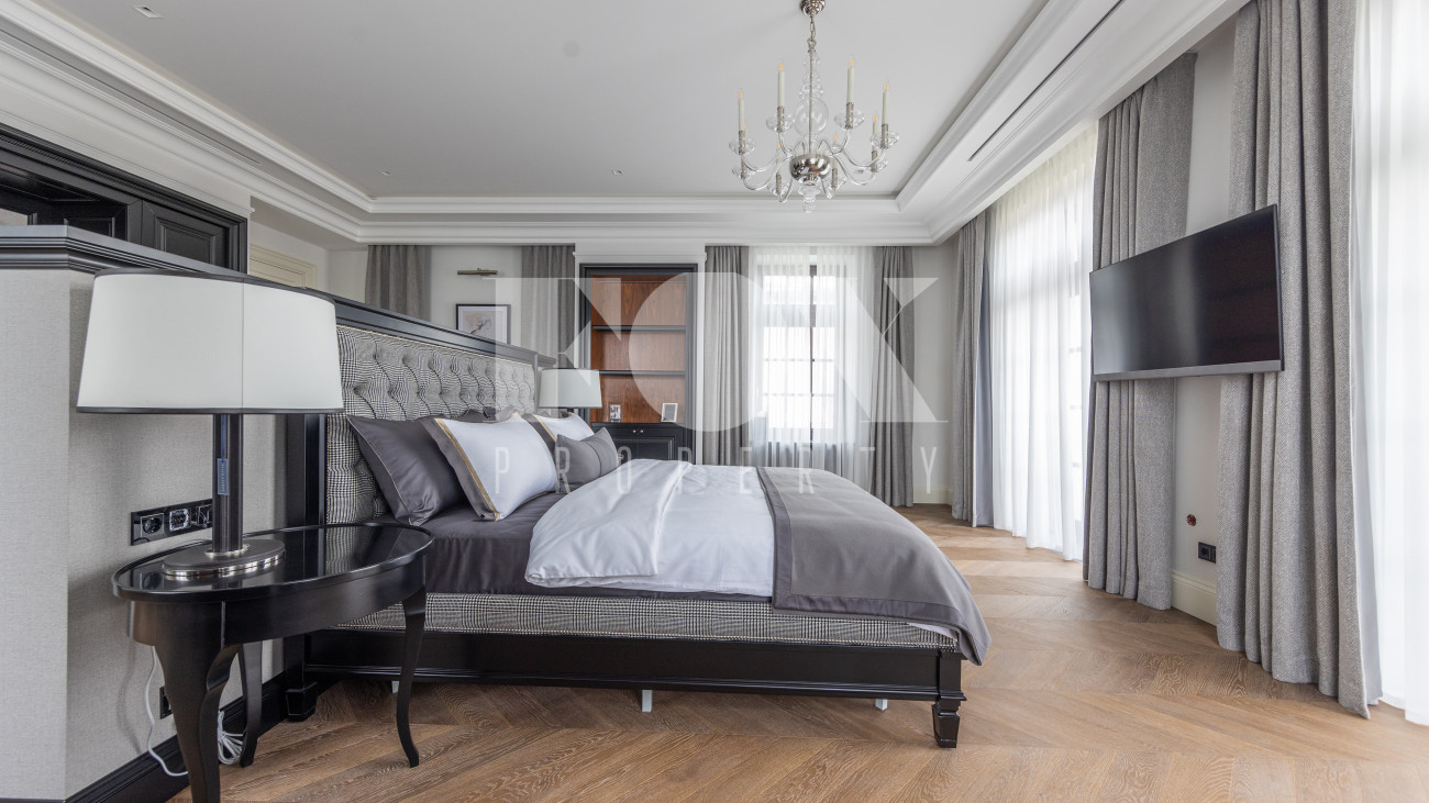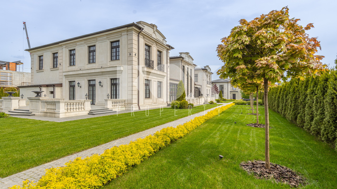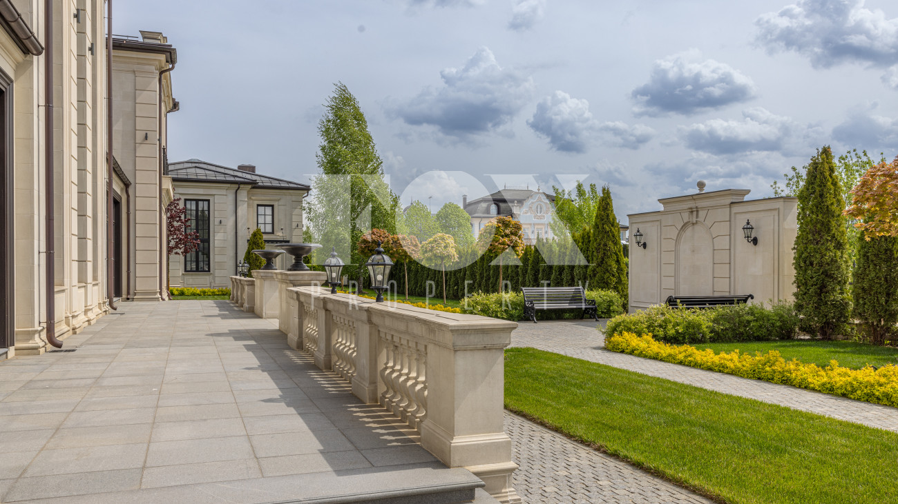 Дом в стиле английской классики с бассейном на ландшафтном парковом участке. Мебель и предметы интерьера ведущих мировых производителей. Отдельно расположены гараж на 3 м/м с квартирой для персонала и дом охраны. На участке проведены ландшафтные работы: высажен газон, посажены деревья, вымощена брусчатка, выполнено ландшафтное освещение.