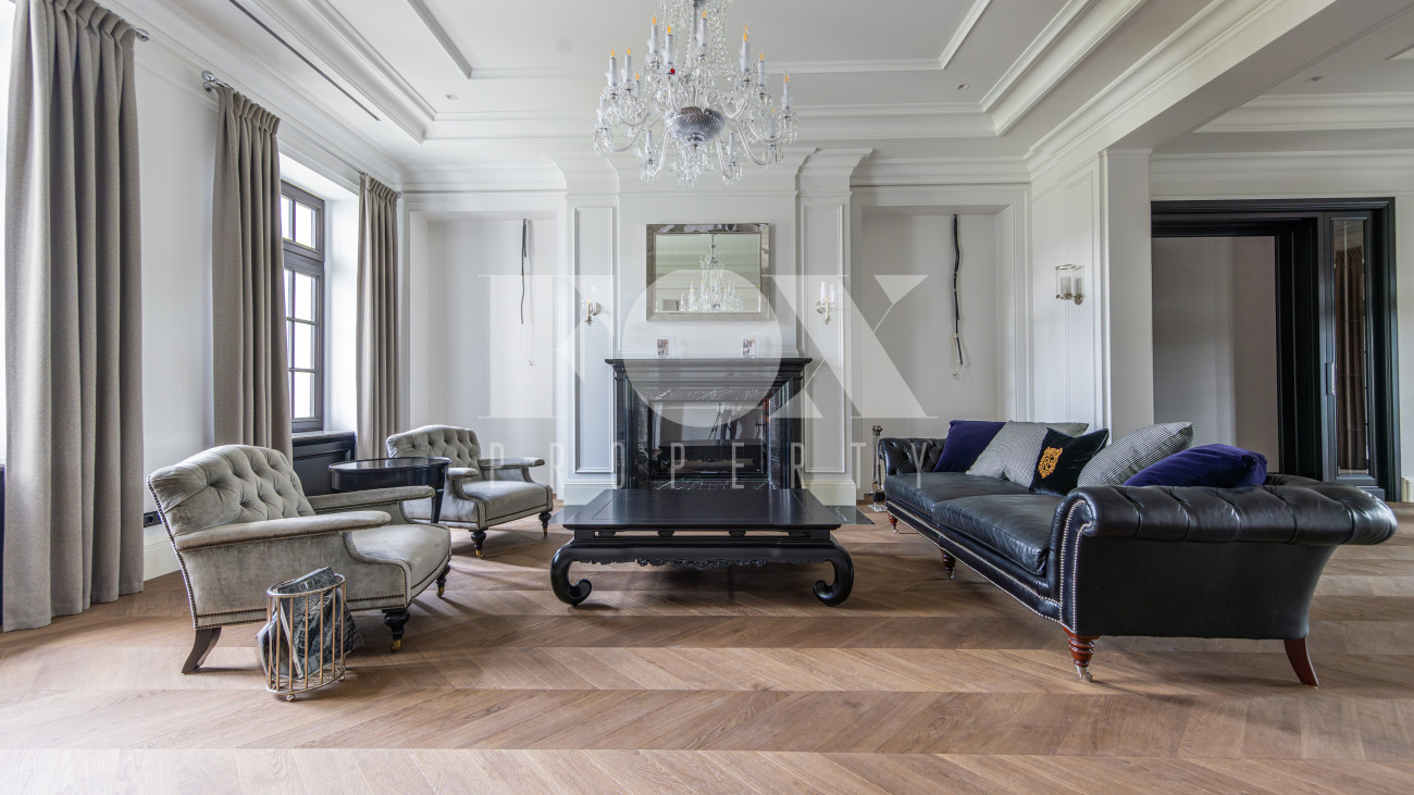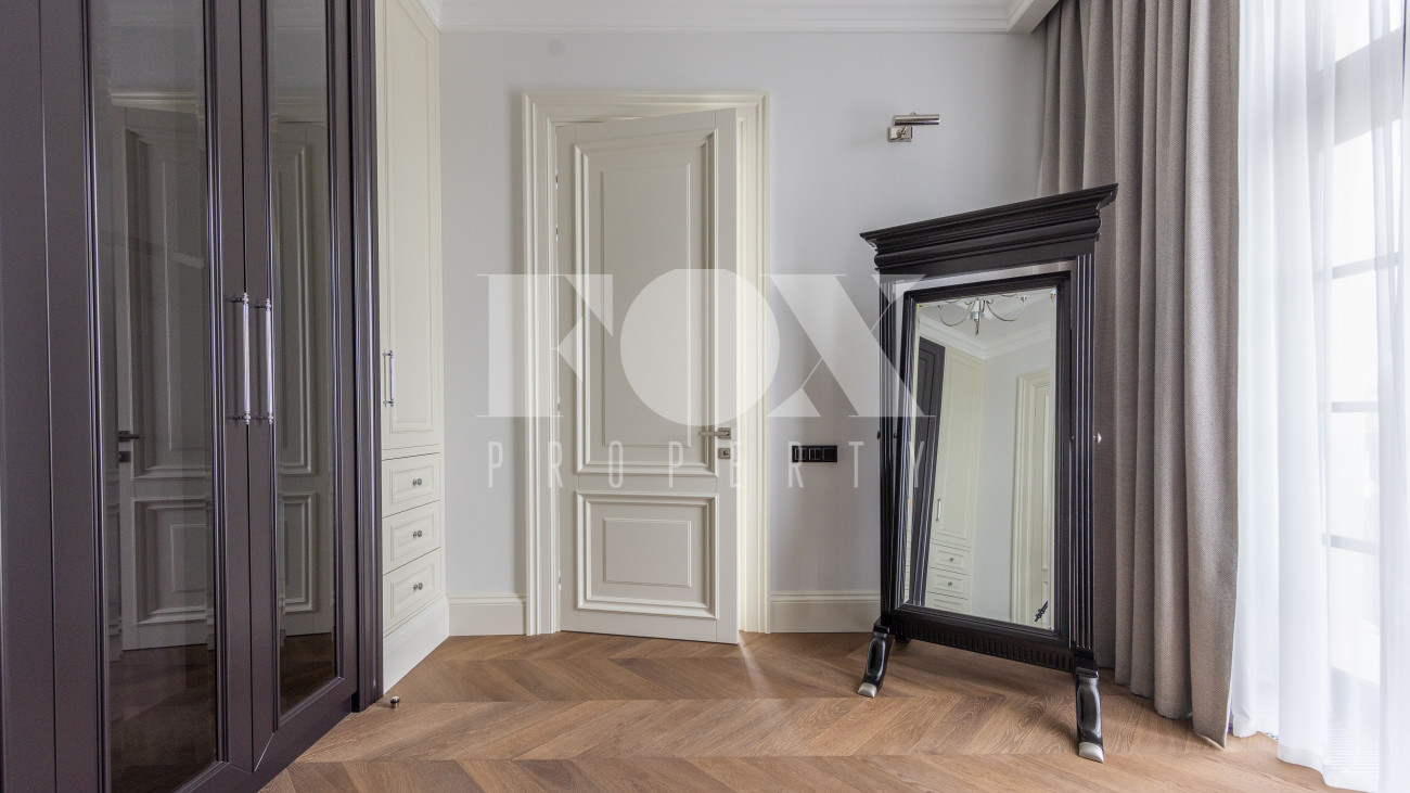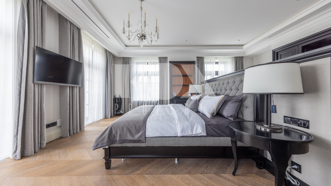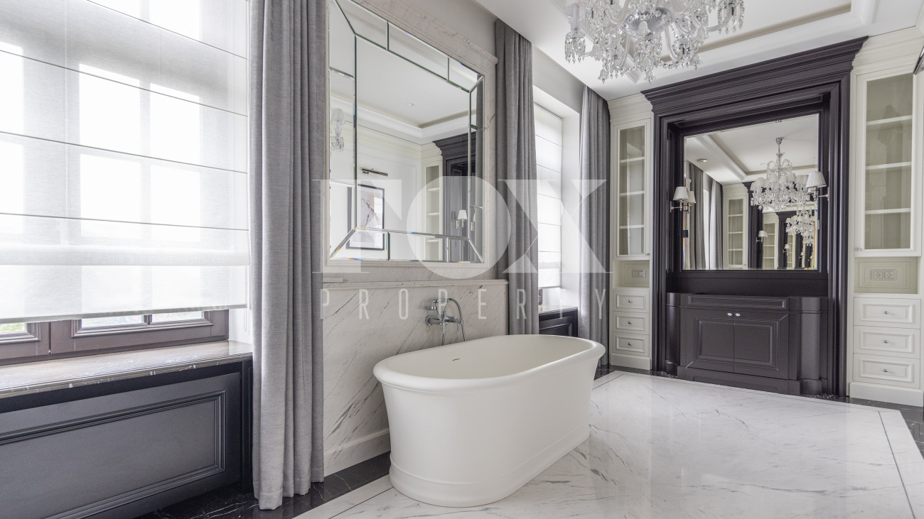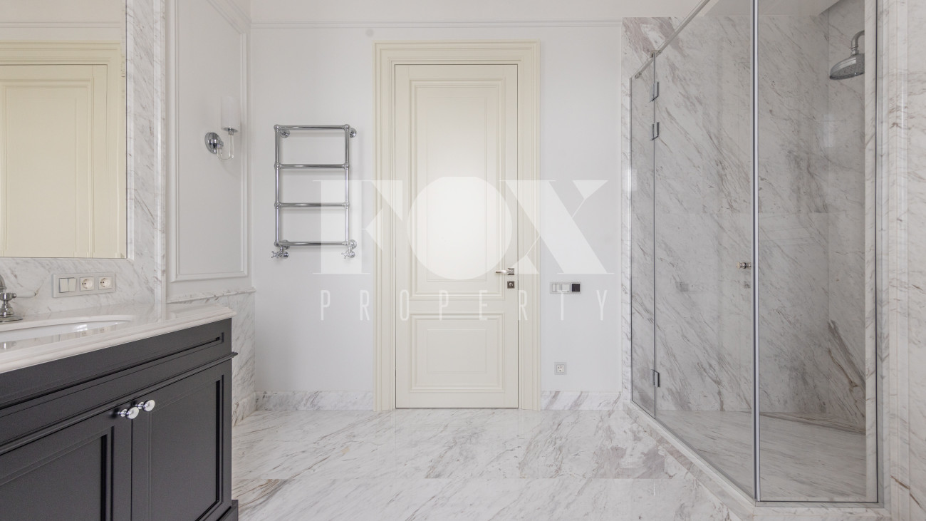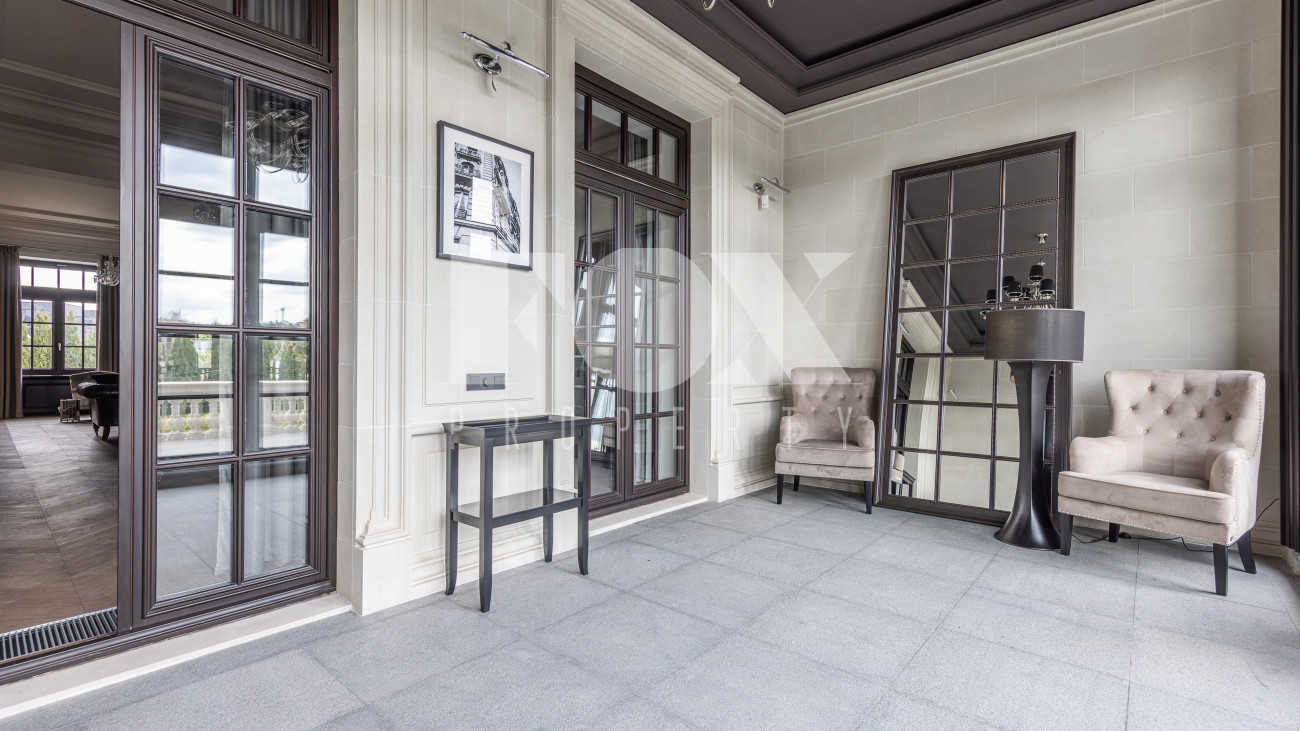Дом в стиле английской классики с бассейном на ландшафтном парковом участке. Мебель и предметы интерьера ведущих мировых производителей. Отдельно расположены гараж на 3 м/м с квартирой для персонала и дом охраны. На участке проведены ландшафтные работы: высажен газон, посажены деревья, вымощена брусчатка, выполнено ландшафтное освещение.
