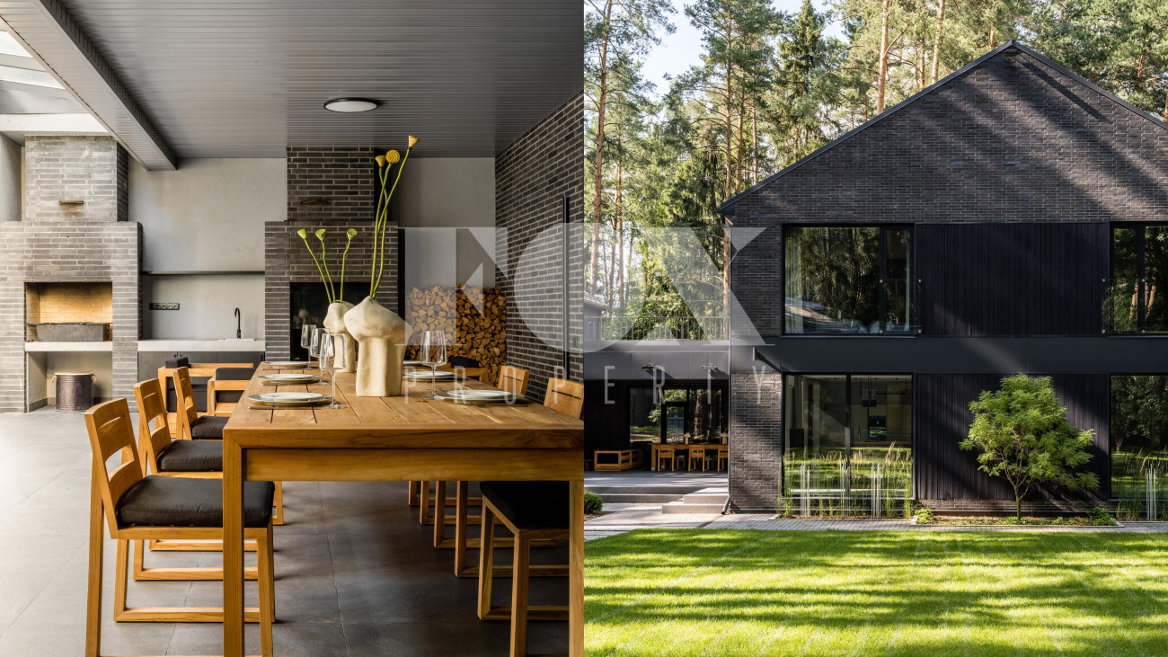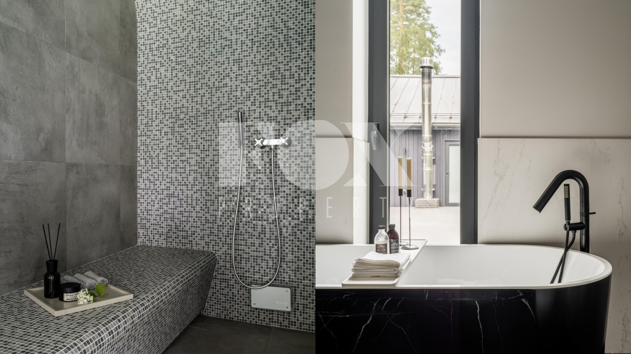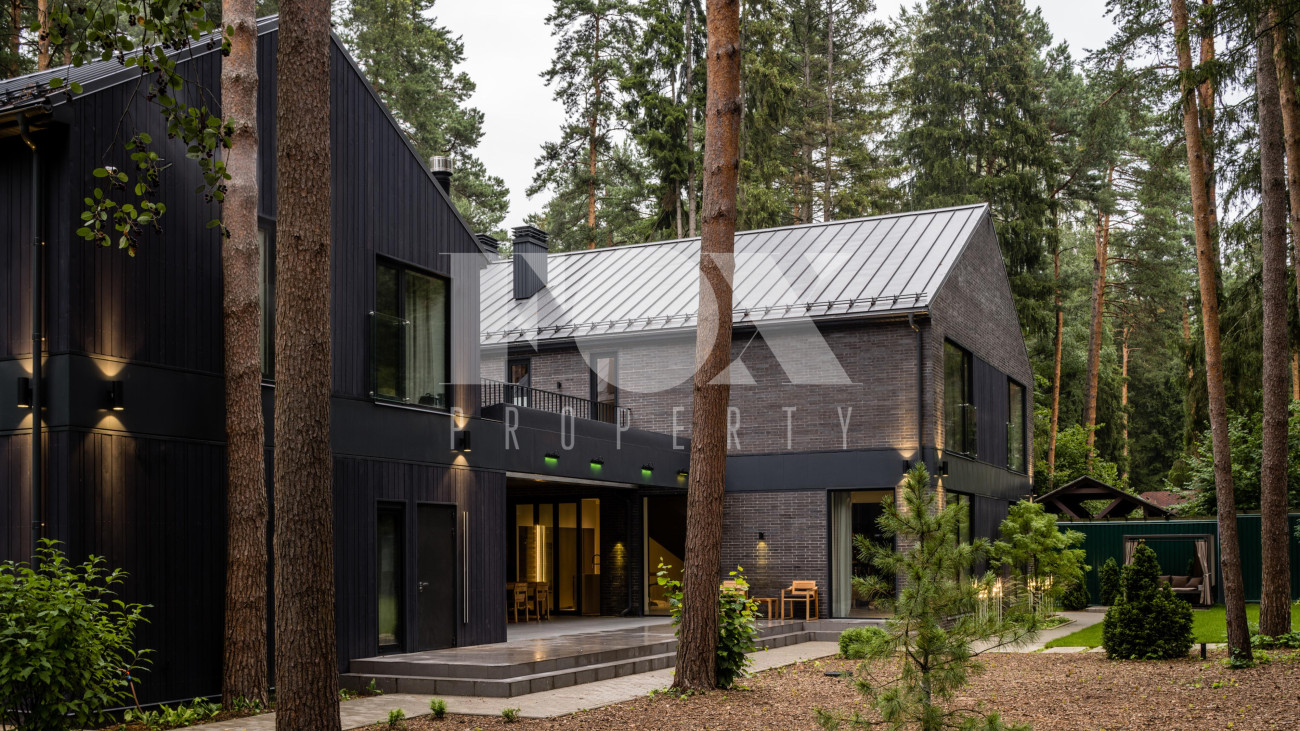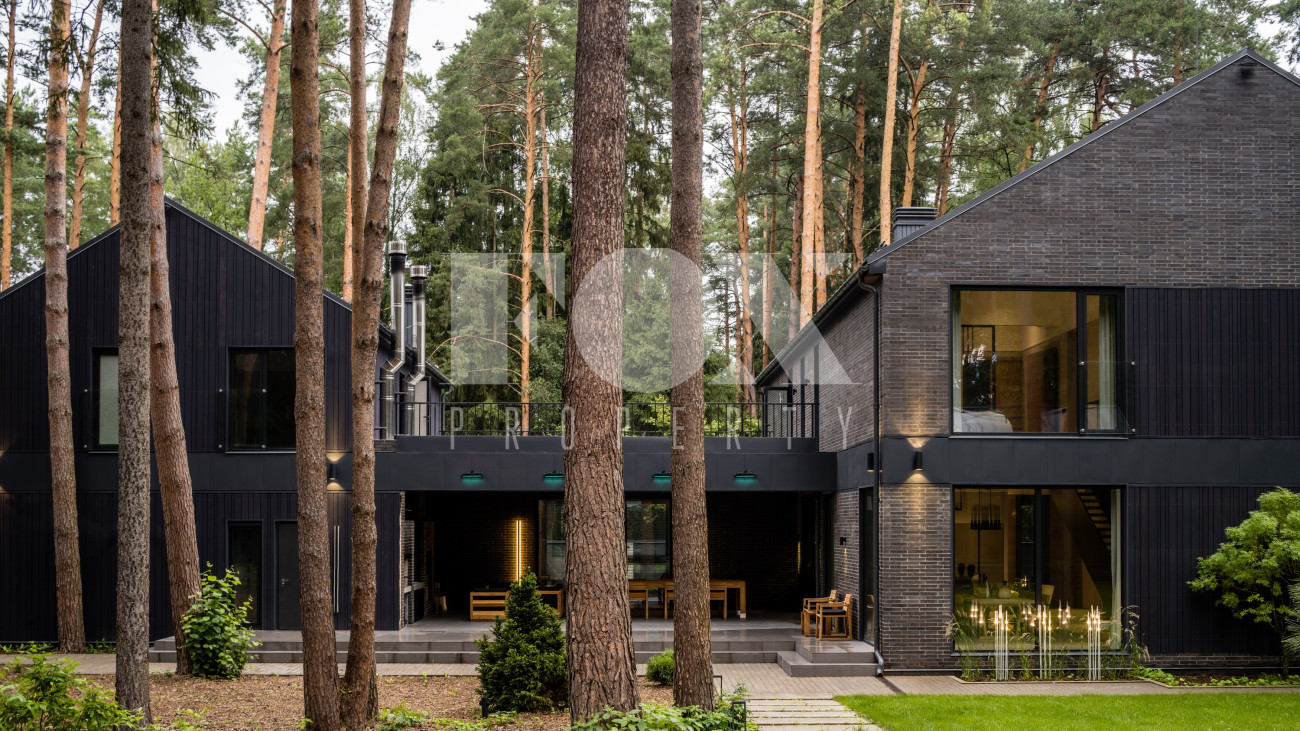 Потолки от 3,6 до 6 метров, большая площадь остекления. Энергосбережение дома уровня А++. Отделка: фальцевая кровля и немецкий клинкер. Просторная веранда с зоной барбекю и камином. Кондиционирование и приточно-вытяжная вентиляция, фильтрация воды. Все центральные коммуникации и собственная скважина. Отдельно стоящий гараж на 2 м/м и парковочная зона на 4 м/м. Квартира для персонала.