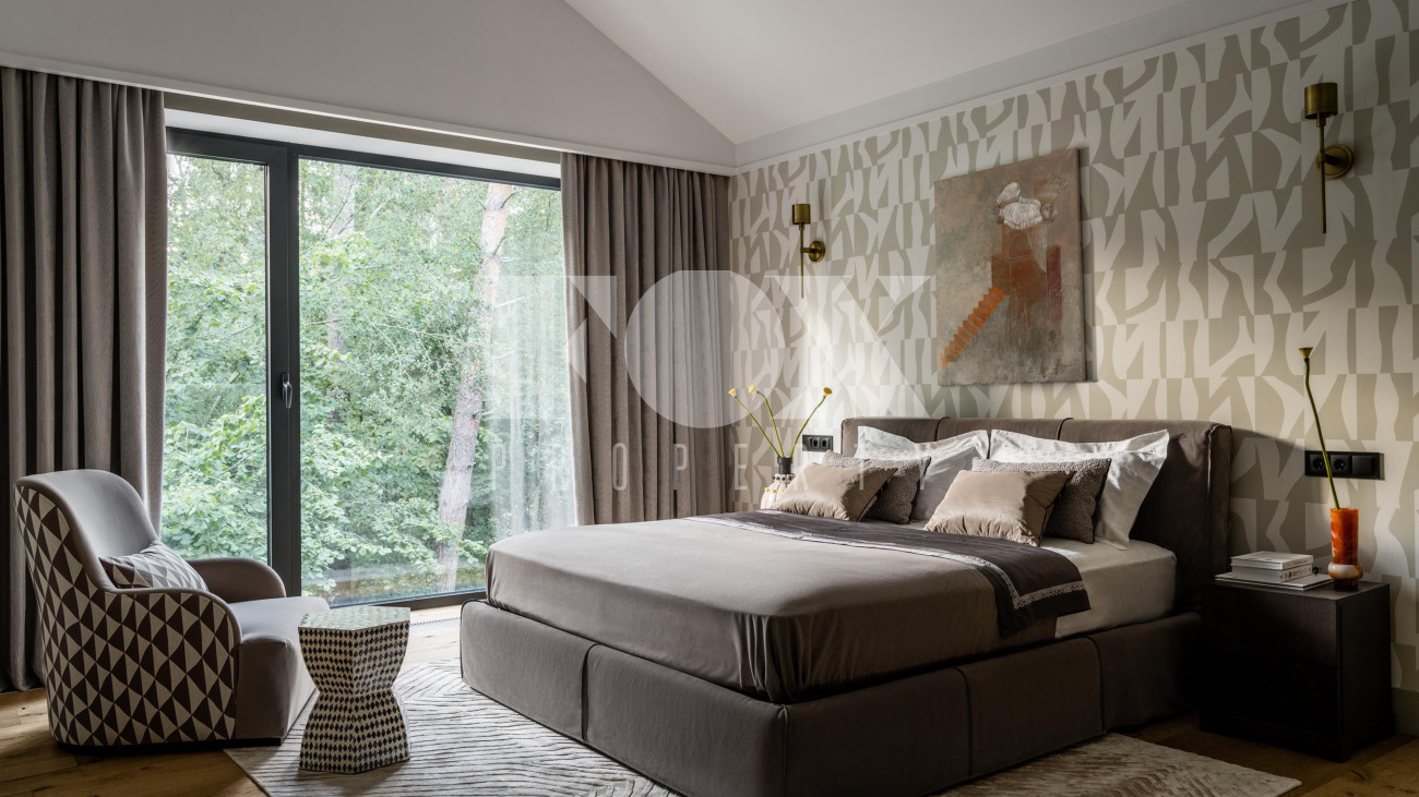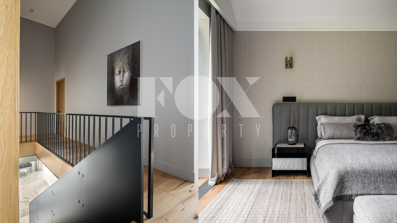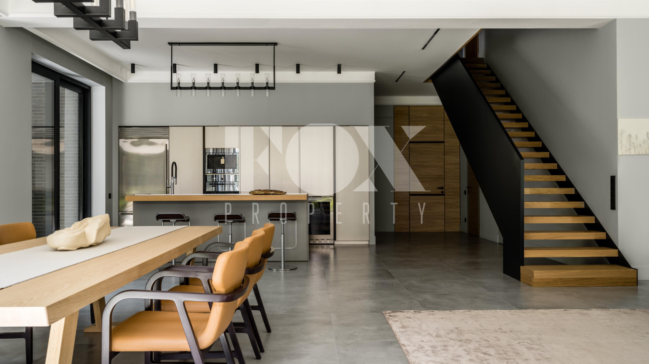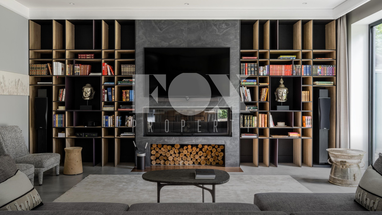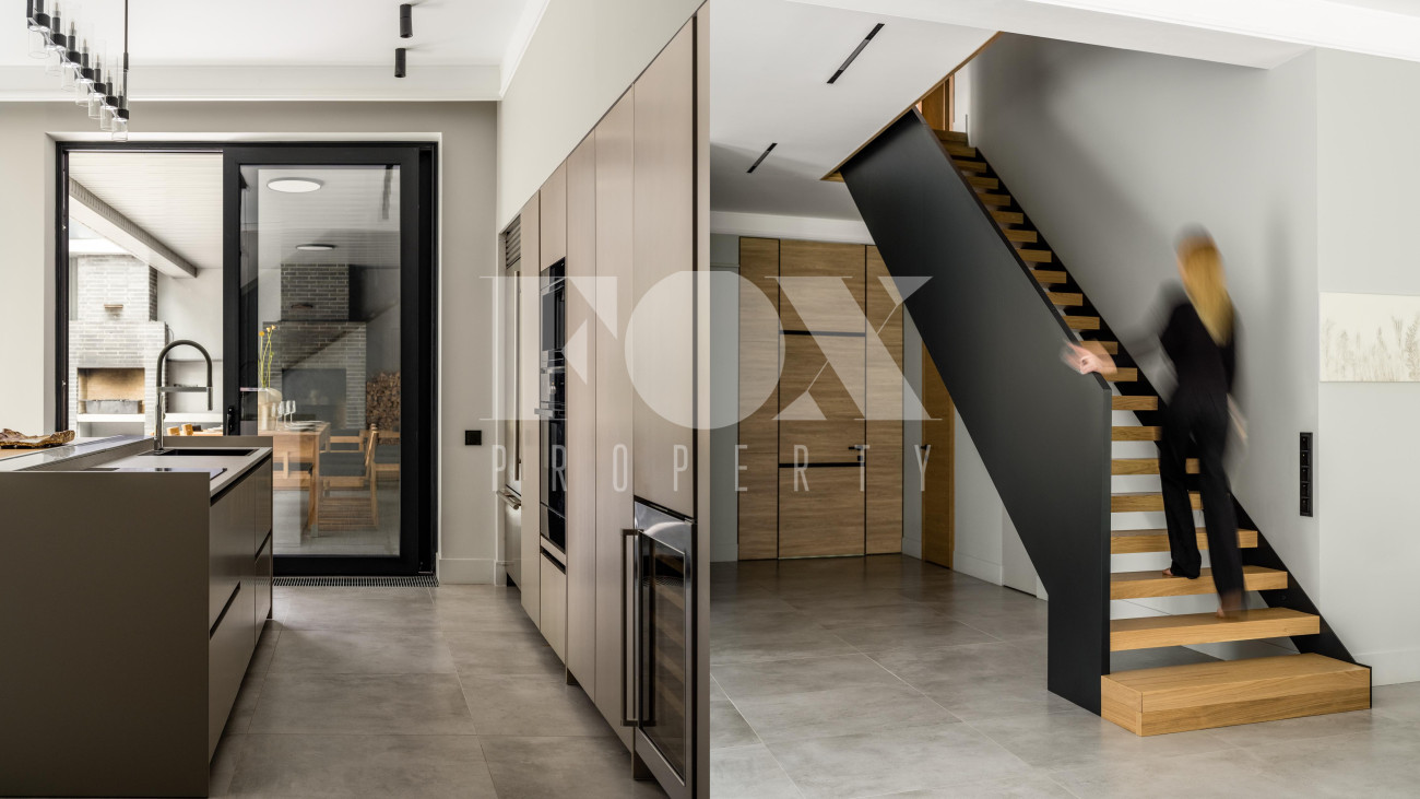 Потолки от 3,6 до 6 метров, большая площадь остекления. Энергосбережение дома уровня А++. Отделка: фальцевая кровля и немецкий клинкер. Просторная веранда с зоной барбекю и камином. Кондиционирование и приточно-вытяжная вентиляция, фильтрация воды. Все центральные коммуникации и собственная скважина. Отдельно стоящий гараж на 2 м/м и парковочная зона на 4 м/м. Квартира для персонала.