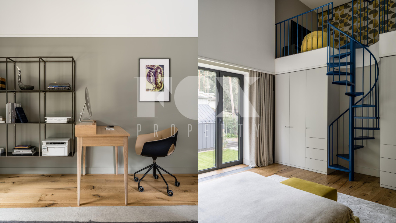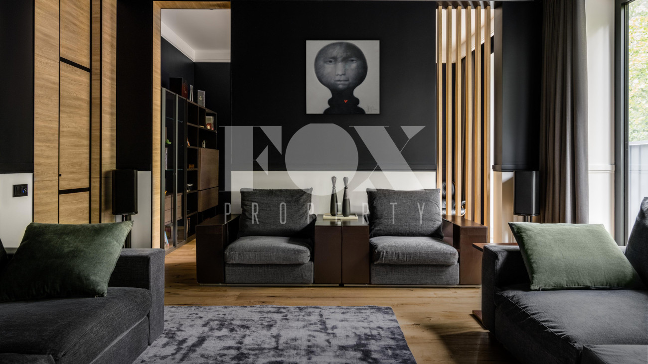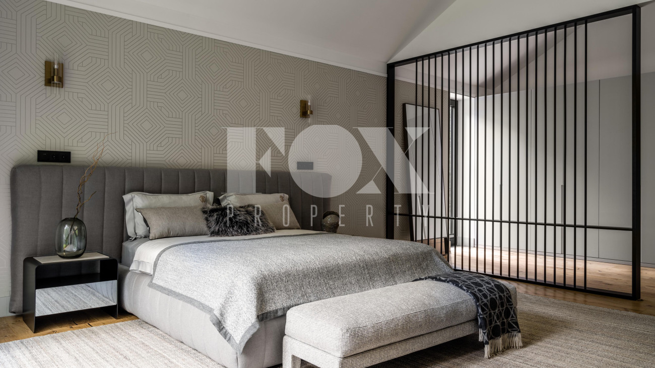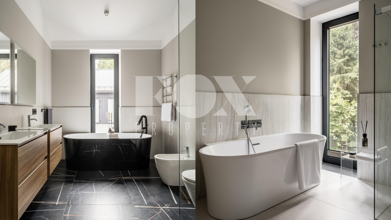 Потолки от 3,6 до 6 метров, большая площадь остекления. Энергосбережение дома уровня А++. Отделка: фальцевая кровля и немецкий клинкер. Просторная веранда с зоной барбекю и камином. Кондиционирование и приточно-вытяжная вентиляция, фильтрация воды. Все центральные коммуникации и собственная скважина. Отдельно стоящий гараж на 2 м/м и парковочная зона на 4 м/м. Квартира для персонала.