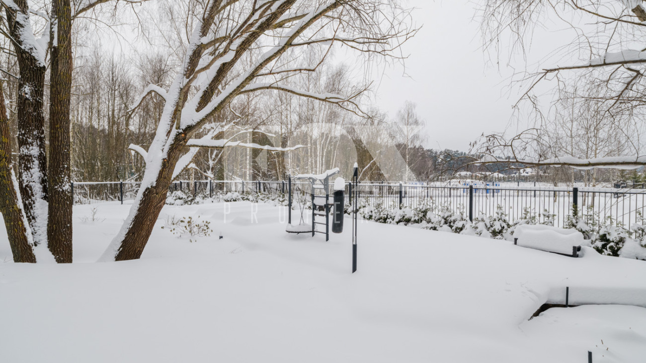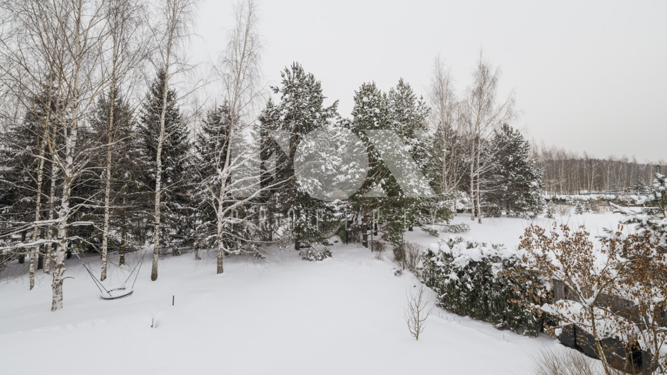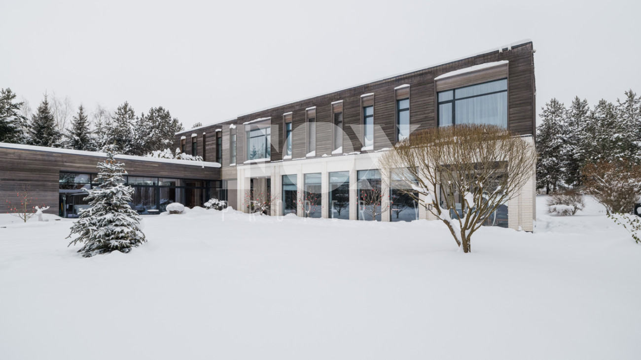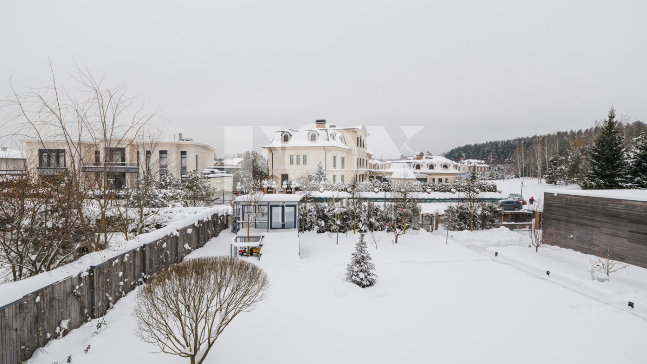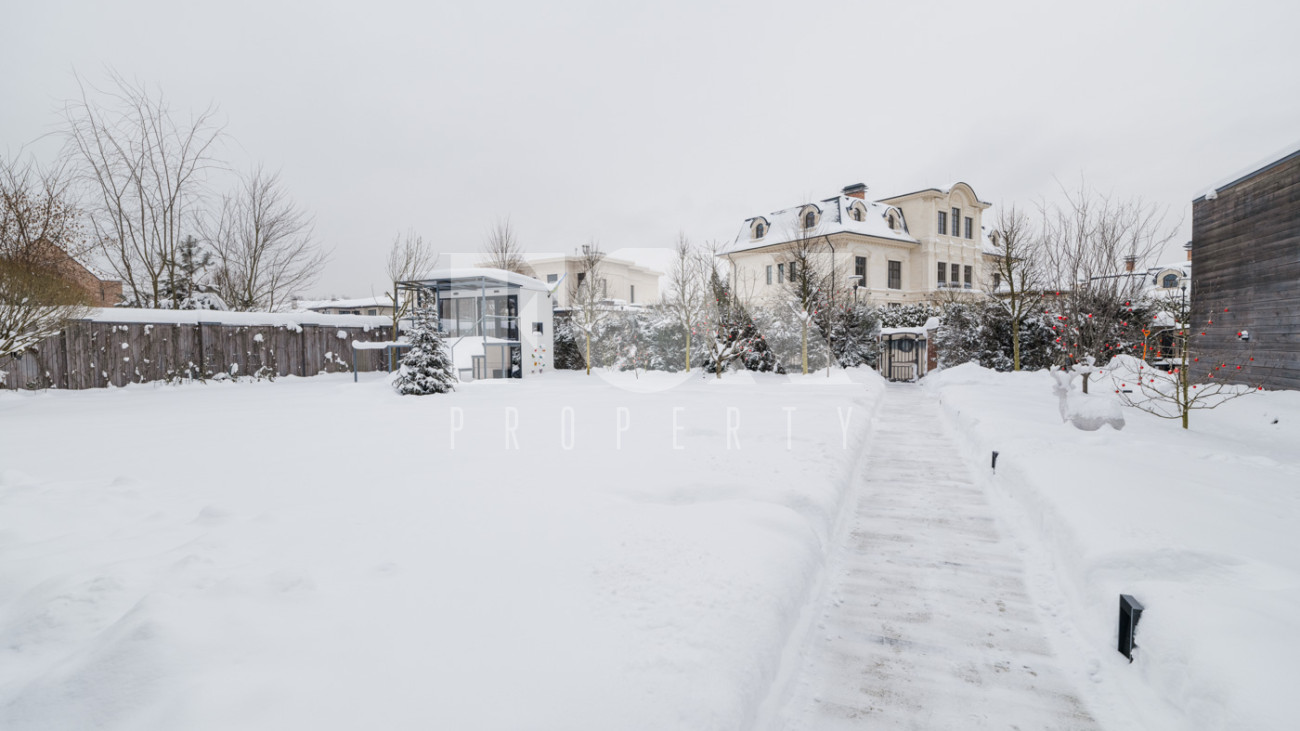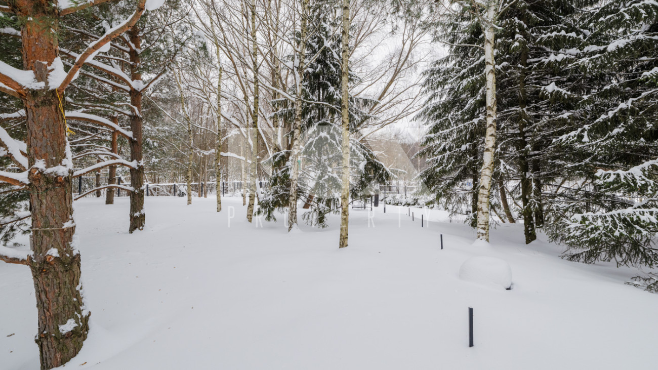 Участок с ландшафтным дизайном и хвойными деревьями. На участке расположен игровой домик для детей, небольшая теплица, хозблок с квартирой для персонала (одна спальня). Живописные виды на окрестности - поле и лес. С территории участка есть выход в парковую зону около Москвы-реки.