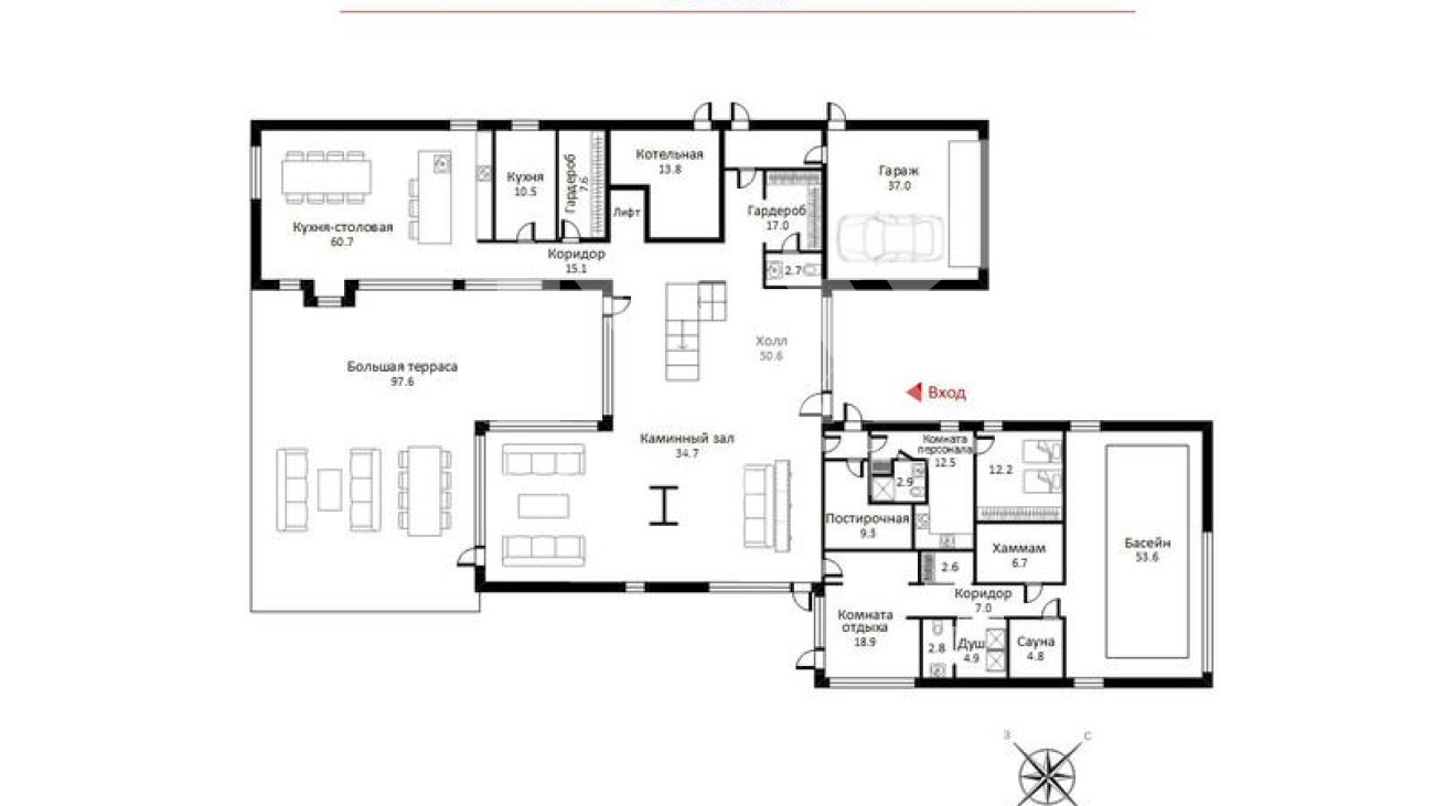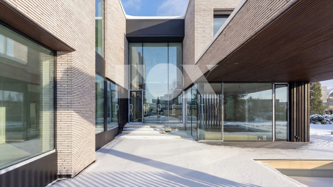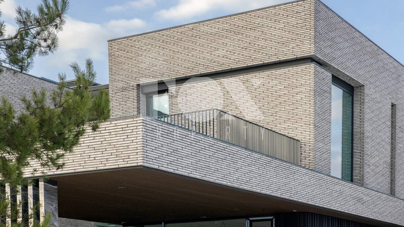 Архитектура дома поражает своей элегантностью и продуманностью. Использование кирпича в сочетании с панорамным остеклением подчеркивает современный стиль и обеспечивает максимальное естественное освещение. Внутреннее пространство дома, площадью 1100 квадратных метров, включает пять спален и семь ванных комнат, что позволяет с комфортом разместить большую семью. Особое внимание уделено зонам отдыха: бассейн, сауна, хамам и SPA создают атмосферу настоящего курорта прямо у вас дома.
