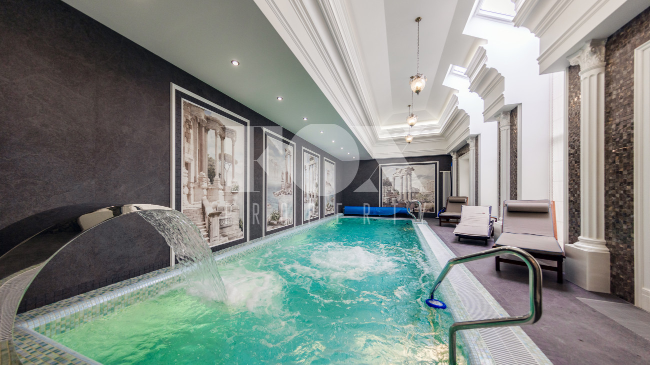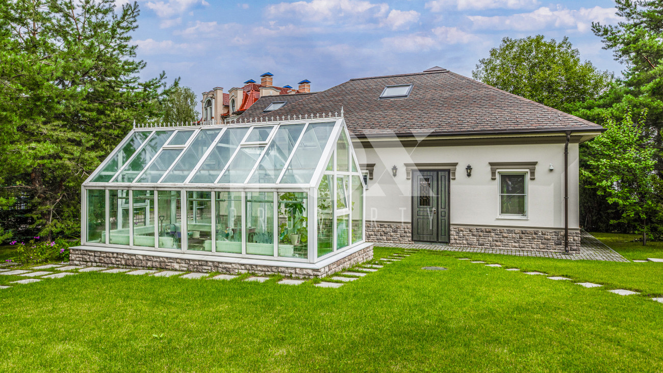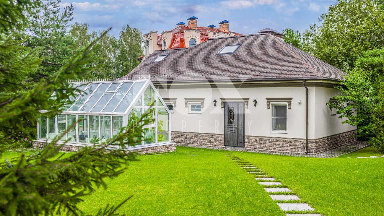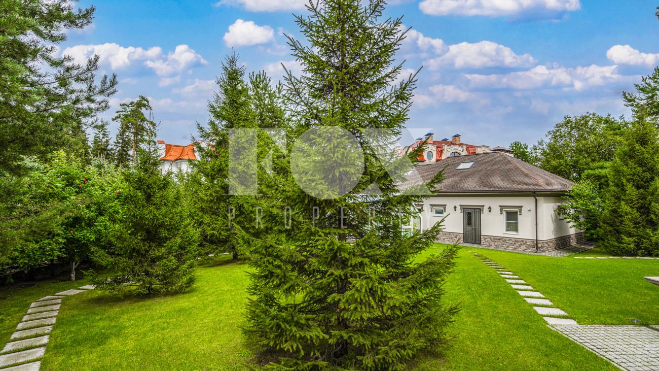 На территории участка расположены: SPA-комплекс с большим бассейном (10,5х3,7 м), сауной, хаммамом, винной и сигарной комнатой; открытая веранда с профессиональной печью и грилем; гараж на два машино-места с квартирой для персонала.