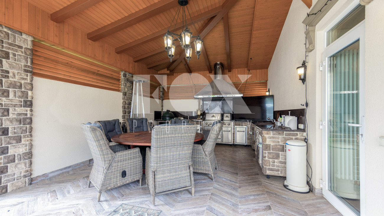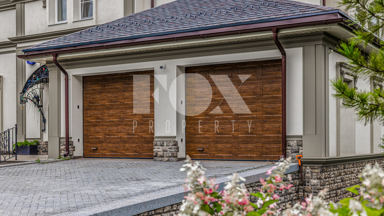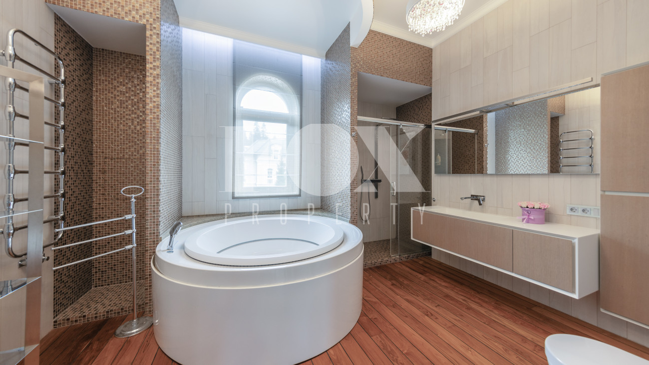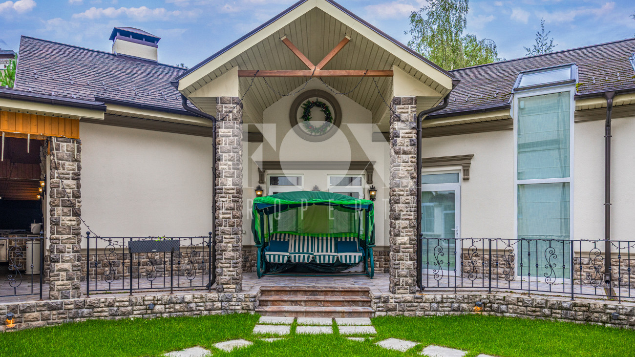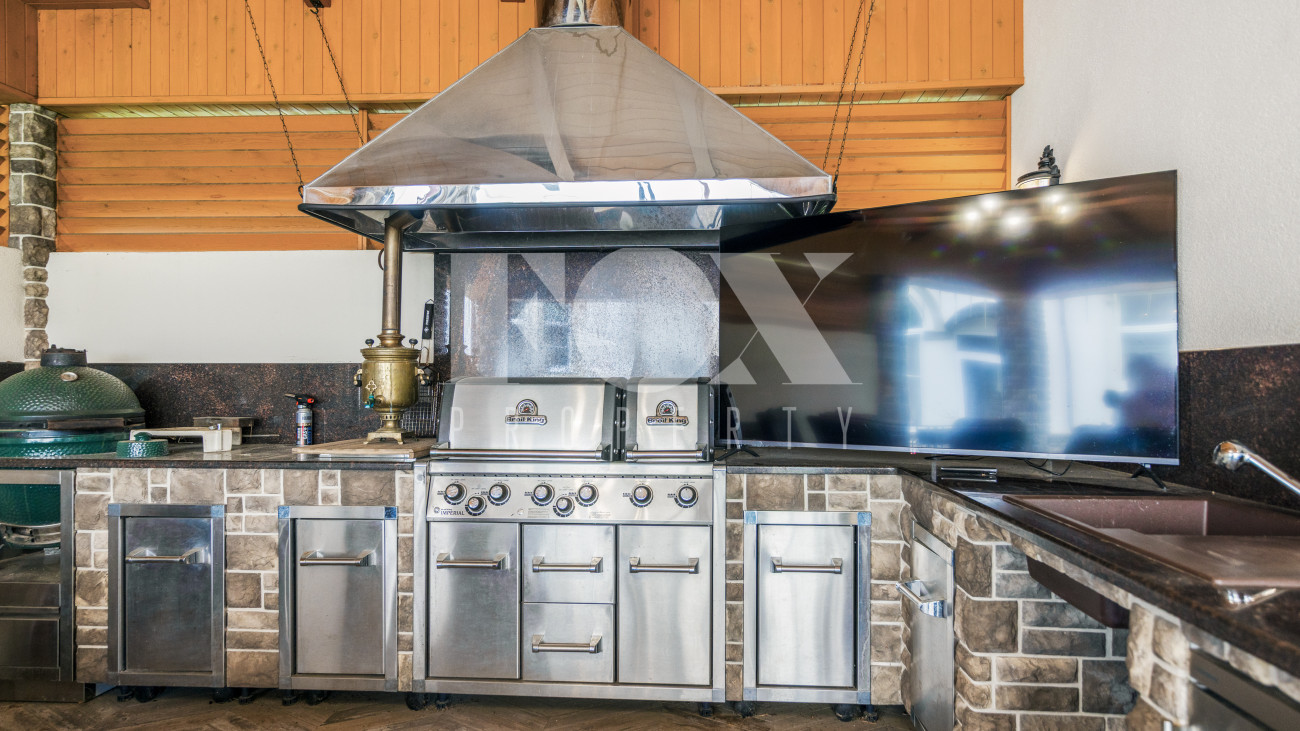 На территории участка расположены: SPA-комплекс с большим бассейном (10,5х3,7 м), сауной, хаммамом, винной и сигарной комнатой; открытая веранда с профессиональной печью и грилем; гараж на два машино-места с квартирой для персонала.