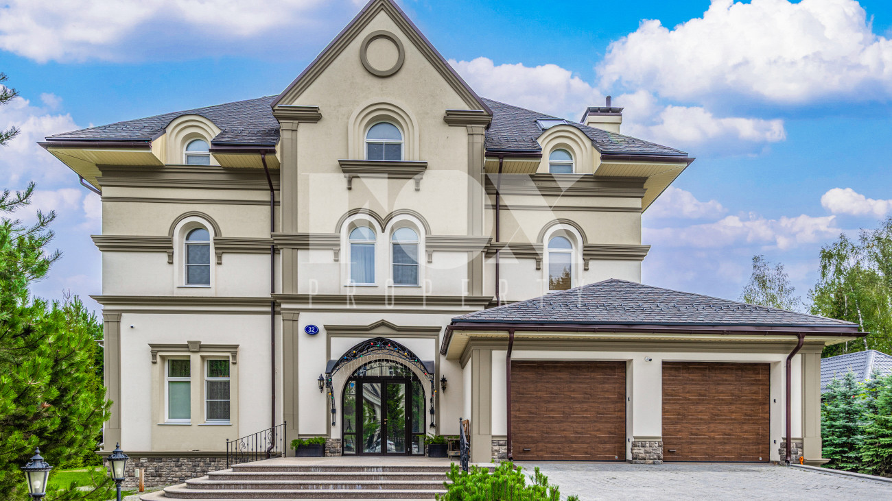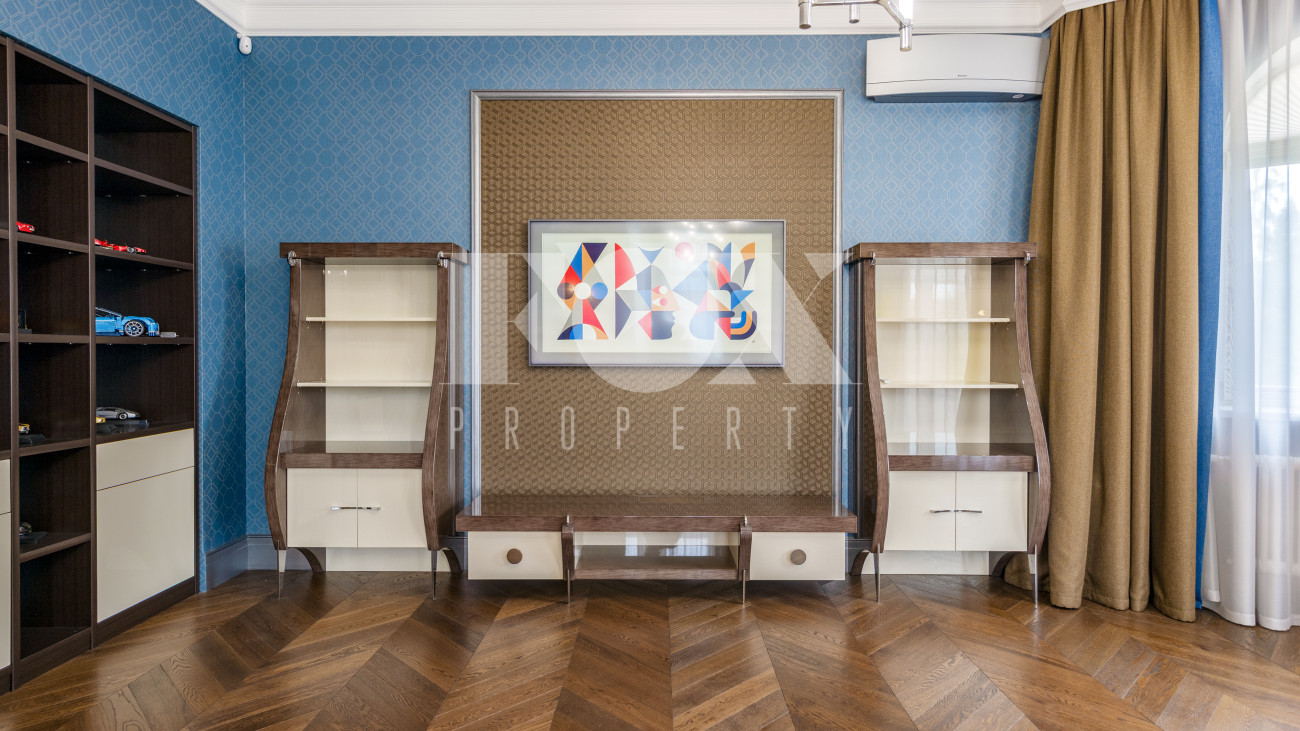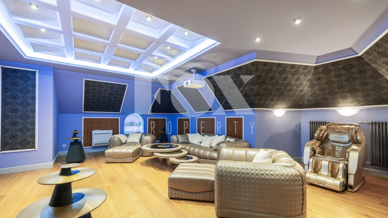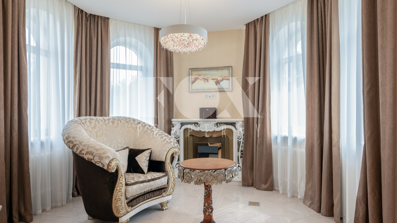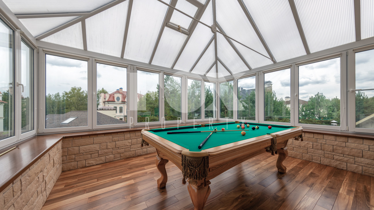 В доме уютная гостиная с выходом на террасу, 5 полноценных спален (3 из которых с собственными санузлами и гардеробными), просторный кабинет с камином (при необходимости может быть использован как дополнительная спальня), оборудованный тренажерами спортзал, домашний кинотеатр и бильярдная.