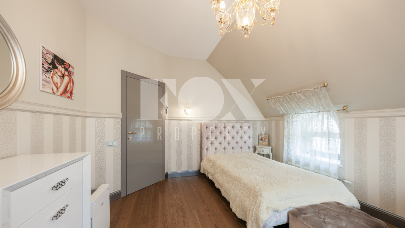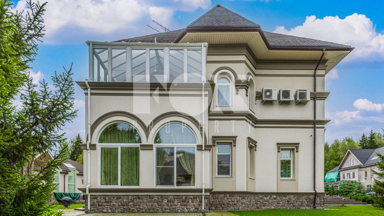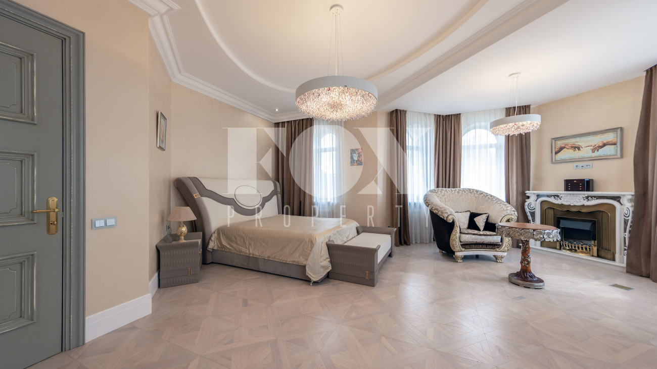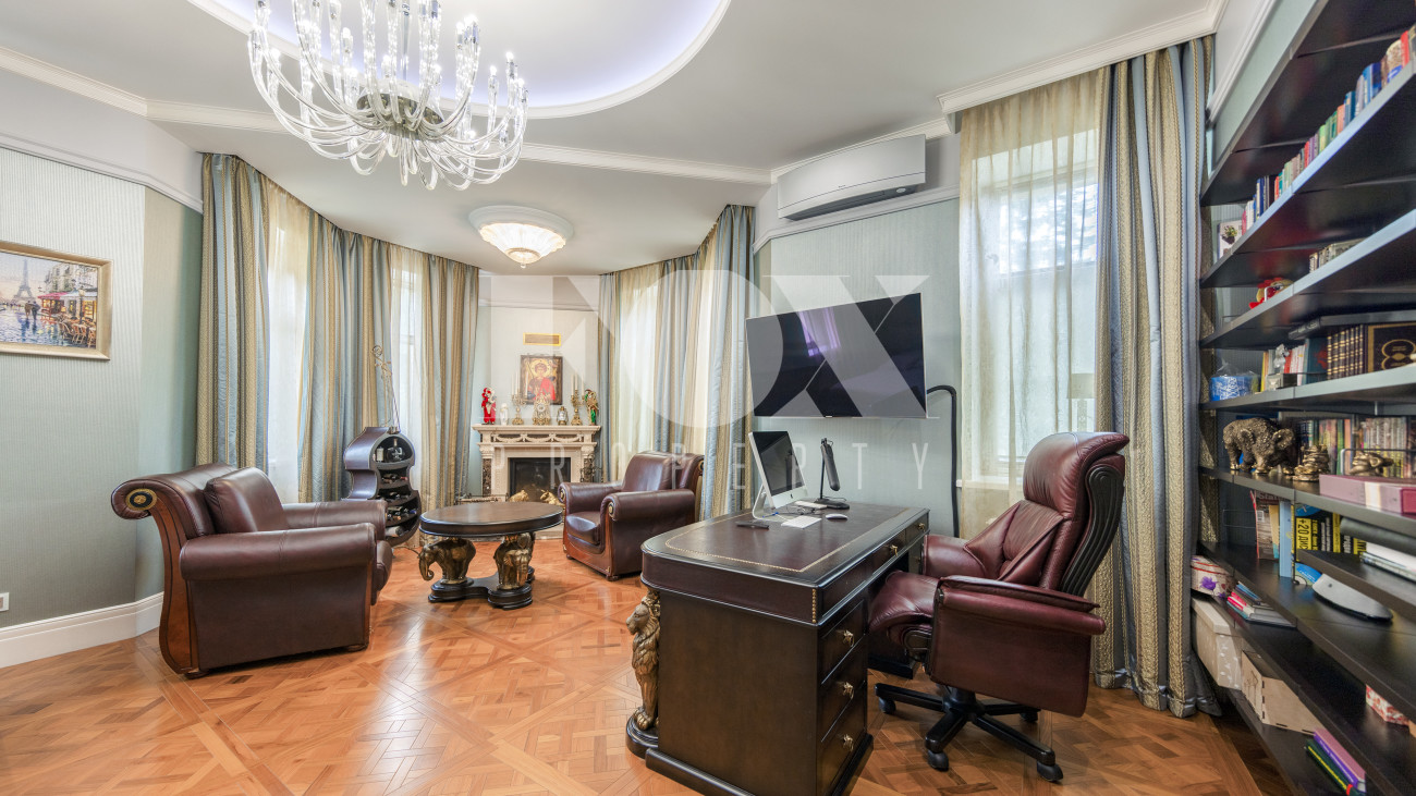 В доме уютная гостиная с выходом на террасу, 5 полноценных спален (3 из которых с собственными санузлами и гардеробными), просторный кабинет с камином (при необходимости может быть использован как дополнительная спальня), оборудованный тренажерами спортзал, домашний кинотеатр и бильярдная.