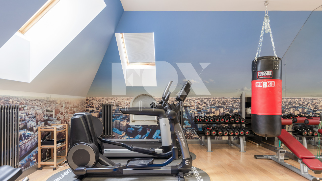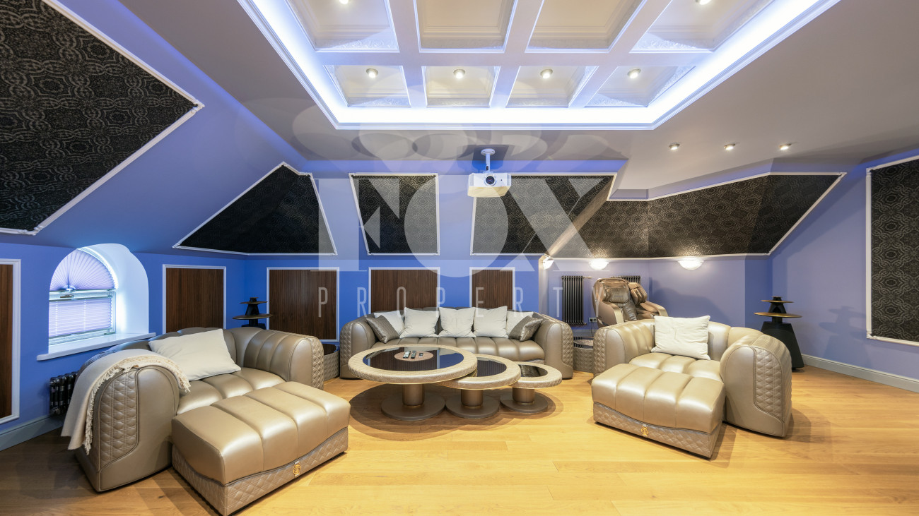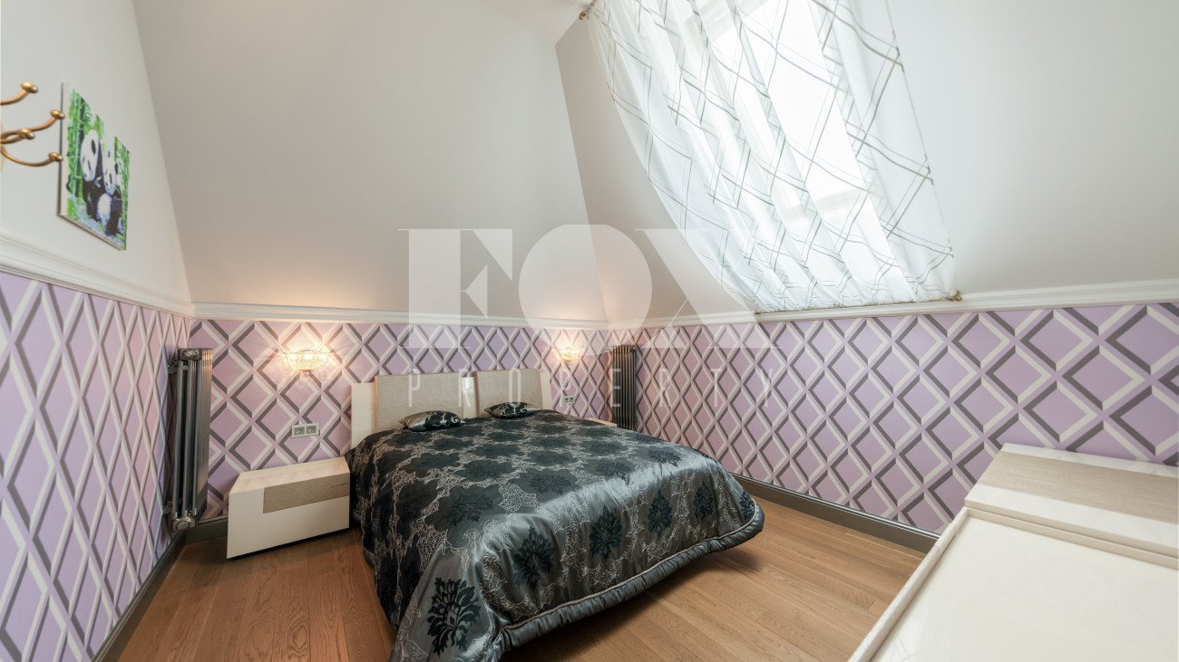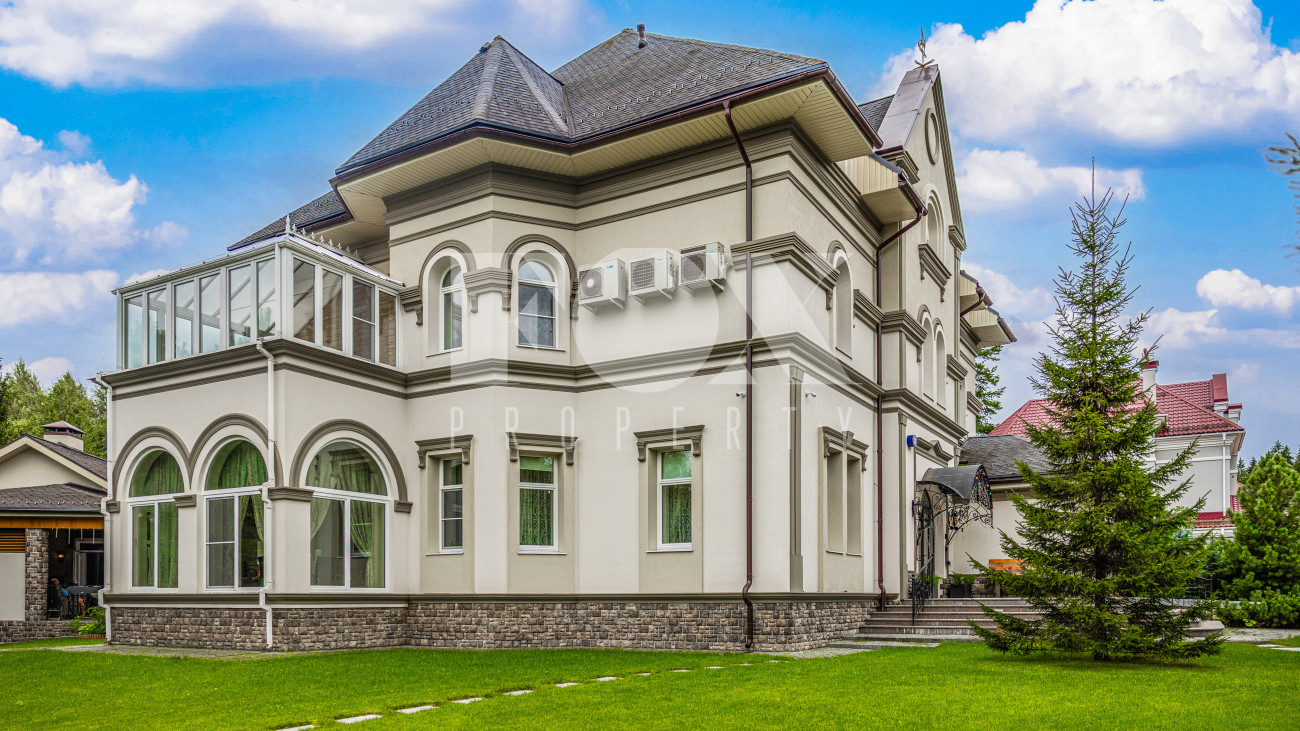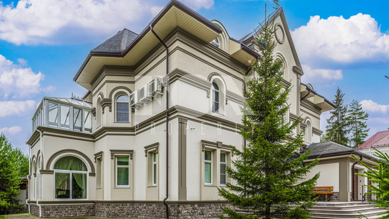 В доме уютная гостиная с выходом на террасу, 5 полноценных спален (3 из которых с собственными санузлами и гардеробными), просторный кабинет с камином (при необходимости может быть использован как дополнительная спальня), оборудованный тренажерами спортзал, домашний кинотеатр и бильярдная.