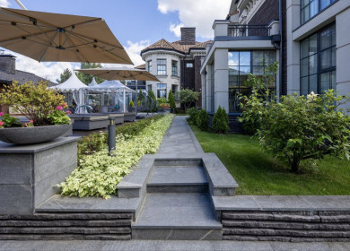 Отдельно стоящий 2-этажный дом для персонала со своей кухней и с/у, а также с гаражом на 2 автомобиля. На участке подготовлен фундамент с цокольным этажом с подведенными коммуникациями для строительства бани или гостевого дома.
