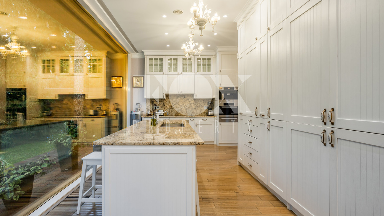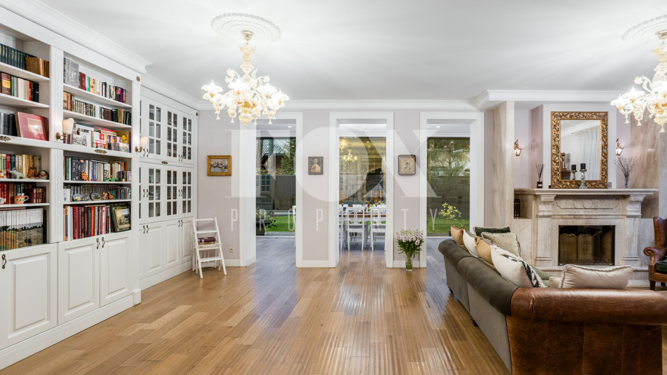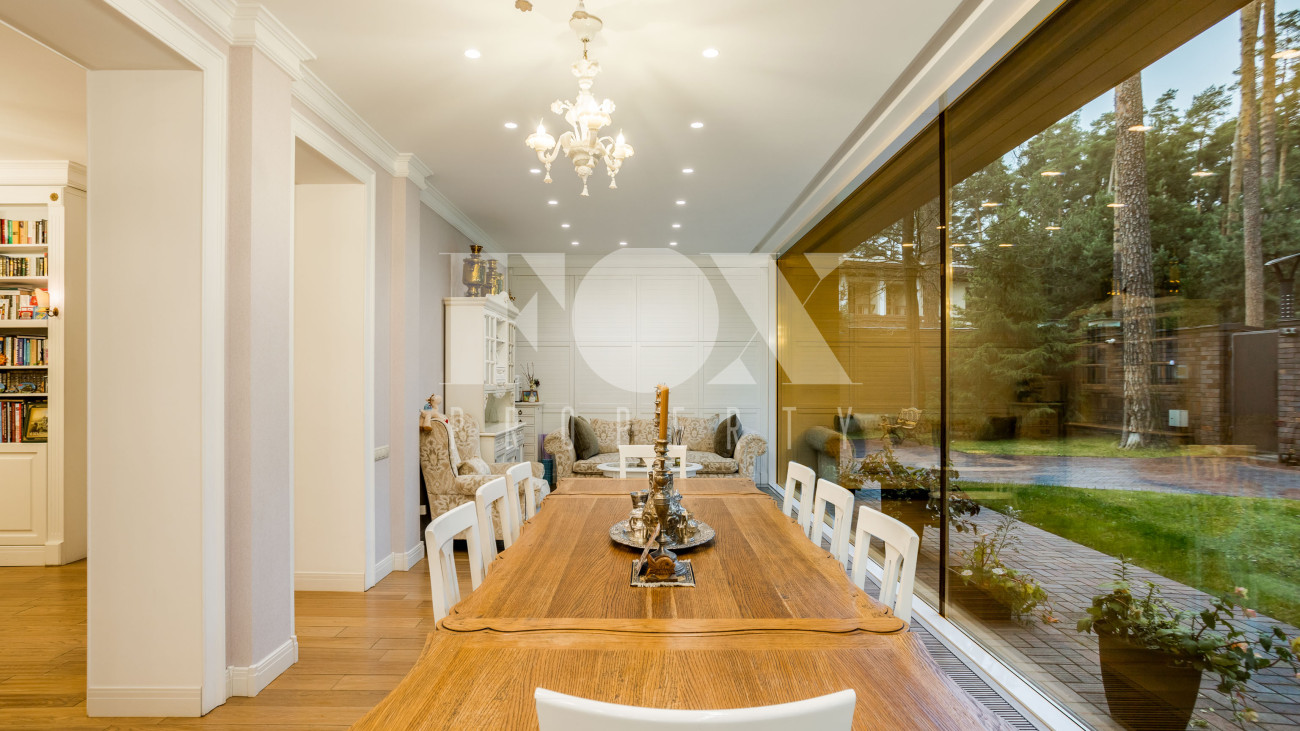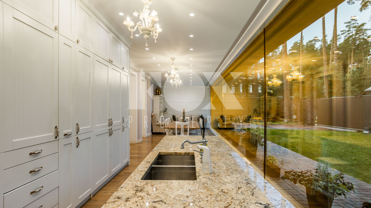 Дом площадью 550 м², расположен на участке 15 соток. Просторные комнаты, качественная отделка, большая гостиная для проведения времени с семьей и друзьями. В доме 5 спален, блок для персонала в цоколе, кабинет и большая кухня с панорамными окнами и выходом на летнюю террасу, где оборудована зона барбекю. Идеальное место для семейных ужинов, дружеских посиделок и праздников на открытом воздухе.
