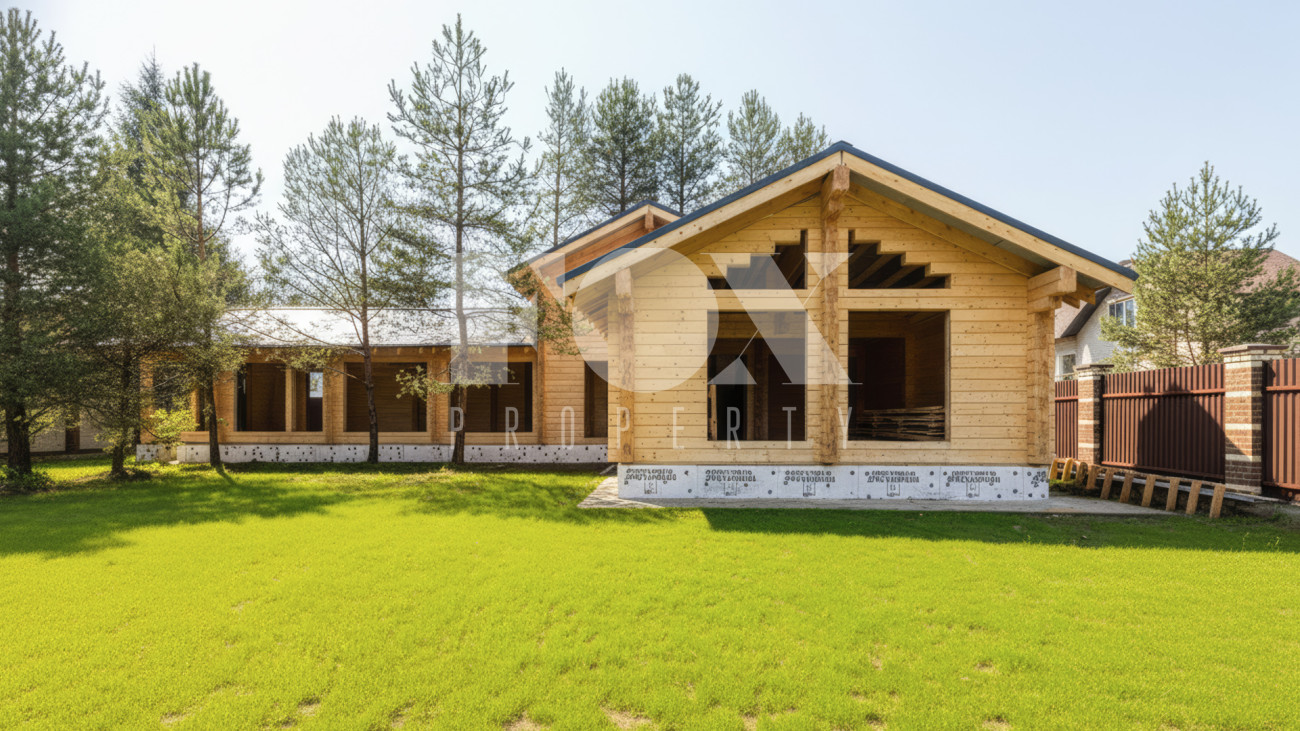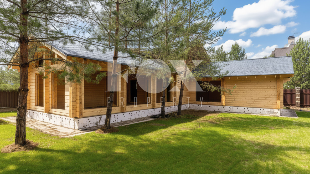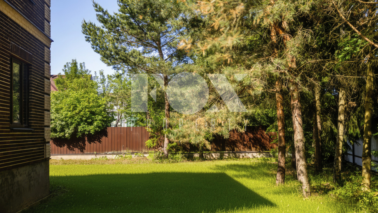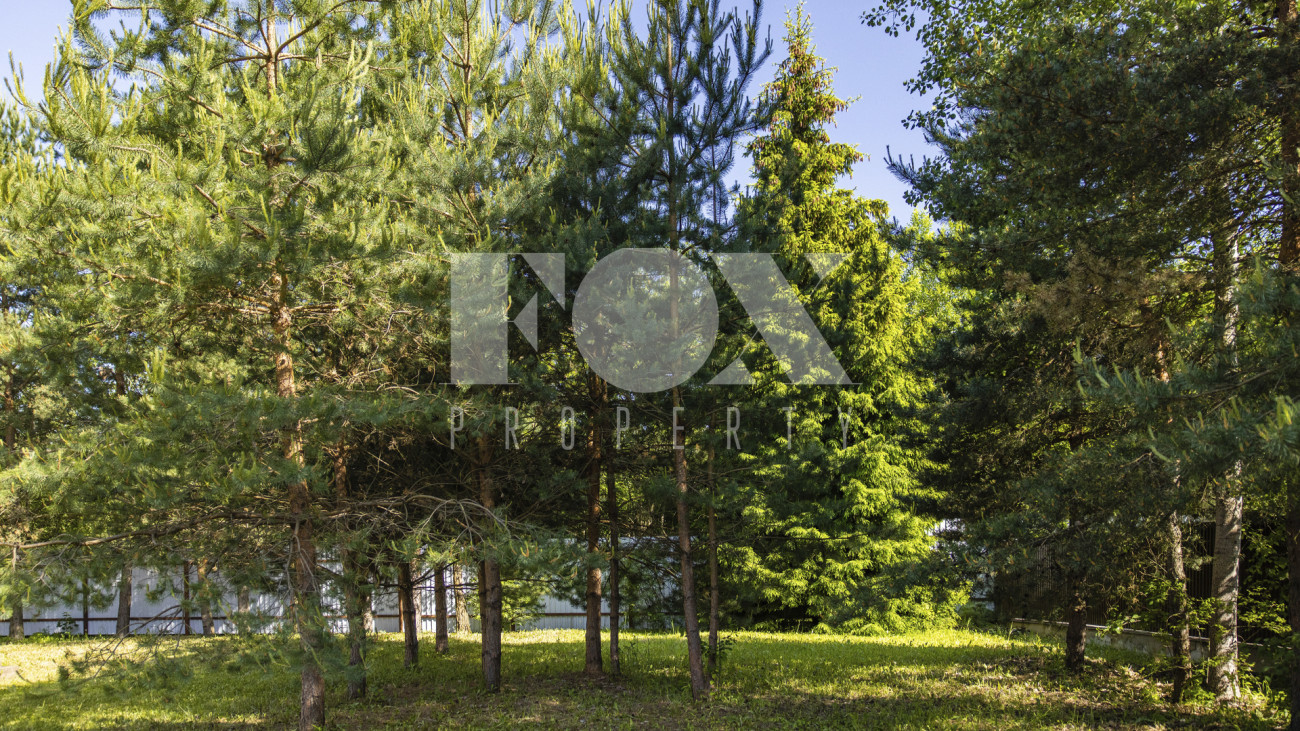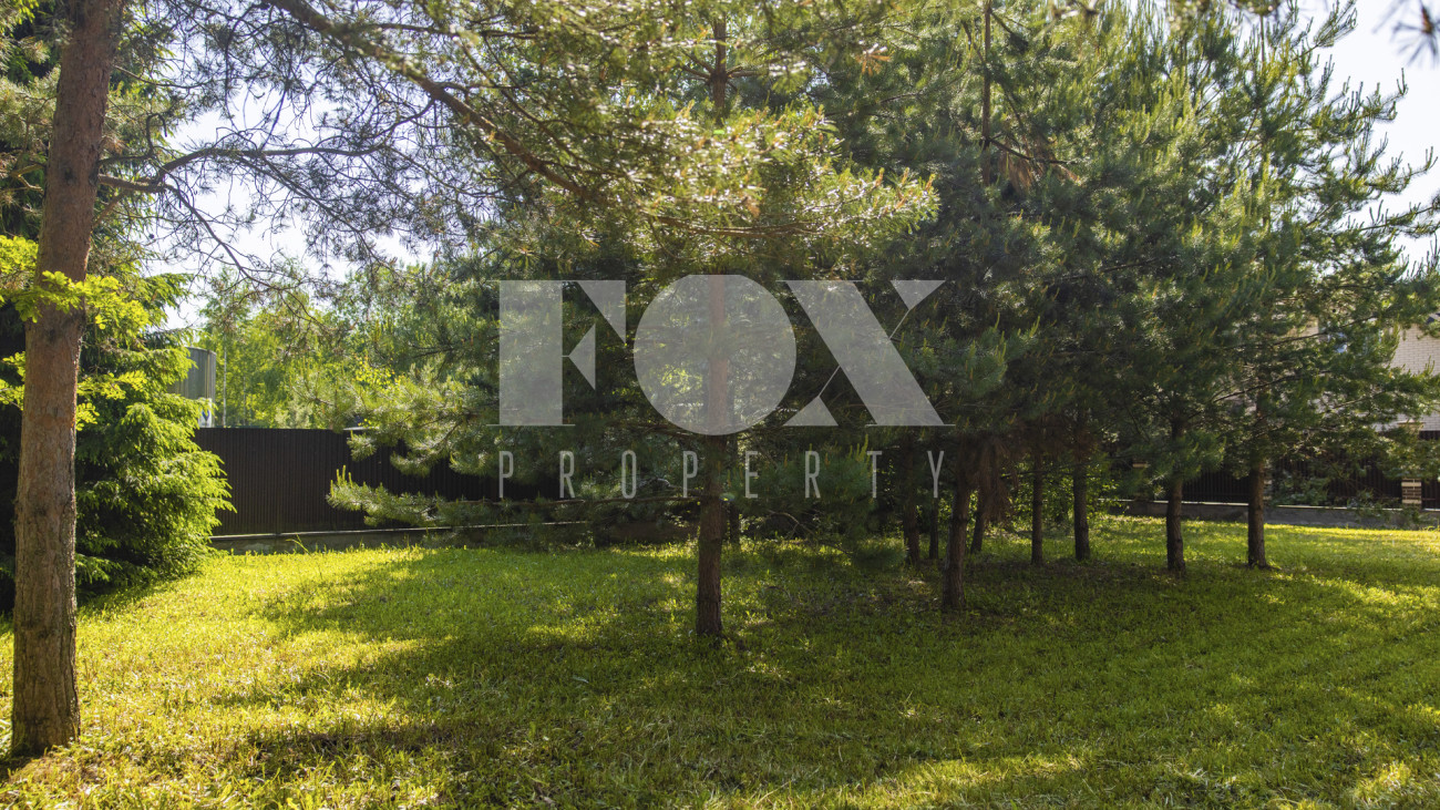Планировкой резиденции предусмотрены четыре спальни, просторная гостиная, переходящая в зону кухни-столовой, кабинет. В контуре дома расположен гараж на две машины. На участке растут хвойные деревья.
