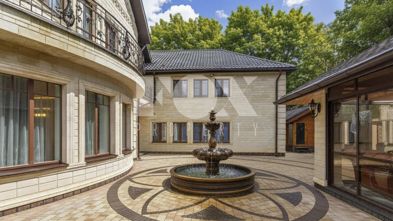 Загородный коттедж площадью 583 м² расположен на участке 16 соток рядом с живописным лесом. Проект дома создан известным архитектурным бюро, и его элегантный неоклассический фасад, облицованный светлым камнем и мрамором, украшают рустовка, монолитные колонны и изящные кованые элементы.