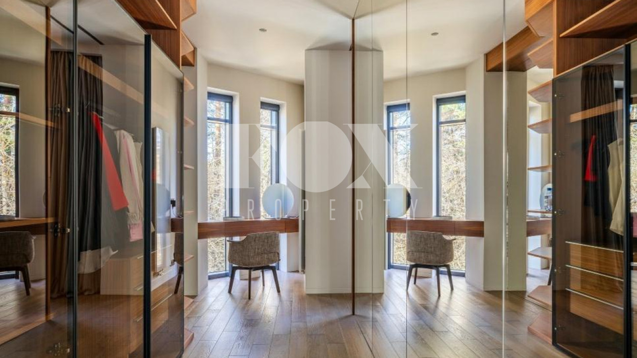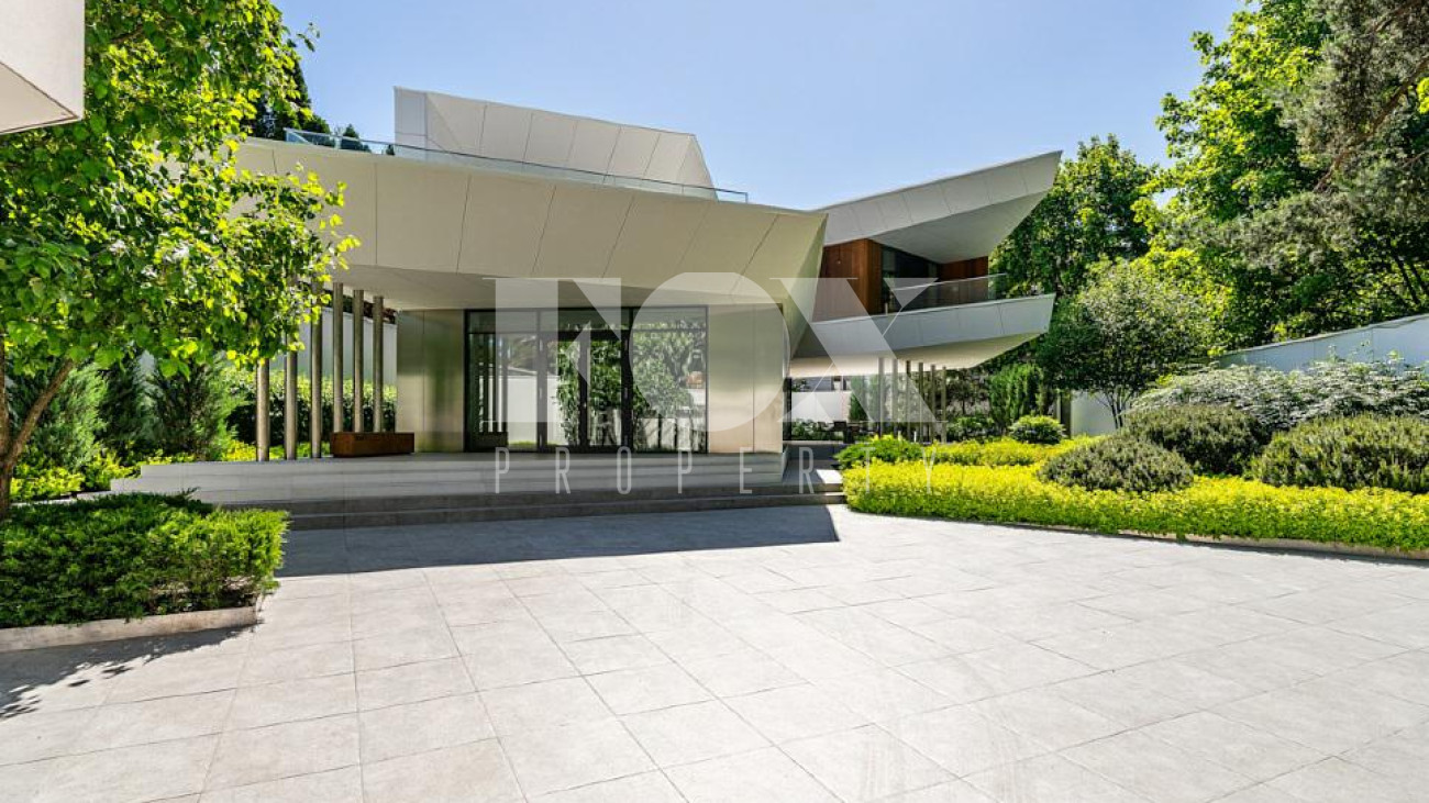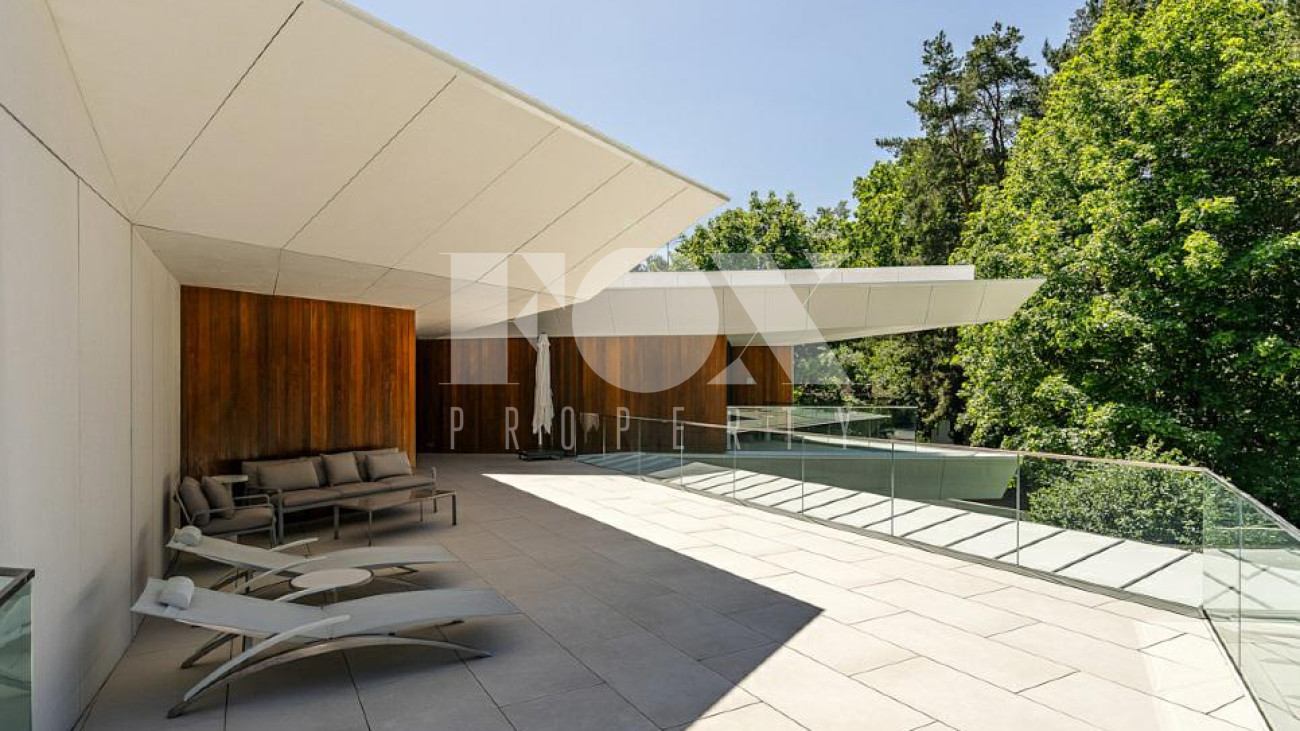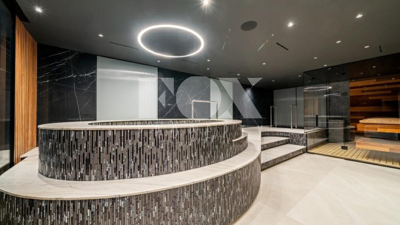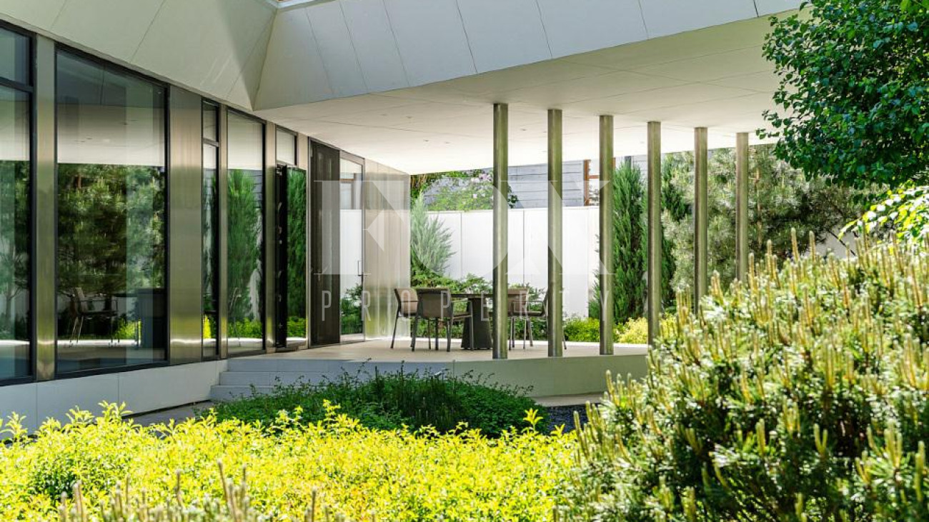 Легкость конструкции и утонченная архитектура этого дома делают его поистине впечатляющим. Несущие столбы из нержавеющей стали и четкая геометрия здания создают ощущение, будто дом парит в воздухе. Гостиная с двусторонним паровым камином и панорамными видами, кухня- столовая с выходом на террасу, четыре спальни, кабинет и спа-зона с сауной, хаммамом, джакузи и купелью — всё это создает функциональную атмосферу гармонии.