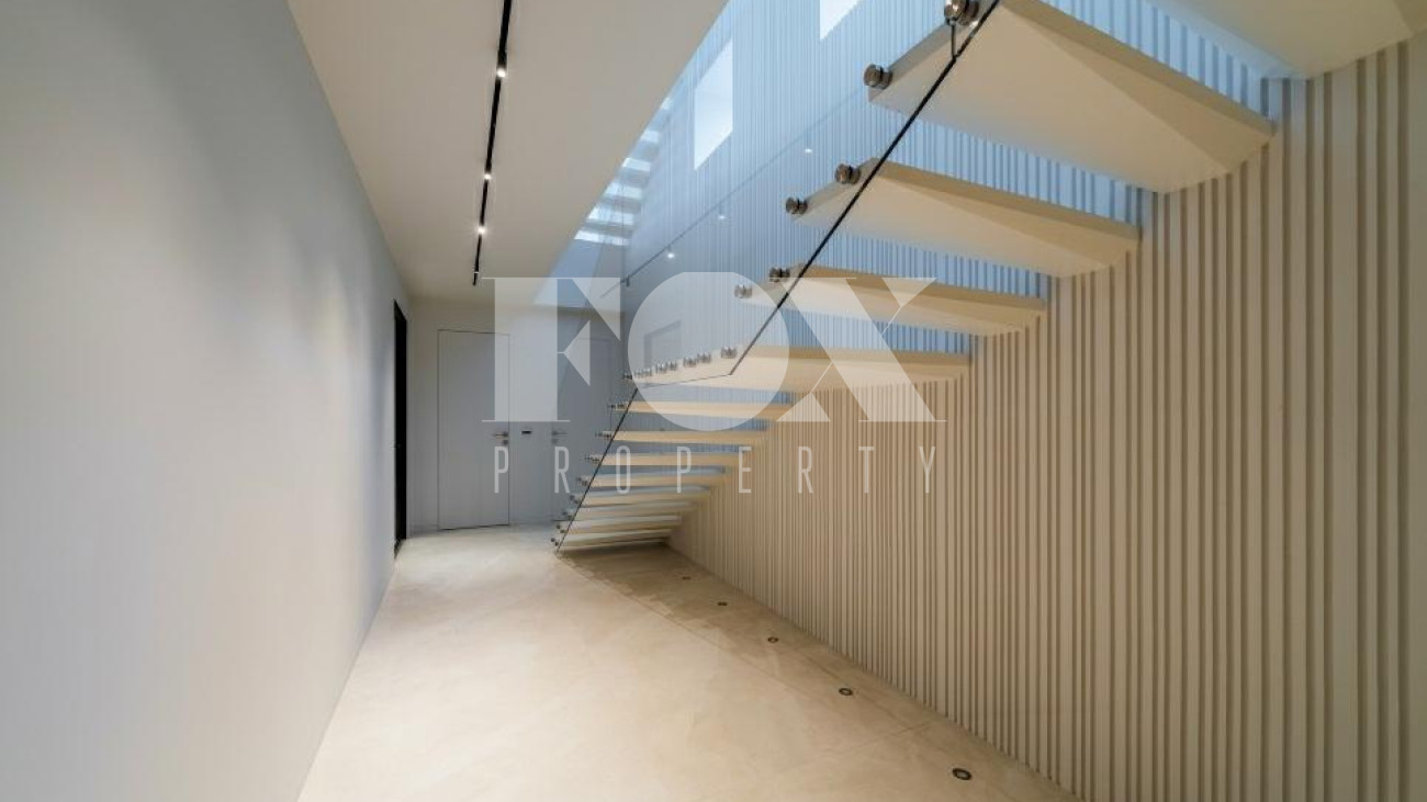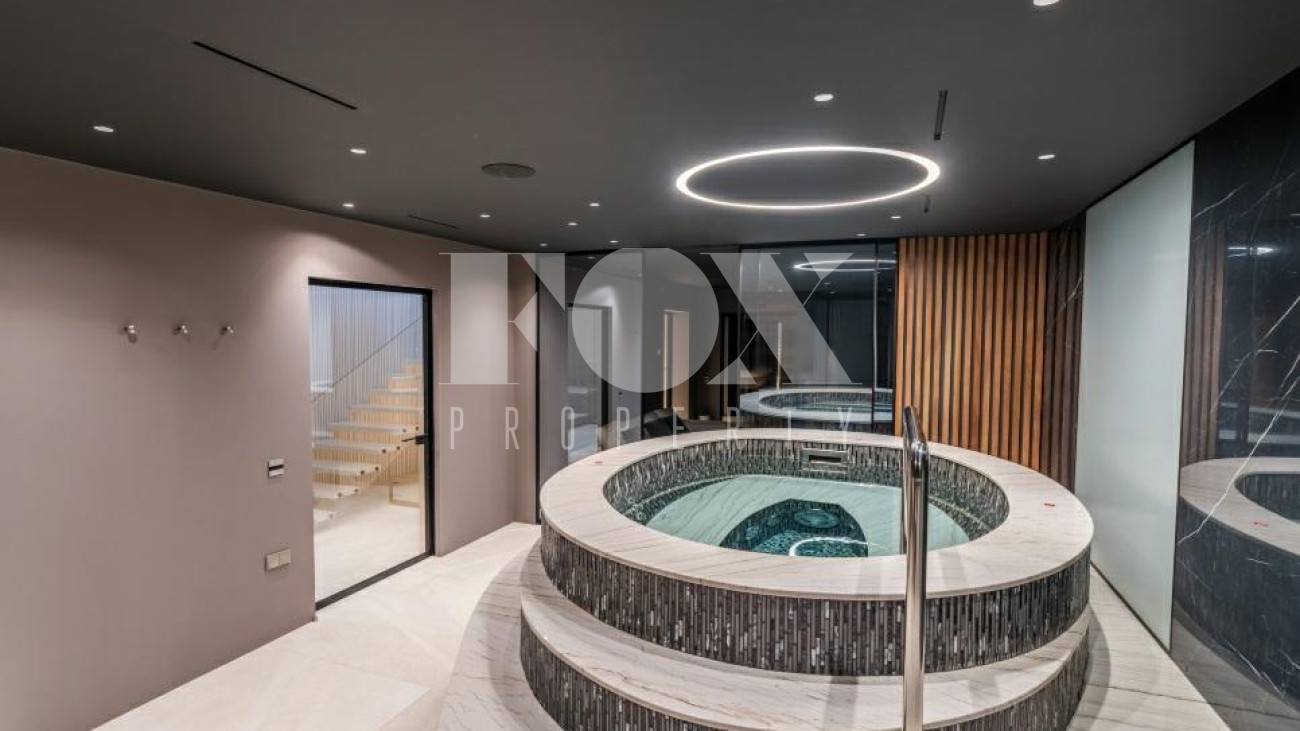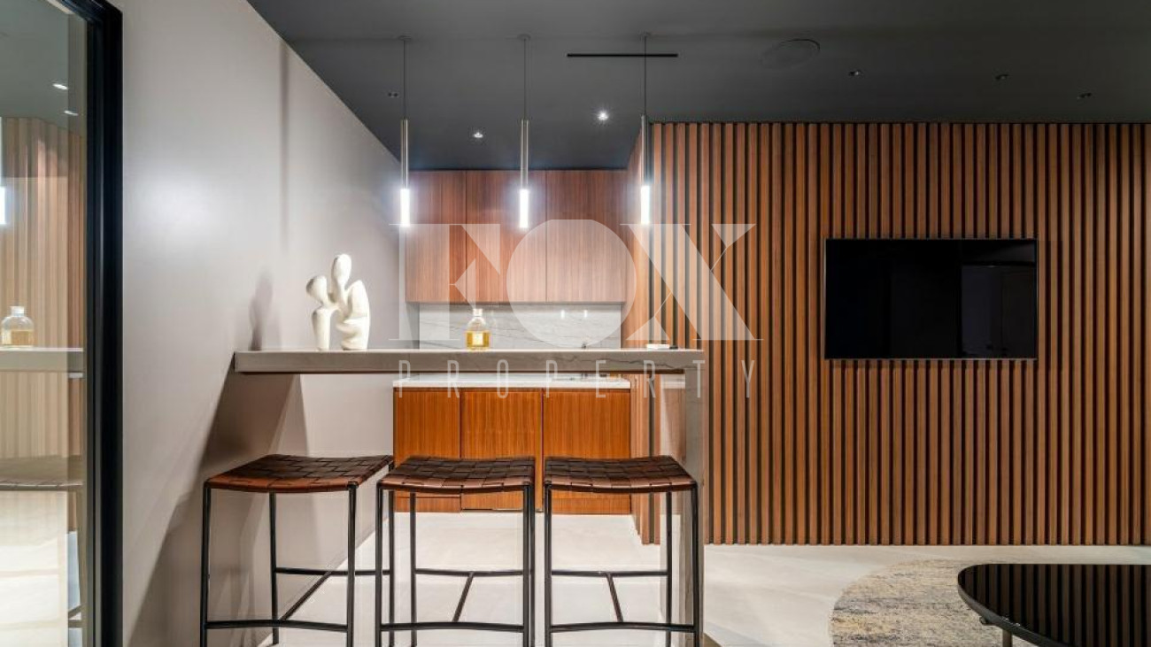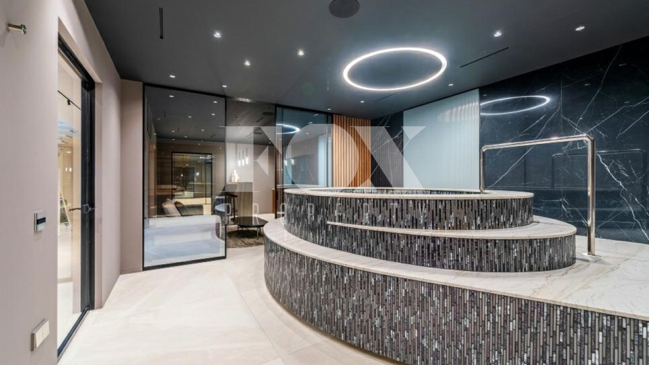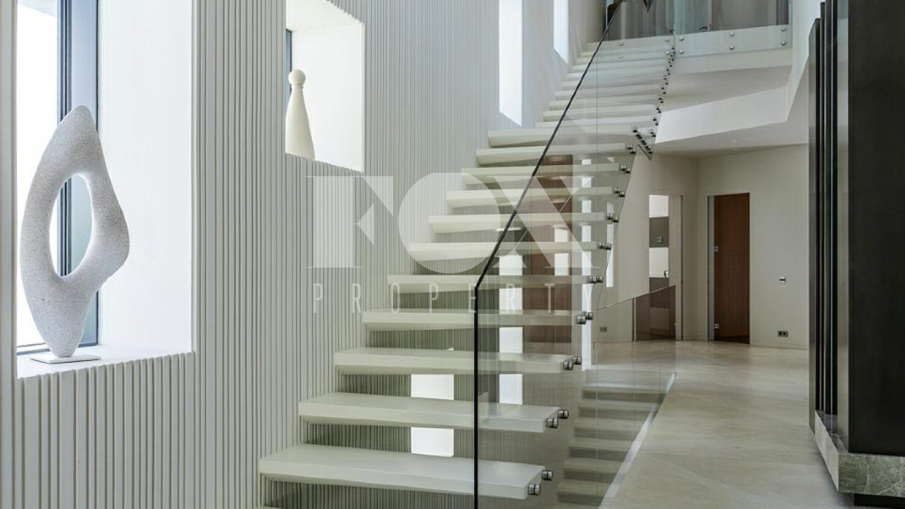 Легкость конструкции и утонченная архитектура этого дома делают его поистине впечатляющим. Несущие столбы из нержавеющей стали и четкая геометрия здания создают ощущение, будто дом парит в воздухе. Гостиная с двусторонним паровым камином и панорамными видами, кухня- столовая с выходом на террасу, четыре спальни, кабинет и спа-зона с сауной, хаммамом, джакузи и купелью — всё это создает функциональную атмосферу гармонии.