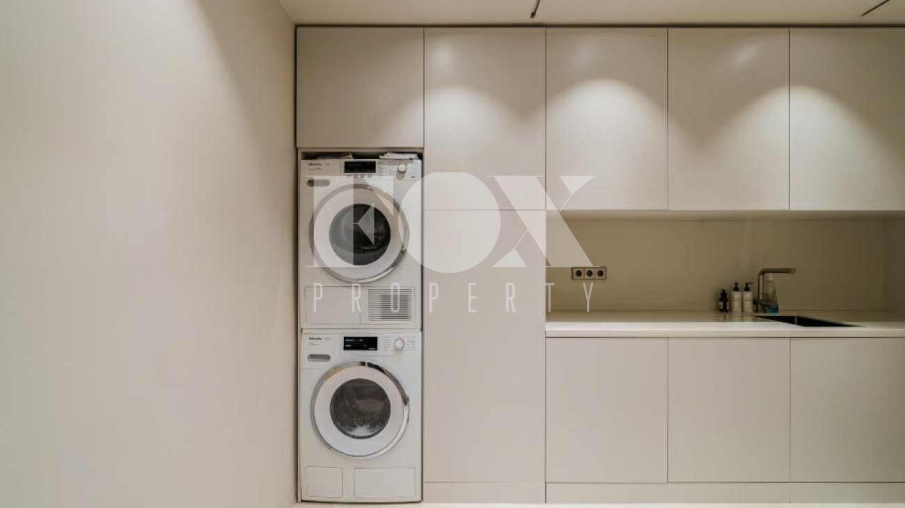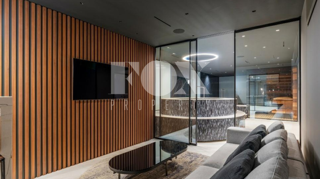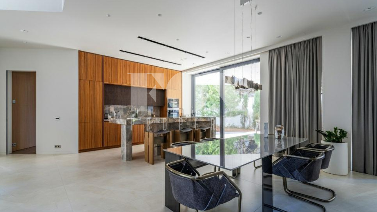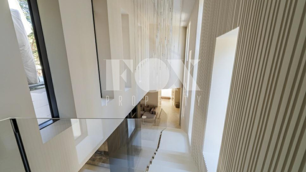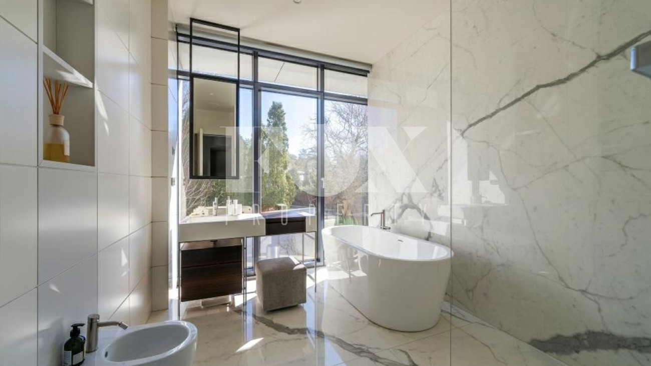 Легкость конструкции и утонченная архитектура этого дома делают его поистине впечатляющим. Несущие столбы из нержавеющей стали и четкая геометрия здания создают ощущение, будто дом парит в воздухе. Гостиная с двусторонним паровым камином и панорамными видами, кухня- столовая с выходом на террасу, четыре спальни, кабинет и спа-зона с сауной, хаммамом, джакузи и купелью — всё это создает функциональную атмосферу гармонии.