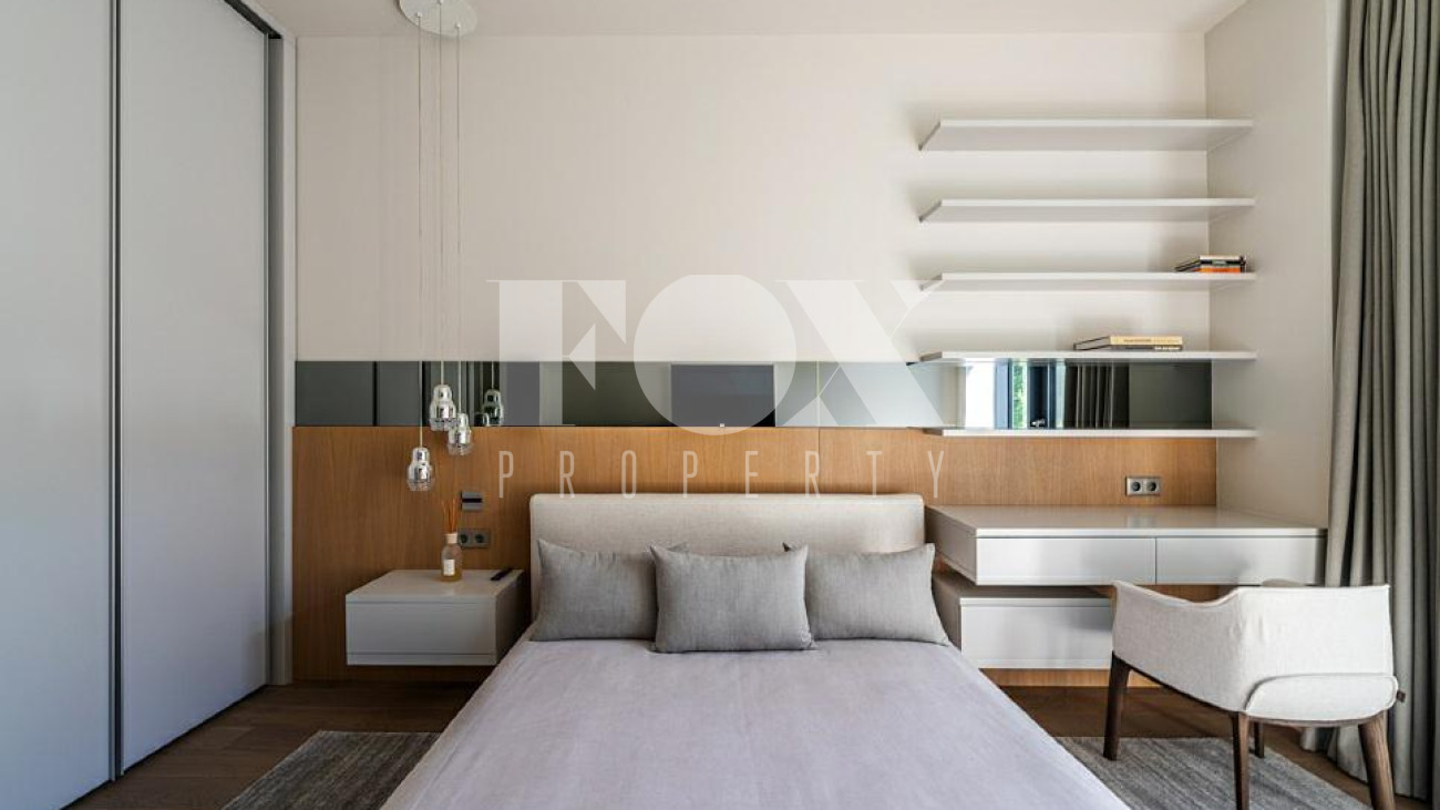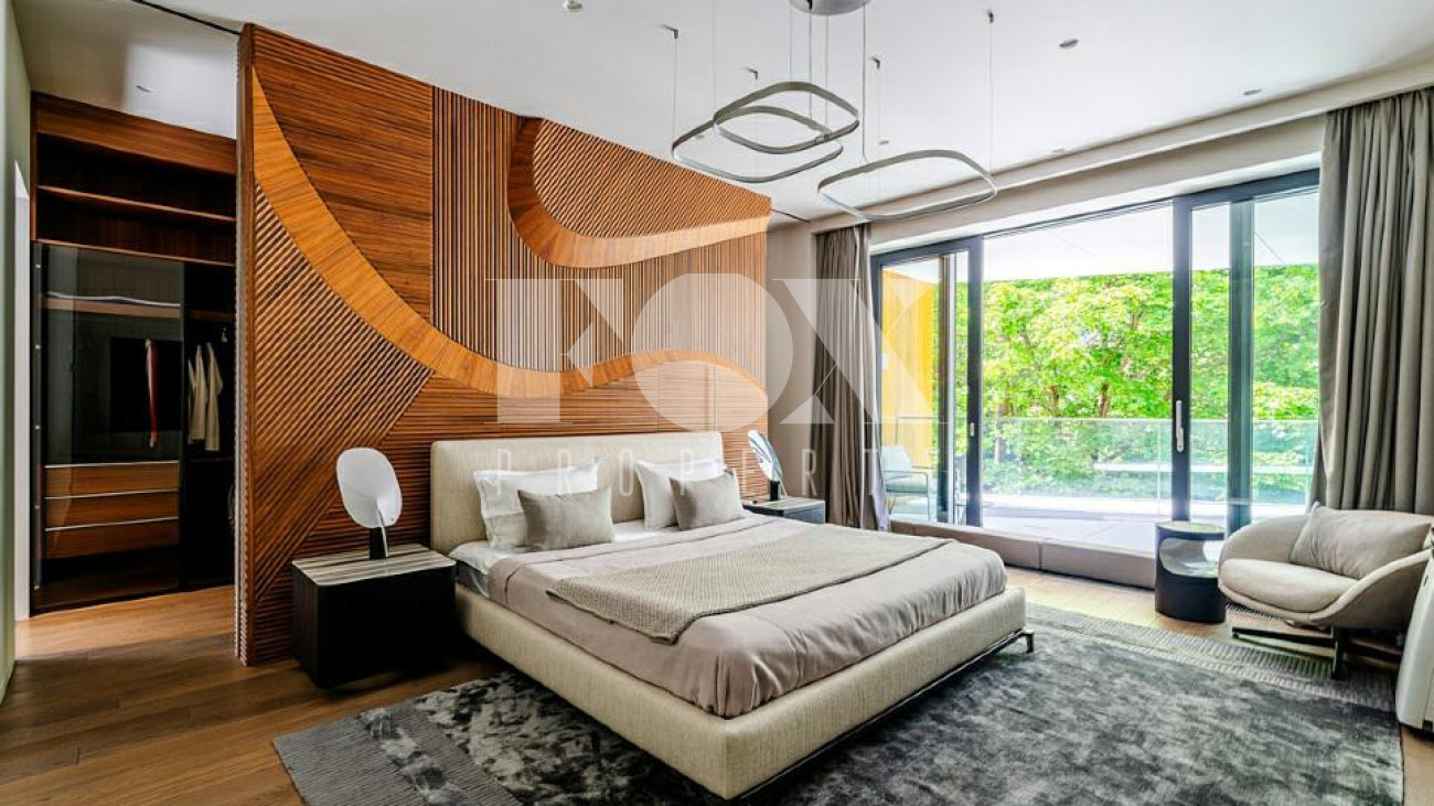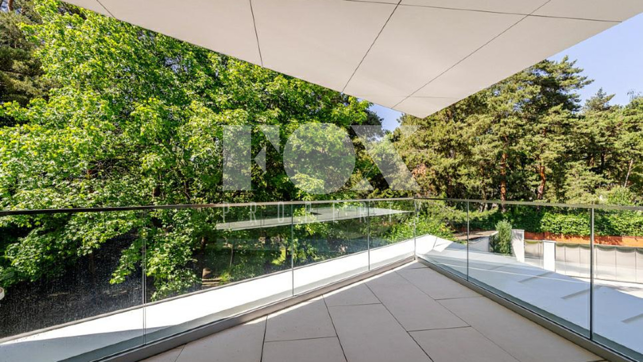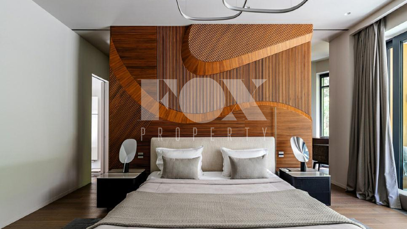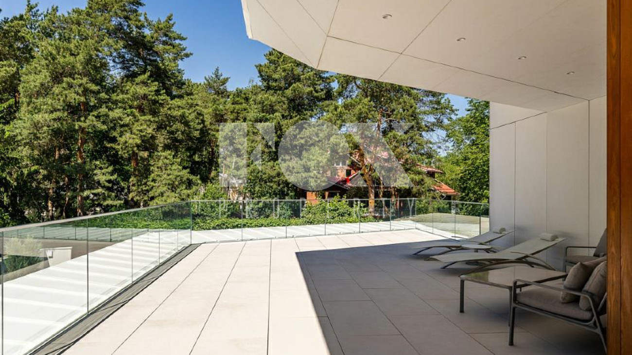 На втором этаже расположена просторная и уединенная терраса, где можно расслабиться и насладиться великолепным видом на кроны деревьев. В главной спальне изголовье кровати украшает панно из массива ореха, которое поддерживает основные мотивы материальности и уюта. Раздвижные оконные конструкции добавляют пространству легкости и открытости.
