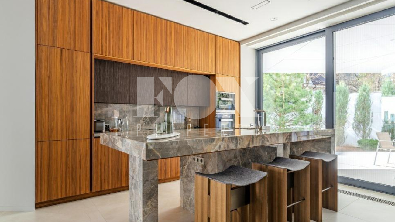 В интерьере использованы натуральные материалы: мрамор Fior Di Bosco, белый кварцит, орех, дуб, термоясень и фиброцементные панели, гармоничное сочетание которых, обеспечивает высокое качество, стиль и надежность.