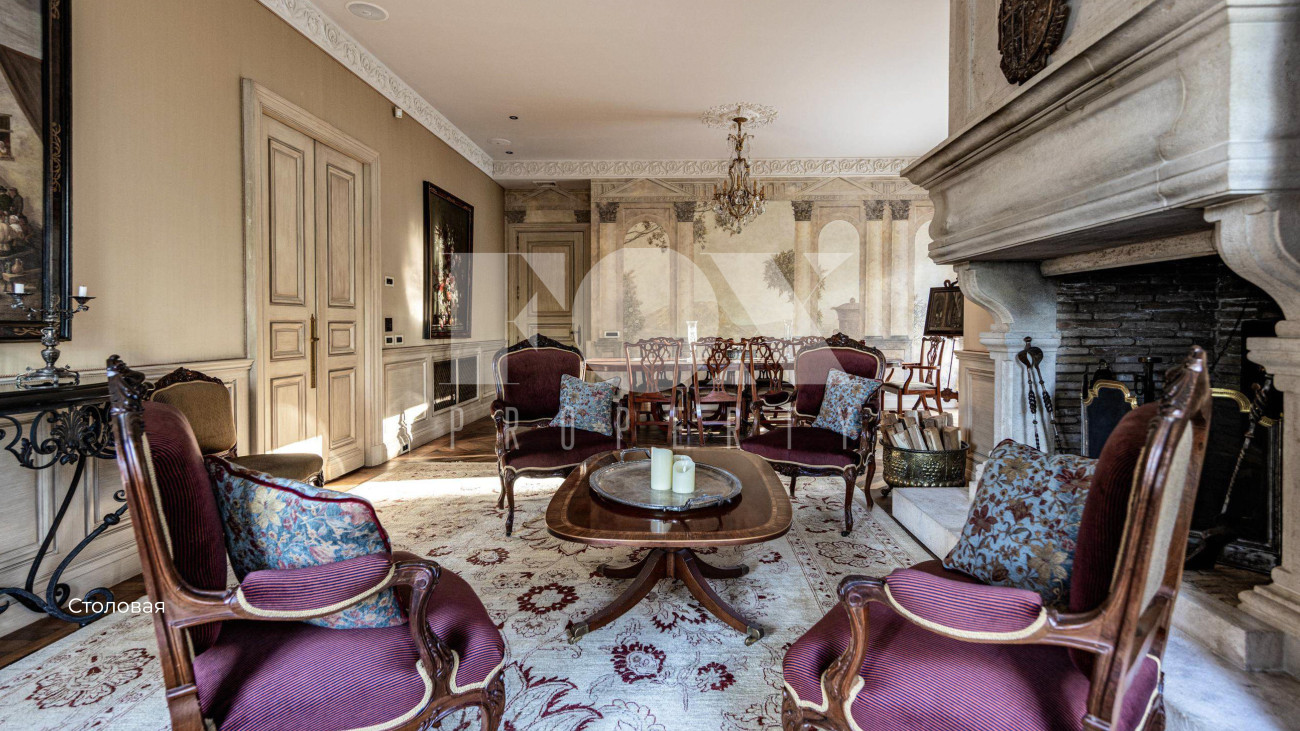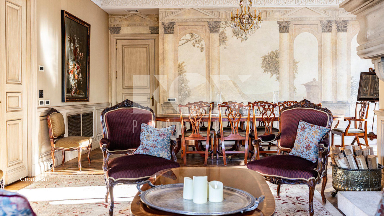 Минеральная колористика стен, антикварные люстры из Парижа, мебель Arthur Brett и Mark Wilkinson — каждая деталь становится частью повествования о вечности и прекрасном. Ощущение непрерывного течения времени проявляется в диалоге между историческими артефактами и современными элементами, создавая живой, дышащий интерьер.